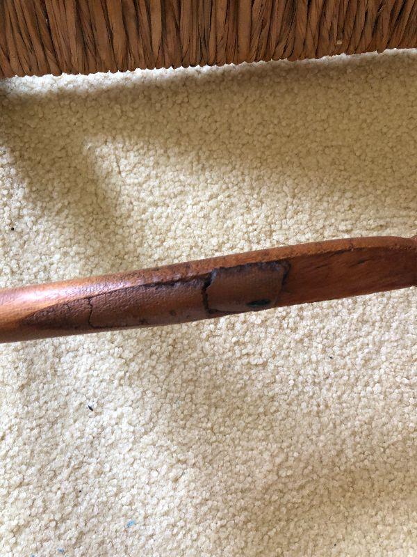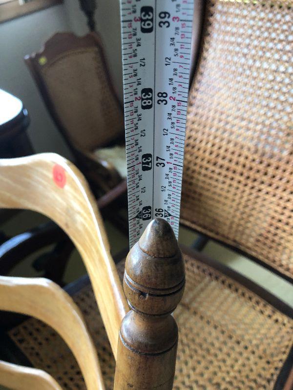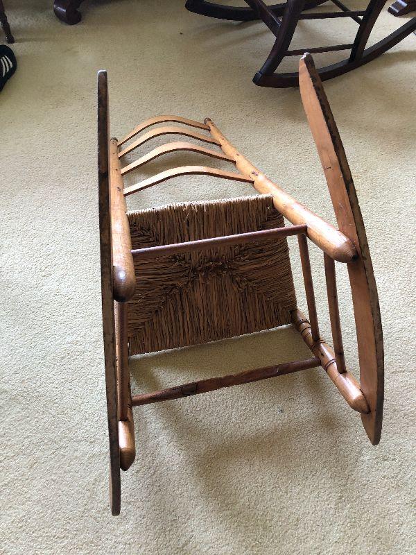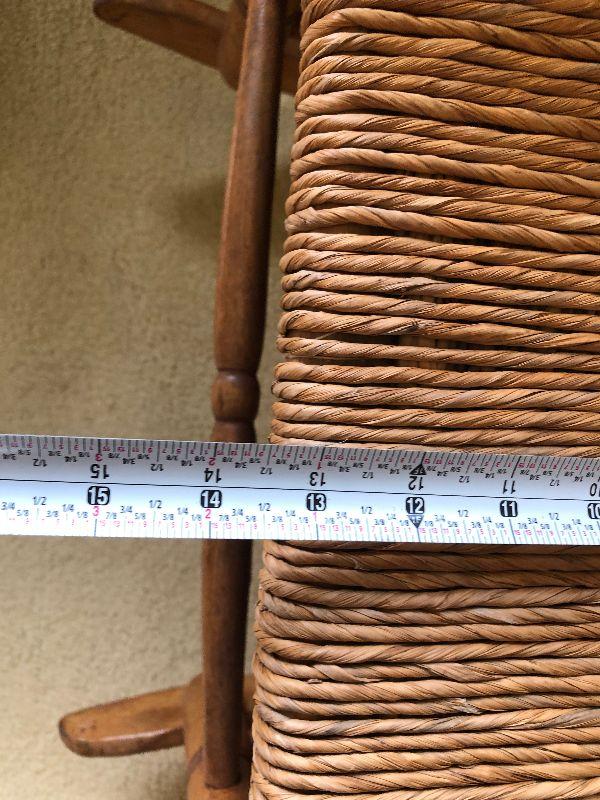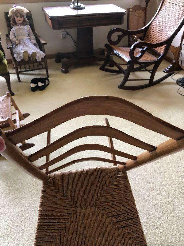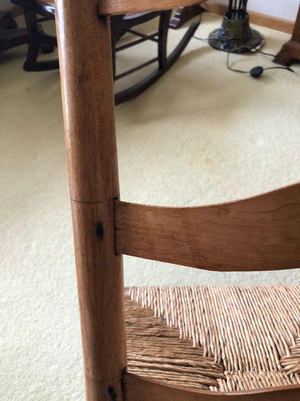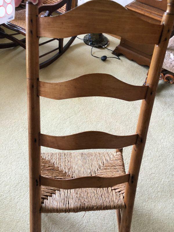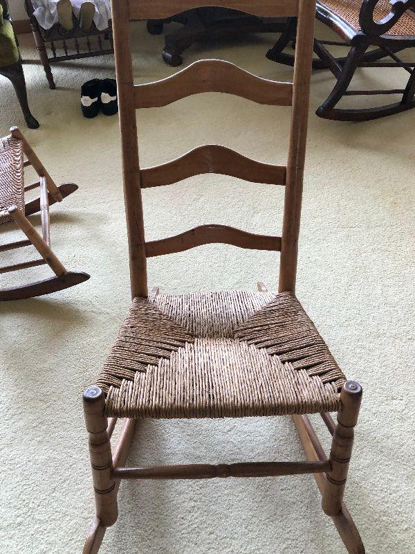 Antique Ladderback rocker. Please see all pictures for contents of the lot, the condition of items in the lot, and measurements of the items if taken. Thank you for looking and have fun bidding.