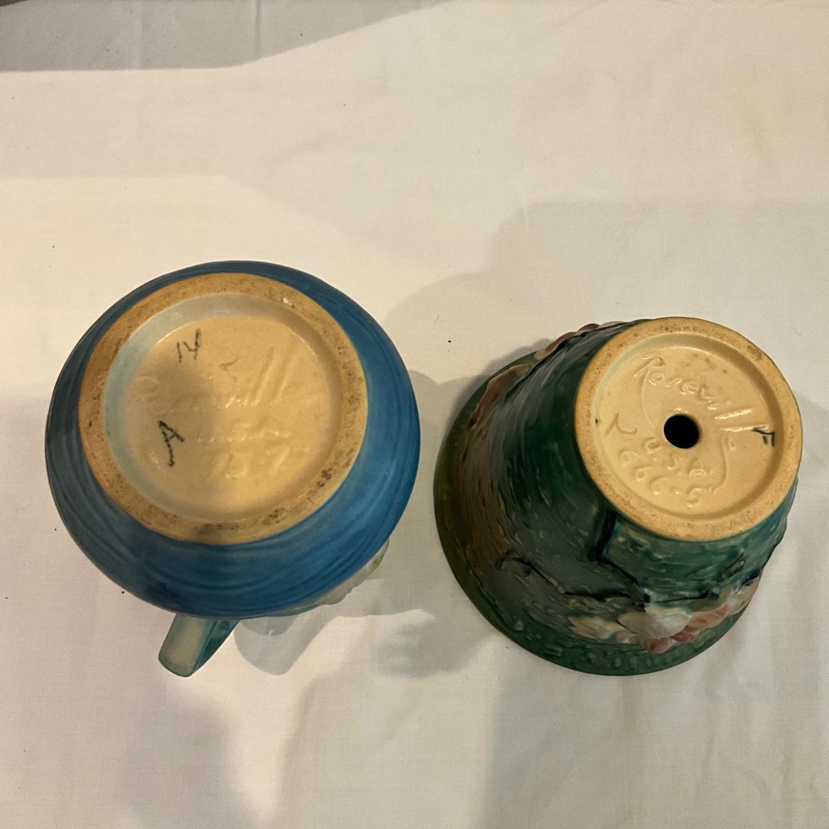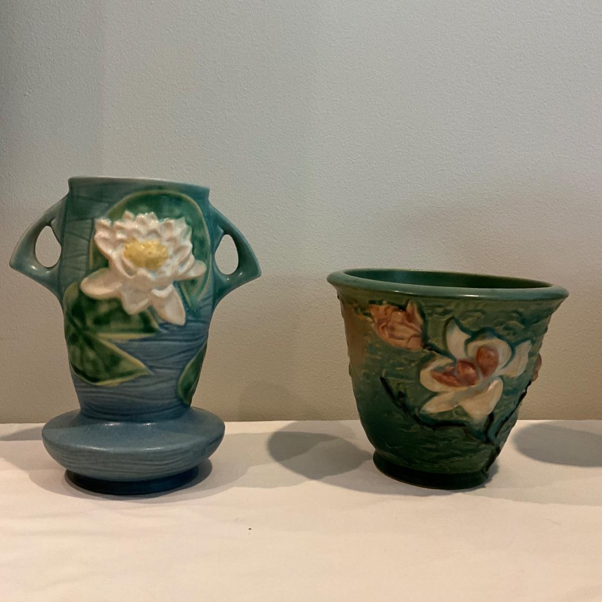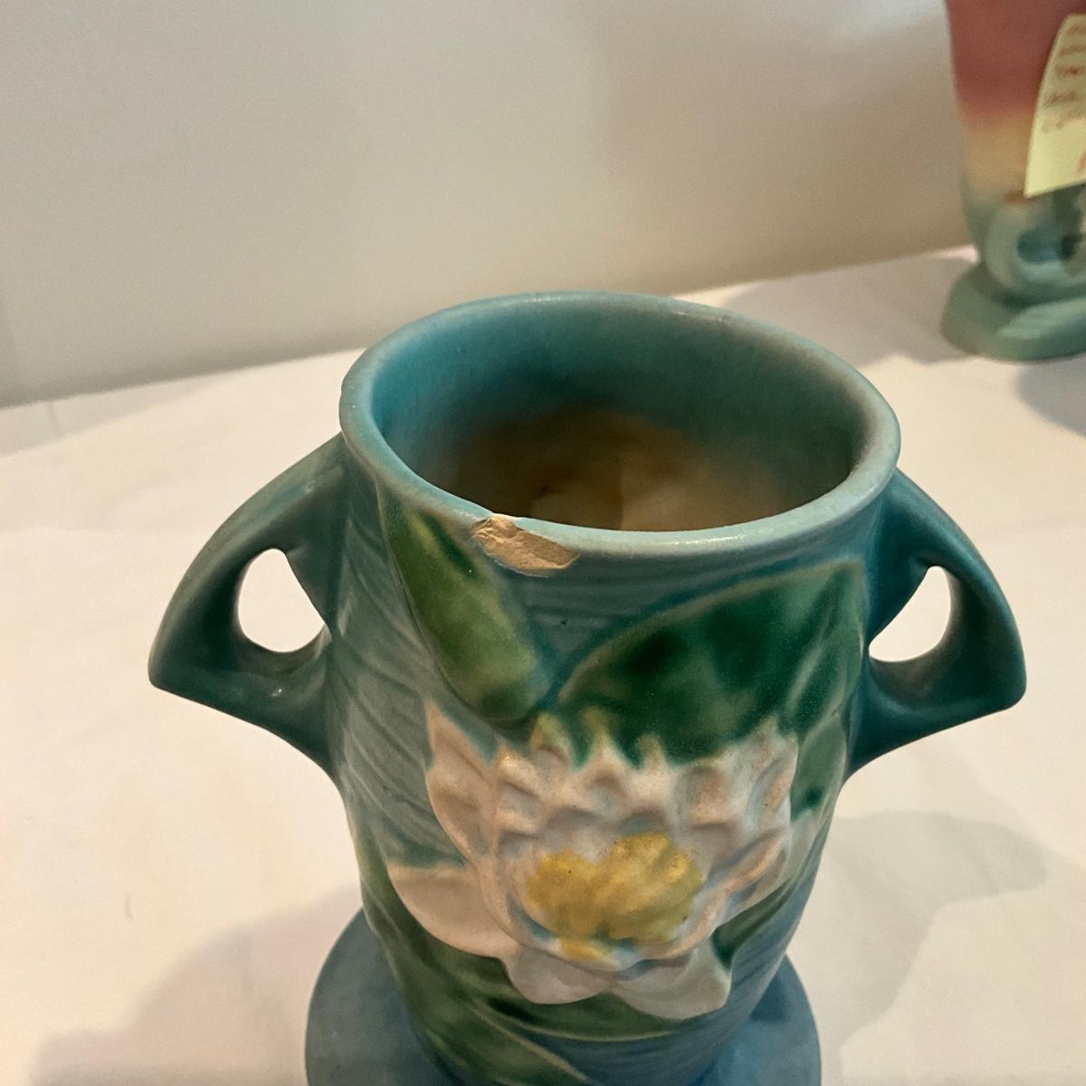 L814 Antique Roseville Pottery Blue Water Lily and Magnolia Flower Pot