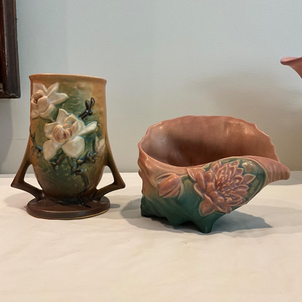 L818 Antique Roseville Water lily Conch Shell and Magnolia Brown Vase