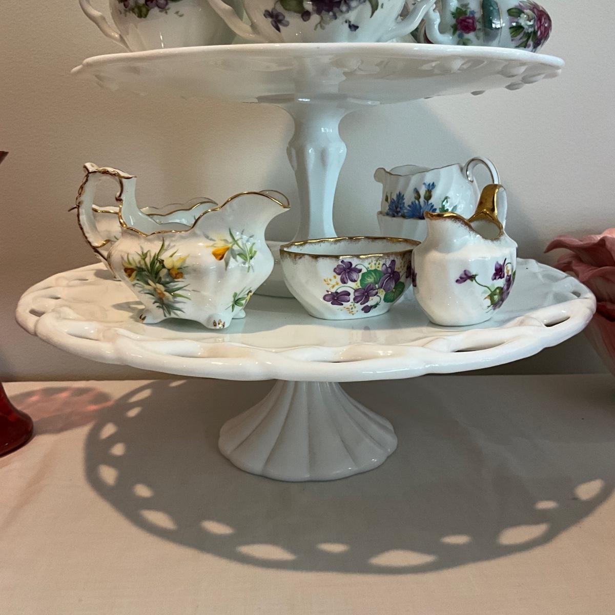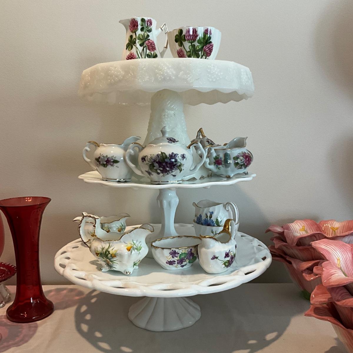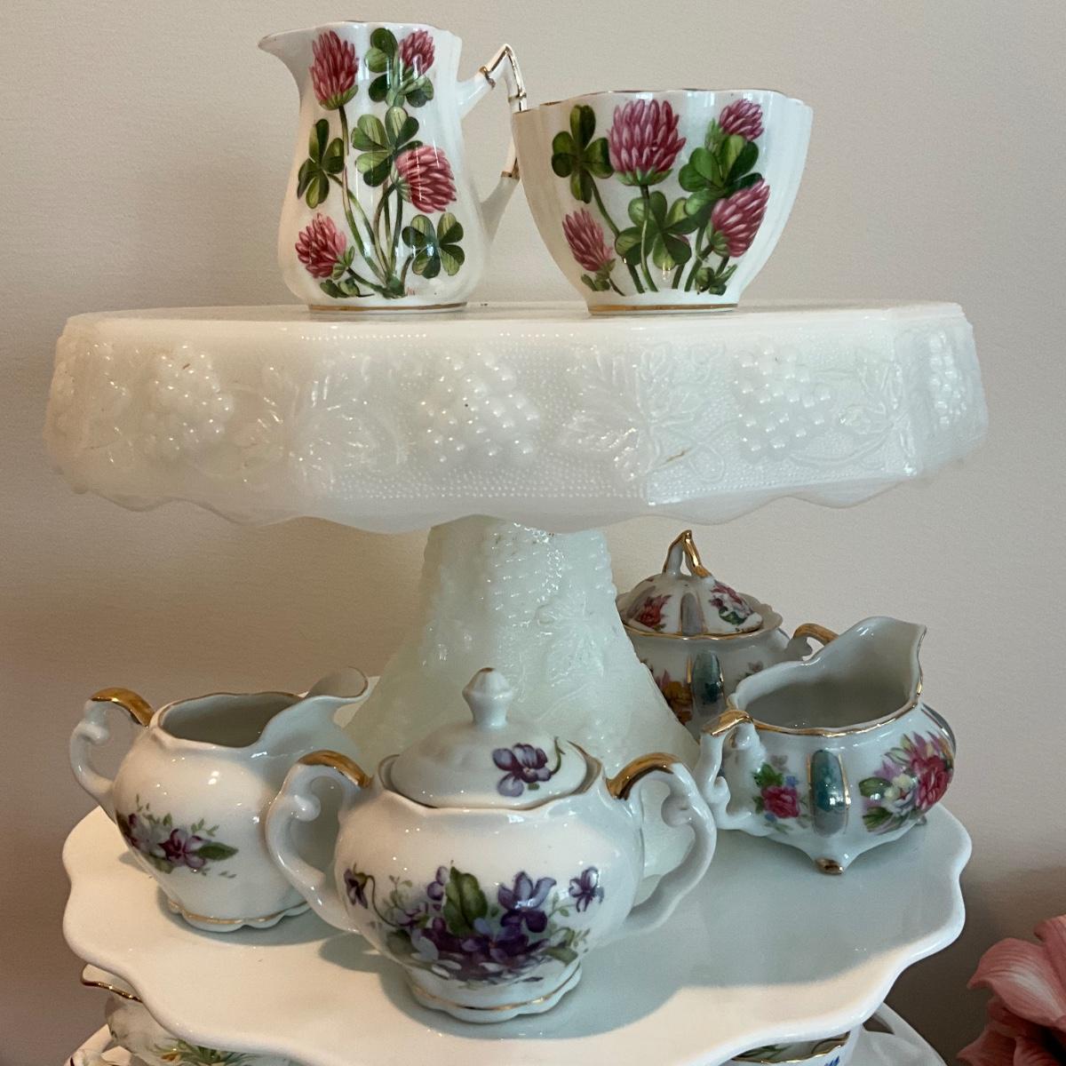 L825 Lot of Three MIlk Glass Pedestal Plates with 6 Sets of Children's Sugar and Creamers