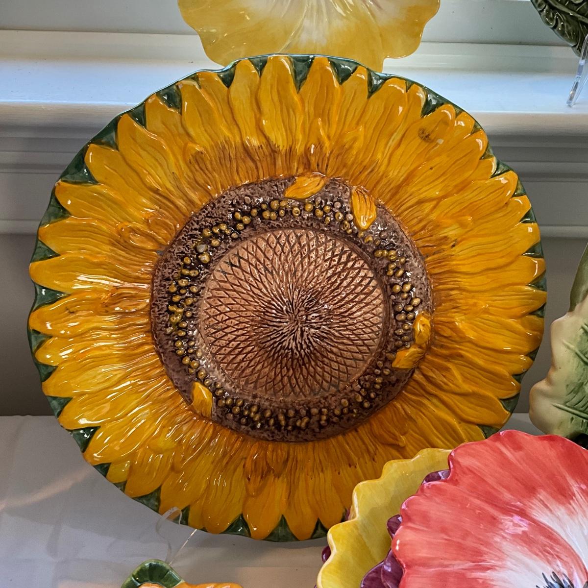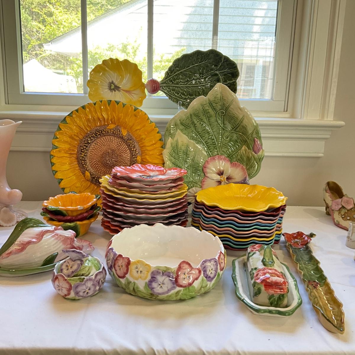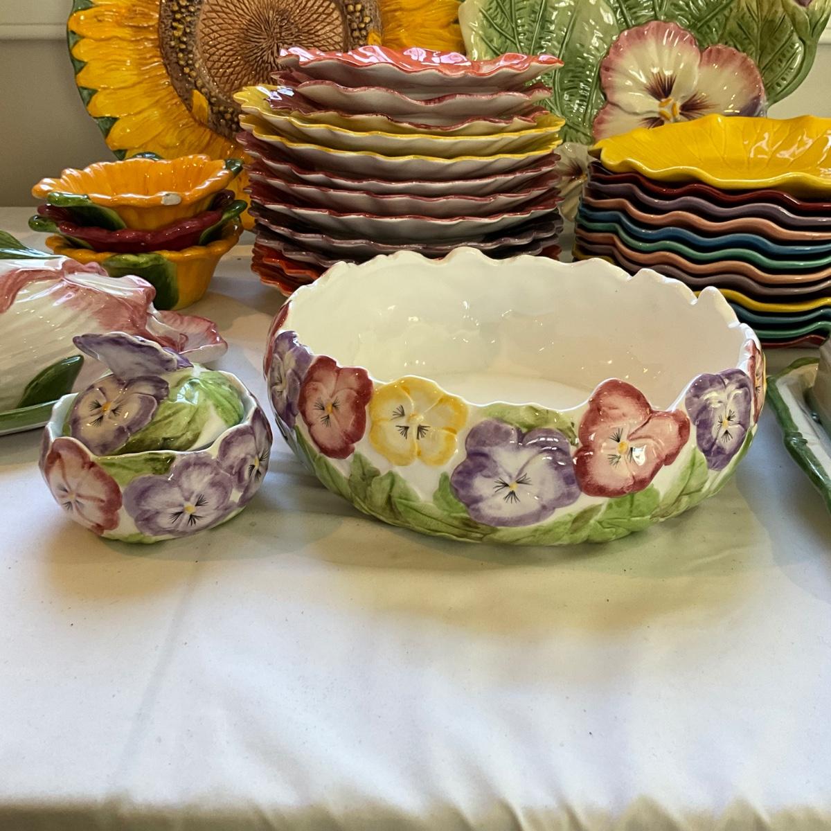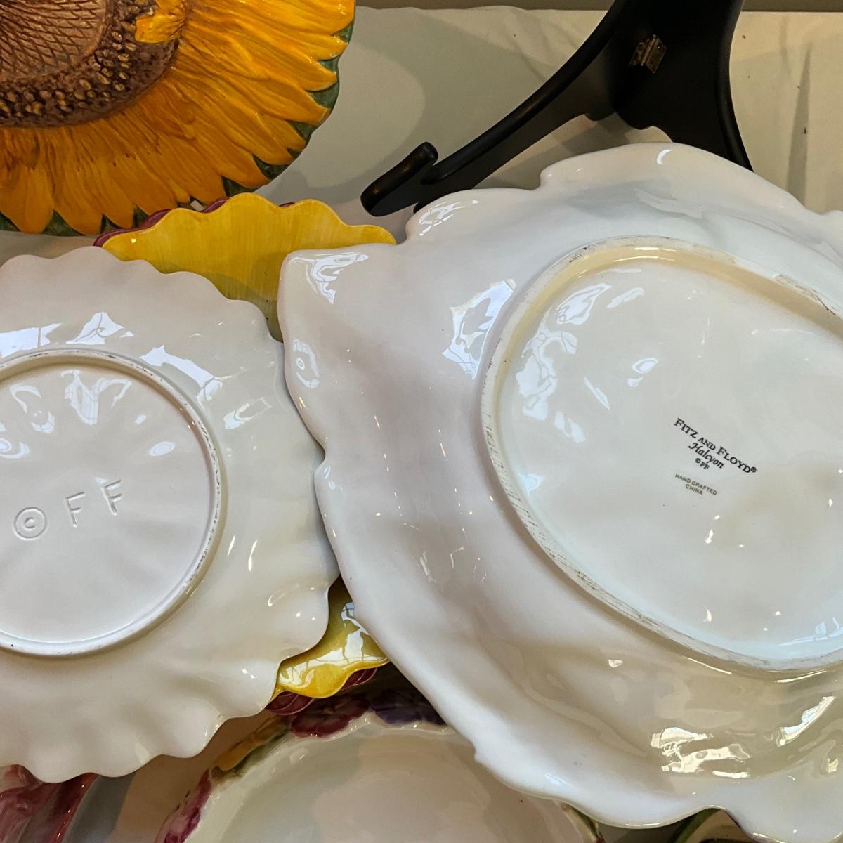 Sunflower is 12" diameter, 2 covered butter dishes, 4 small fitz and floyd pansy plates, and 9 large pansy plates, and large fitz and floyd pansy bowl