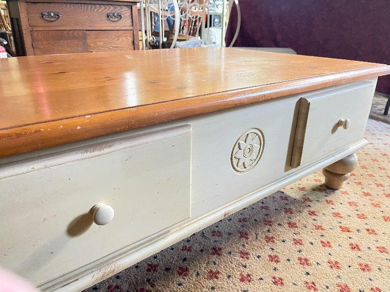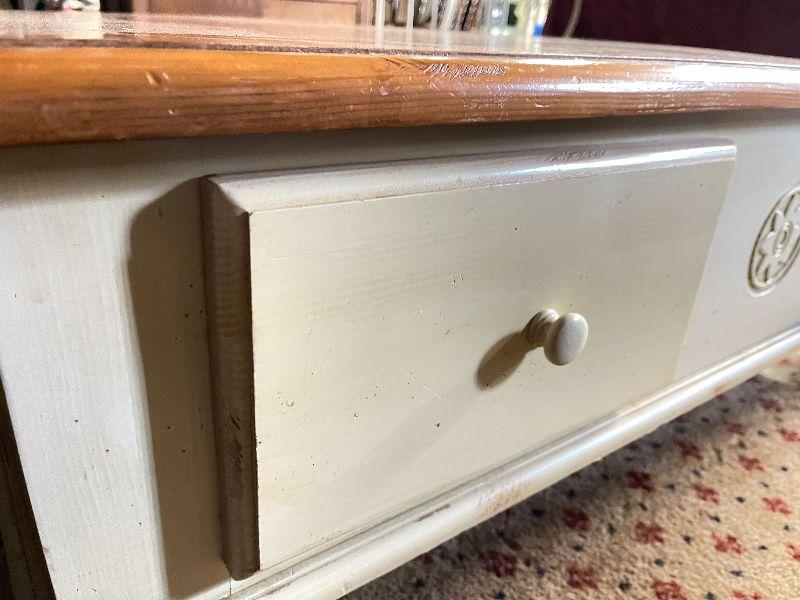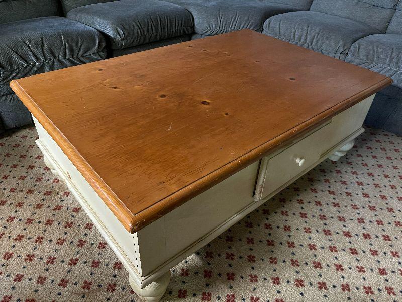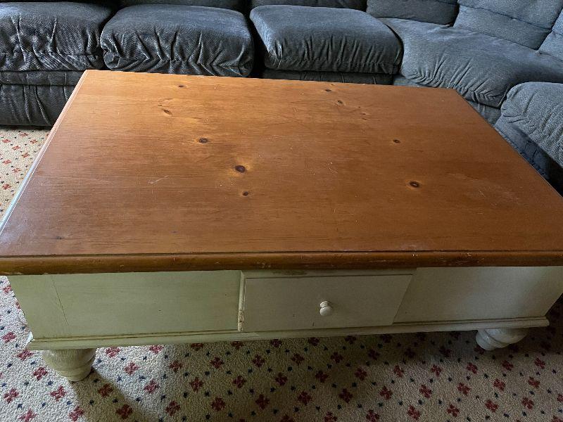 Coffee table with maple top, and storage drawer. Please see pictures for condition and measurements if taken. All items are sold as found and if furniture, you will need to be able to move yourself. Thank you for looking and have fun bidding! As always, thank you for being a Treasure Me Hunter!