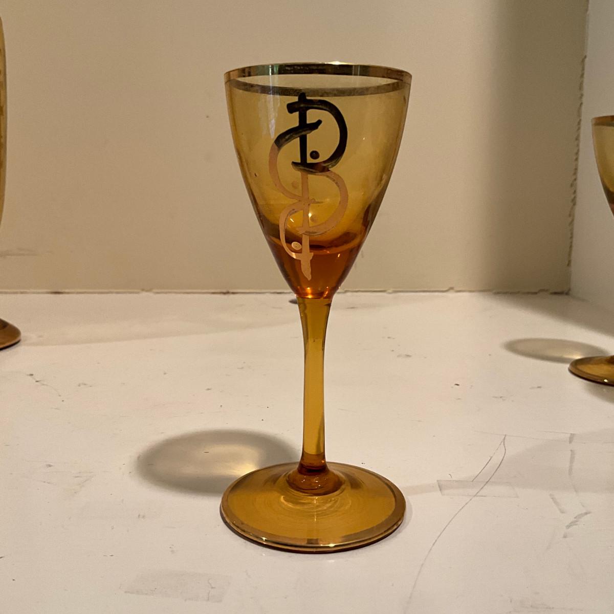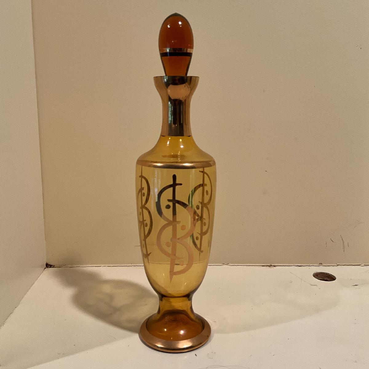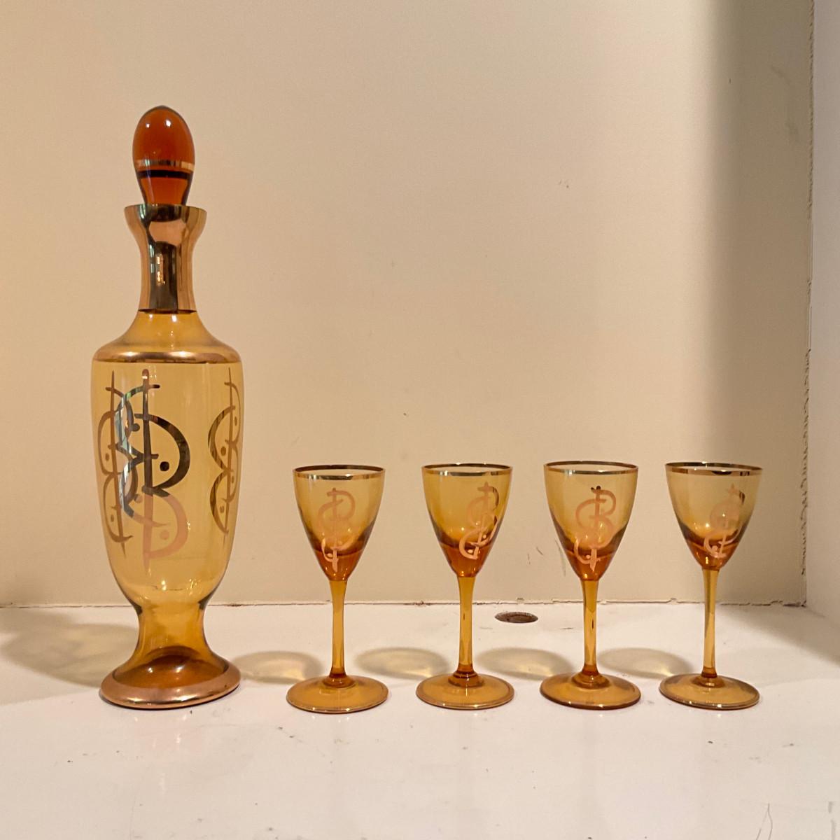 L832 Mid Century Amber Glass Gold Trim Decanter Bottle & Cordial Set