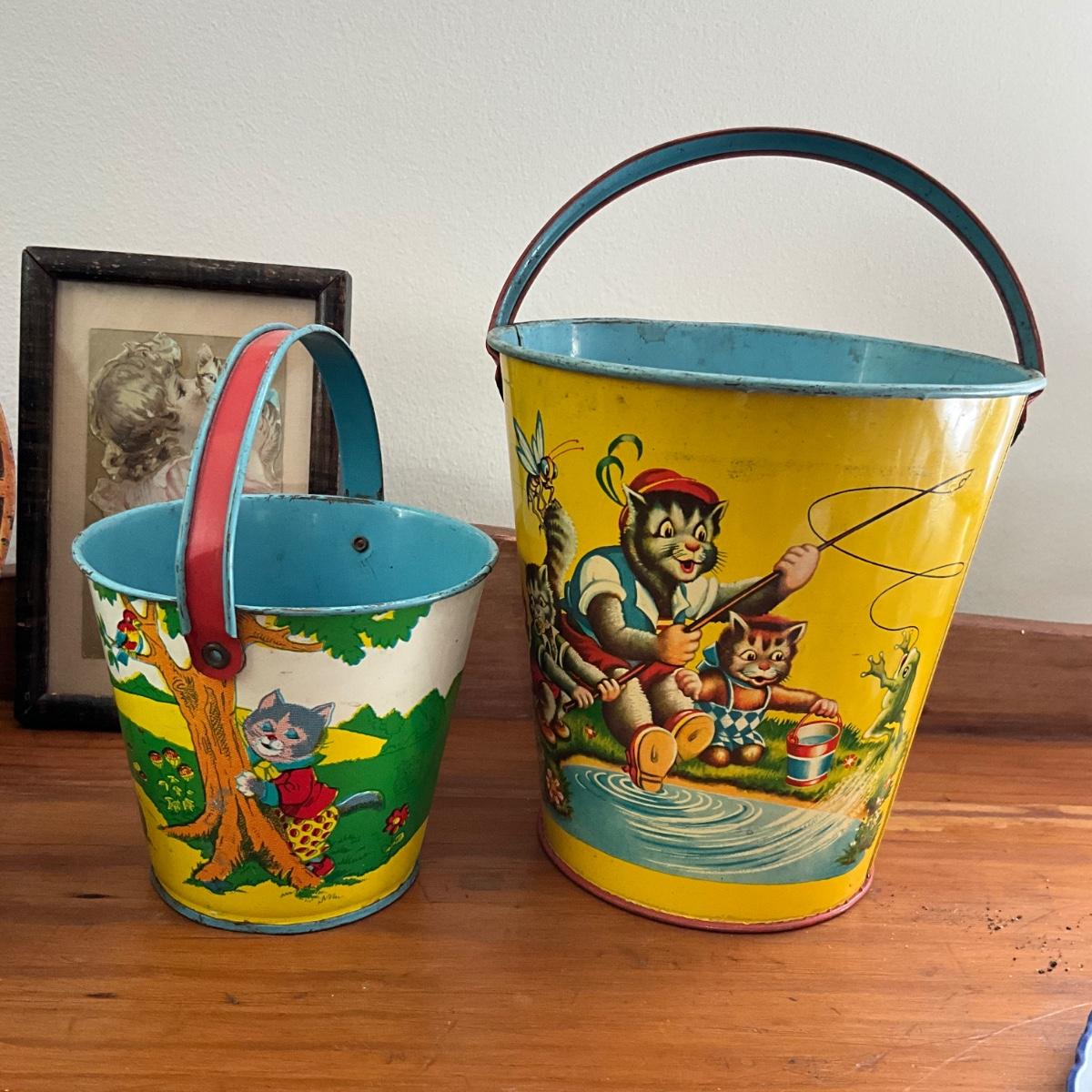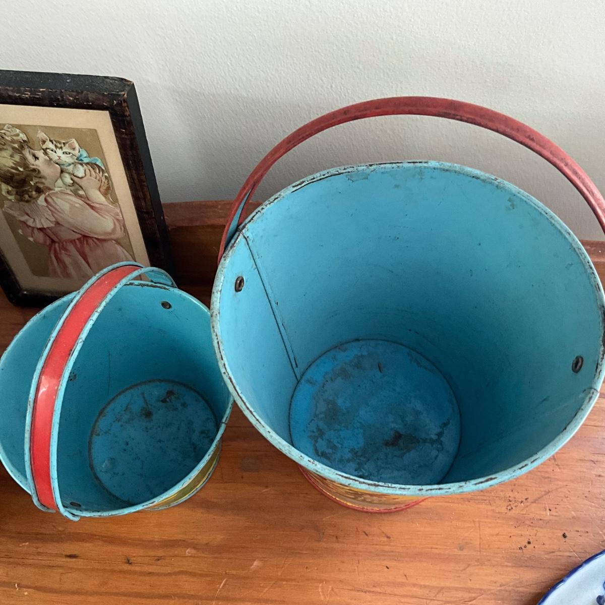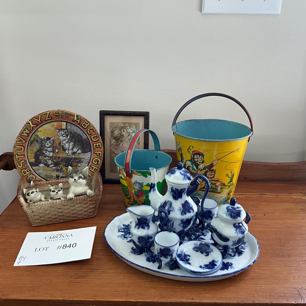 Framed victorian postcard and childs tea set and two ohio art sand pails