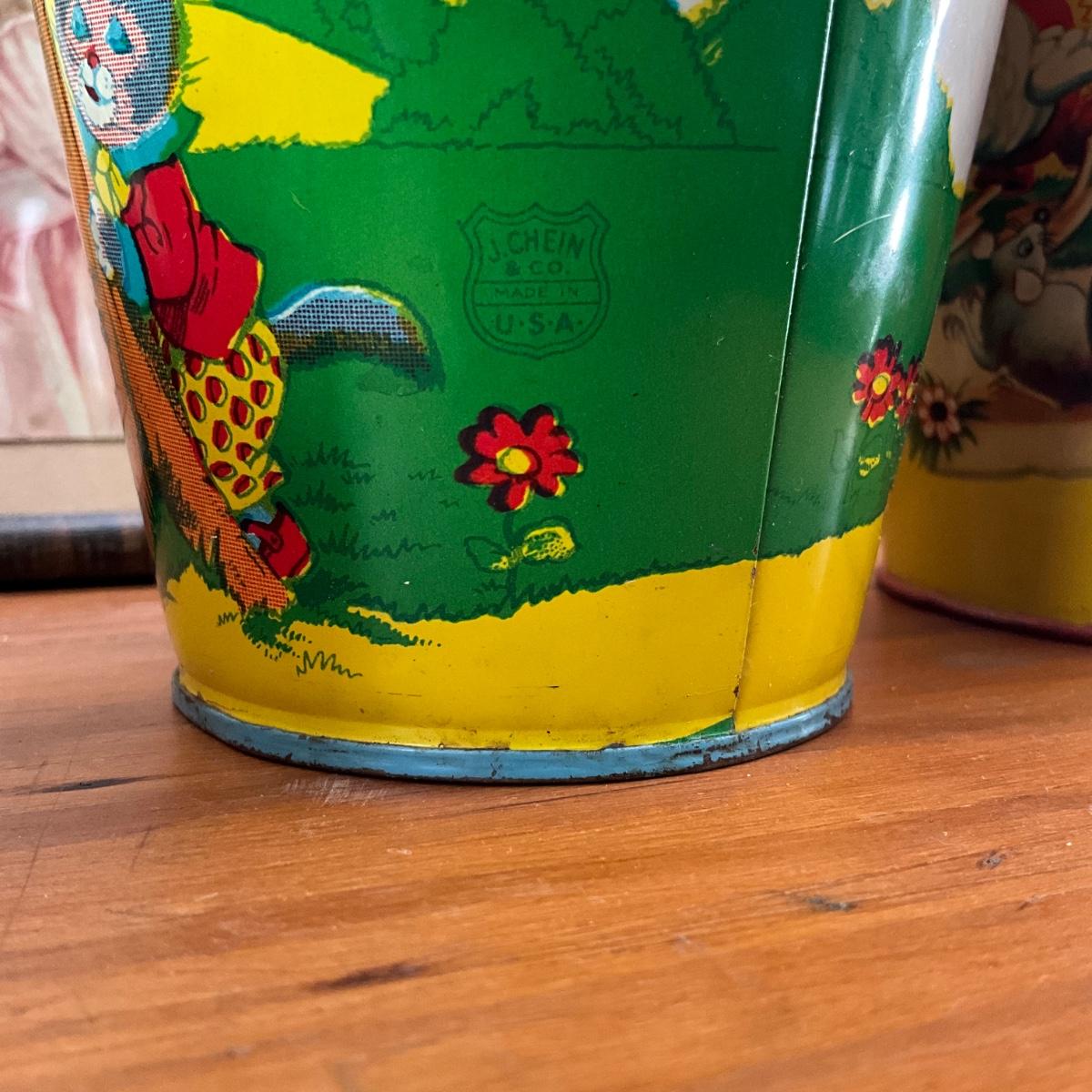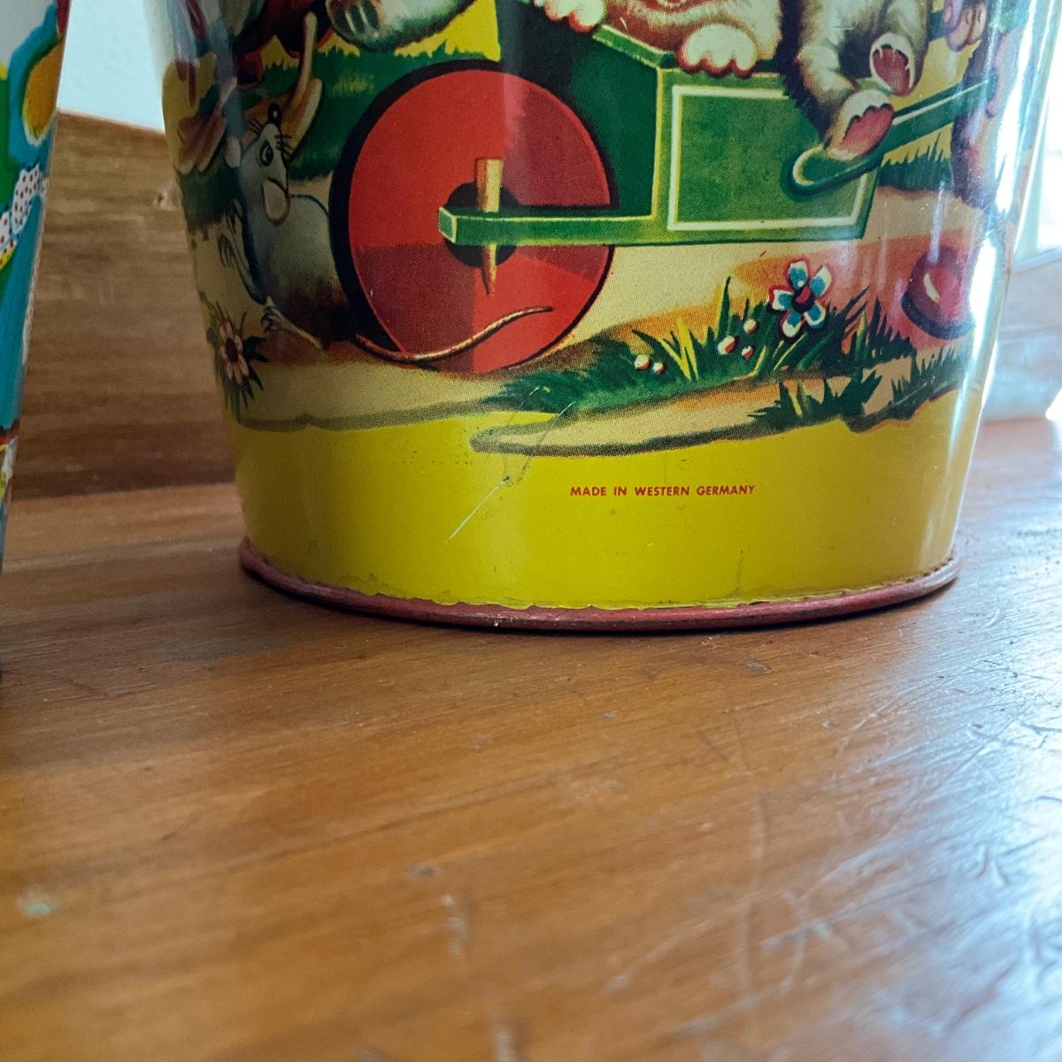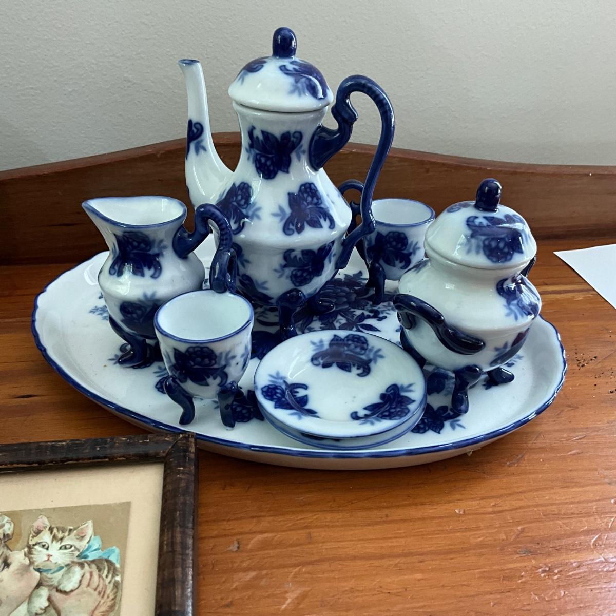 Framed victorian postcard and childs tea set and two ohio art sand pails