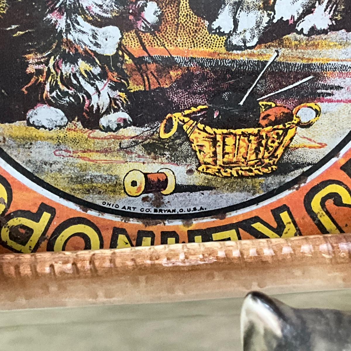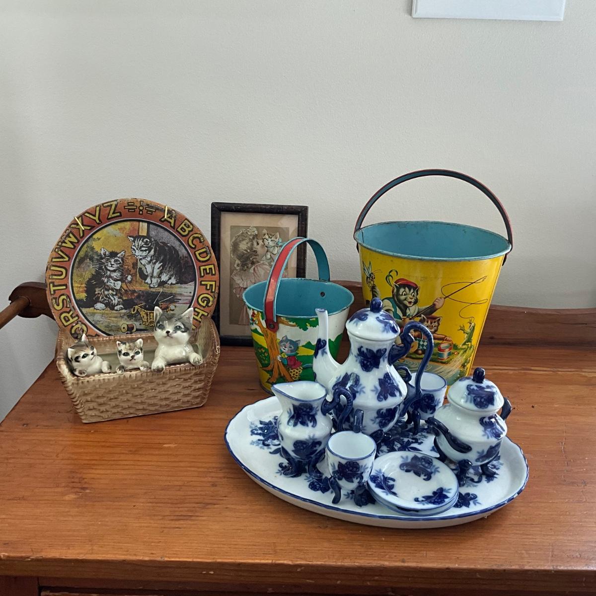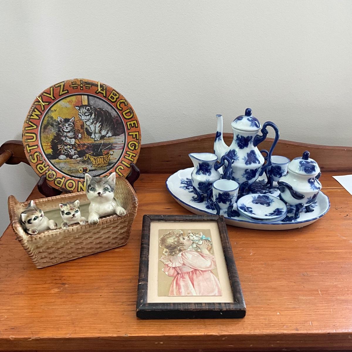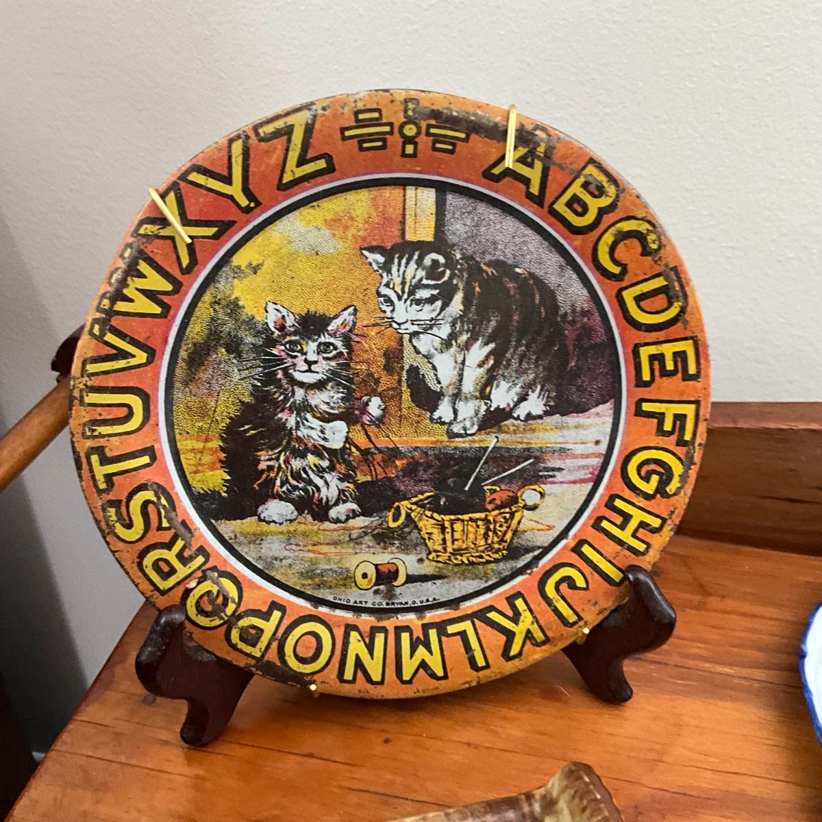 Ohio Art Alphabet Kitten plate with porcelain kittens in basket