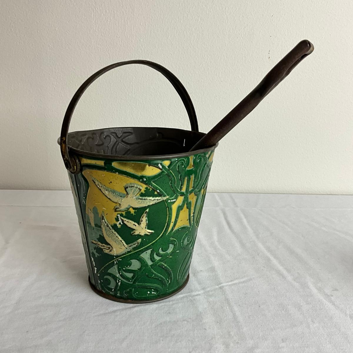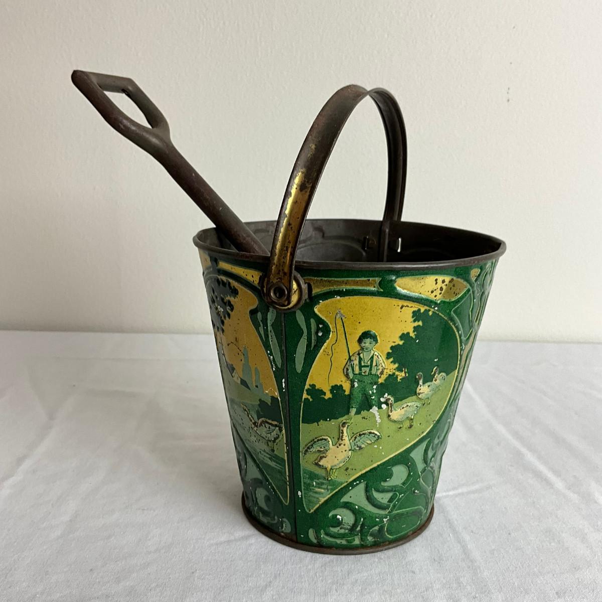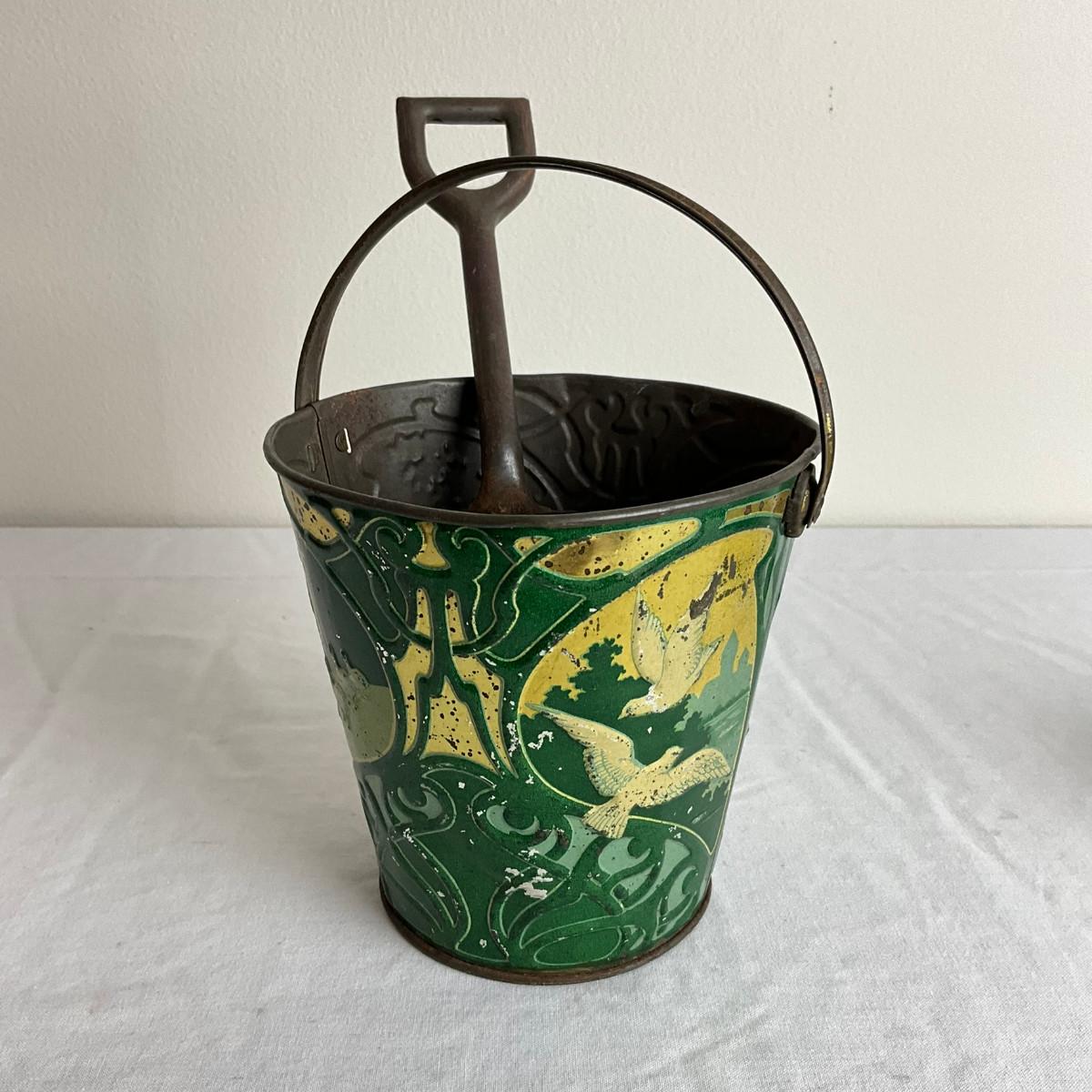 L868 Antique French Lithograph of Birds and Children Green & Gold Sand Pail