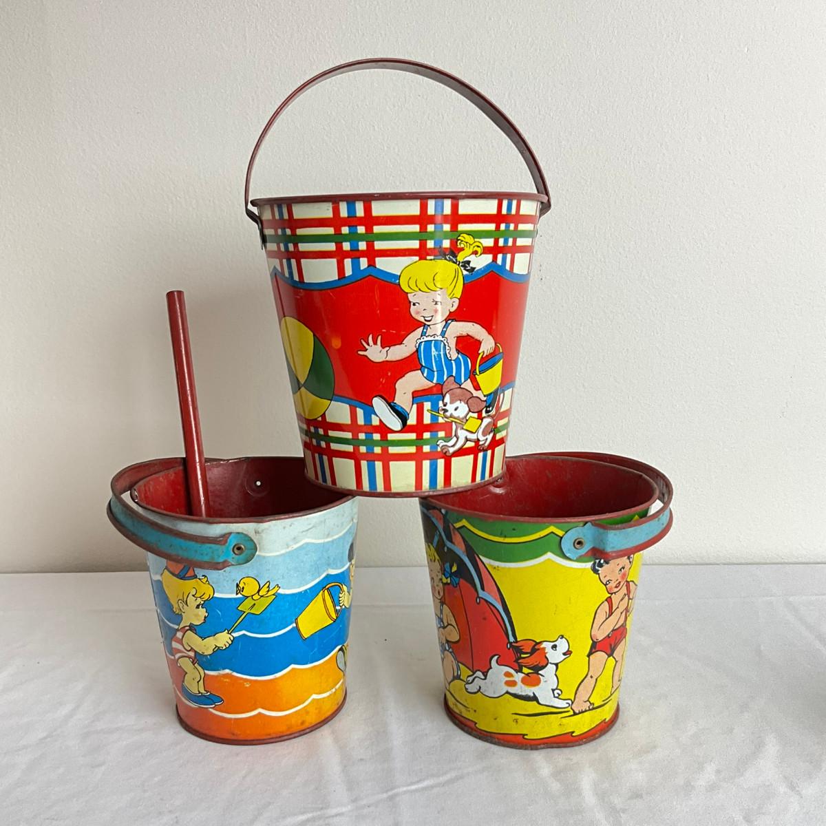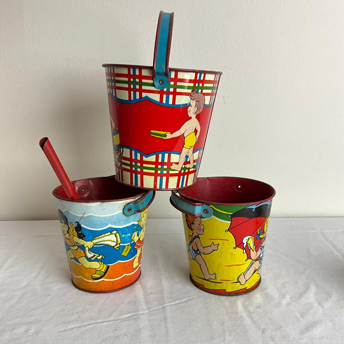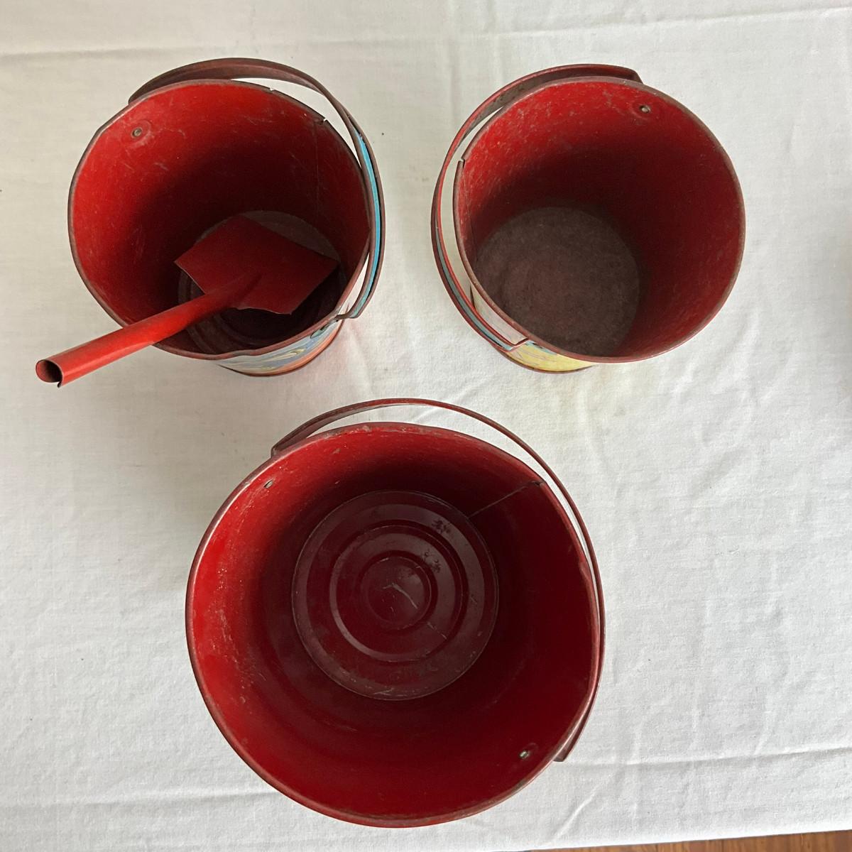 D874 Lot Of Three Vintage Elaine Ends Hileman Sandpails With One Shovel