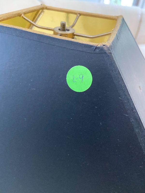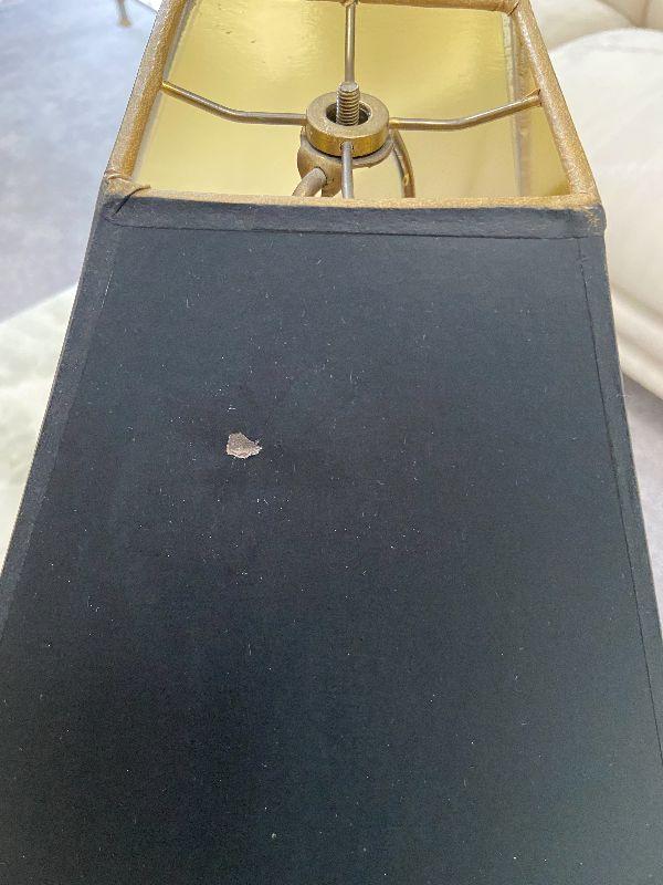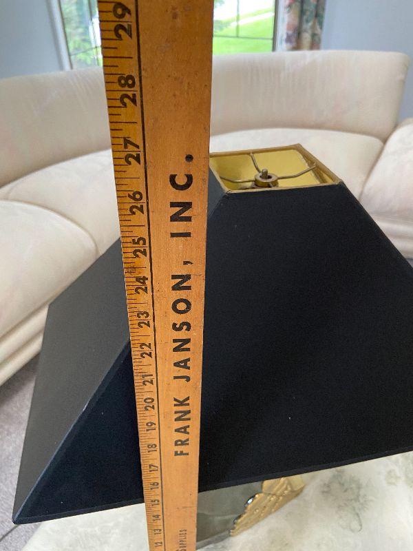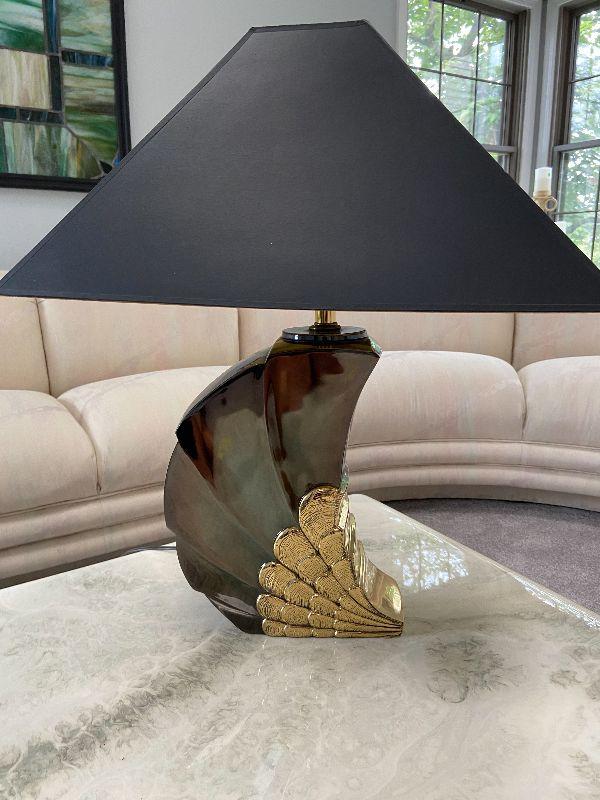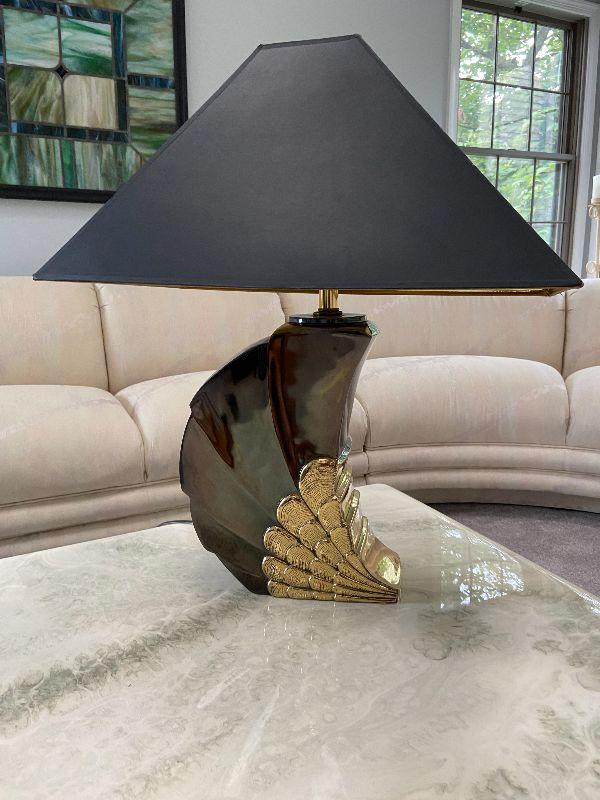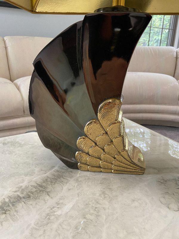 Black and gold art deco lamp wih wave shape. Quite stunning. Please see all pictures for contents in this listing, the condition of items in the listing, and the size if measurements were taken. Thank you for looking and have fun bidding.