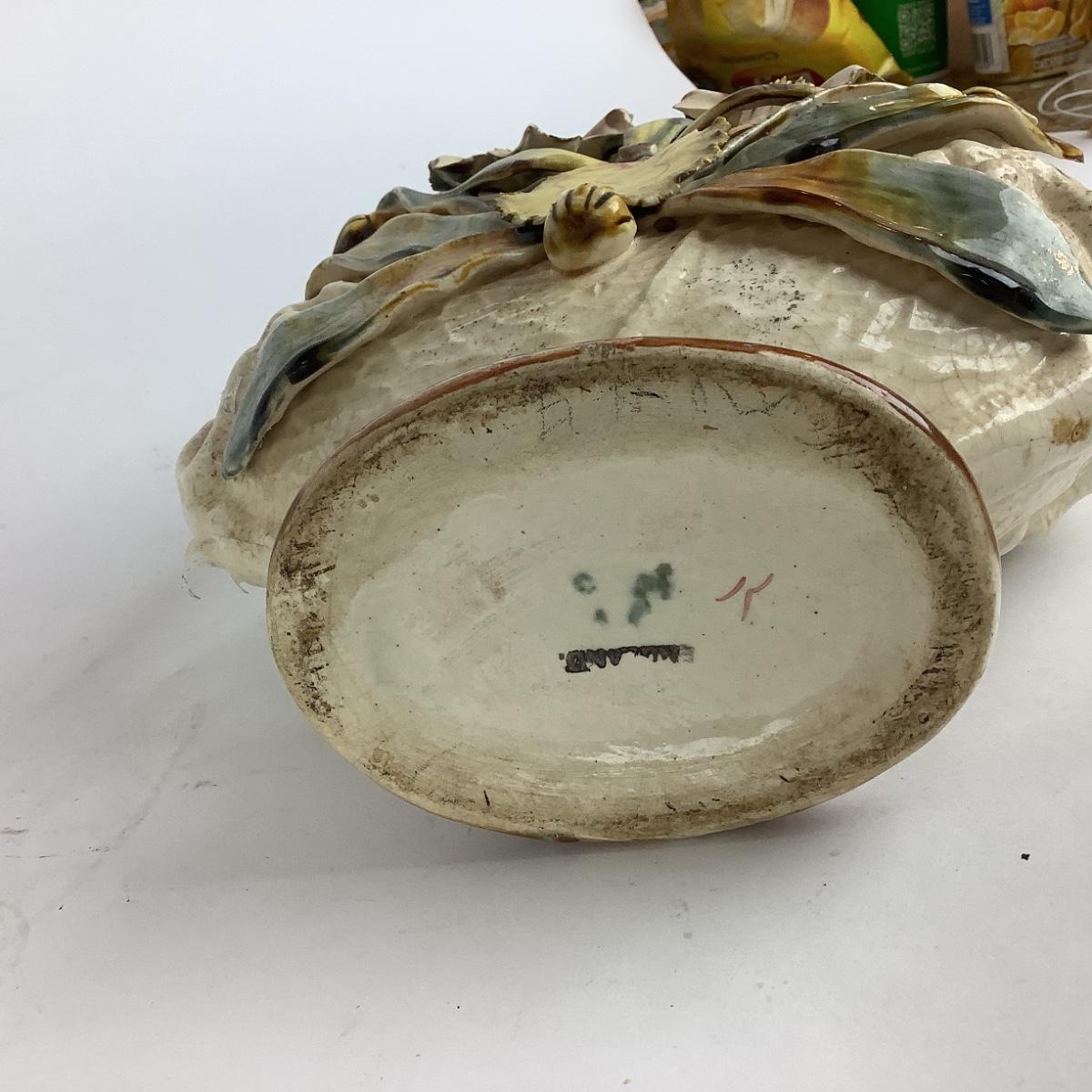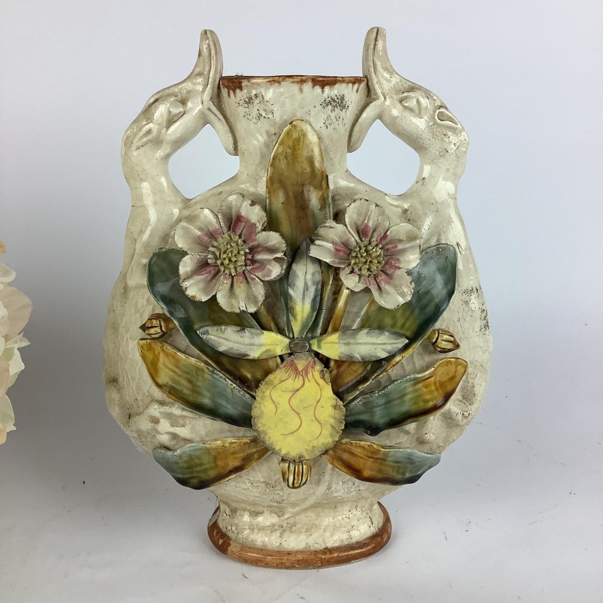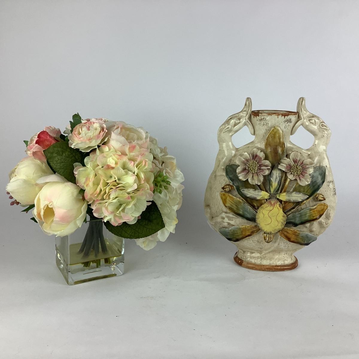 L927 Majolica Moon Flask Vase with Faux Floral Arrangement