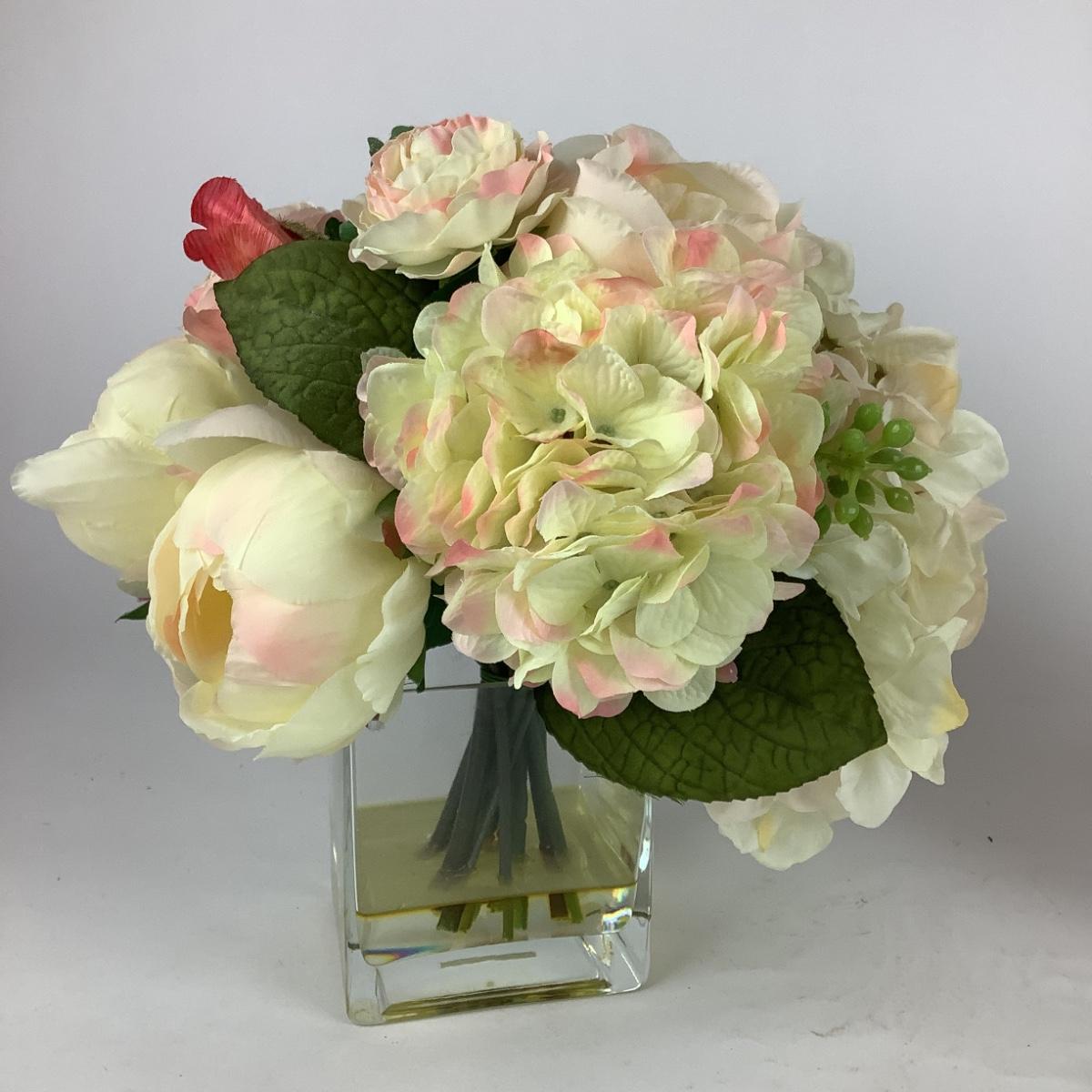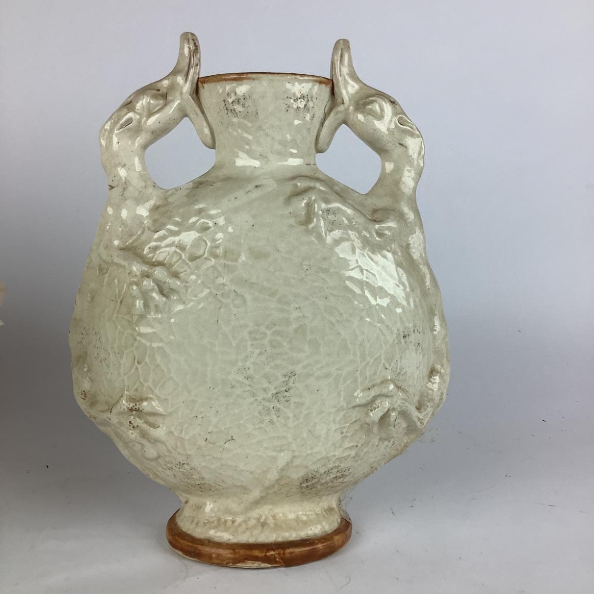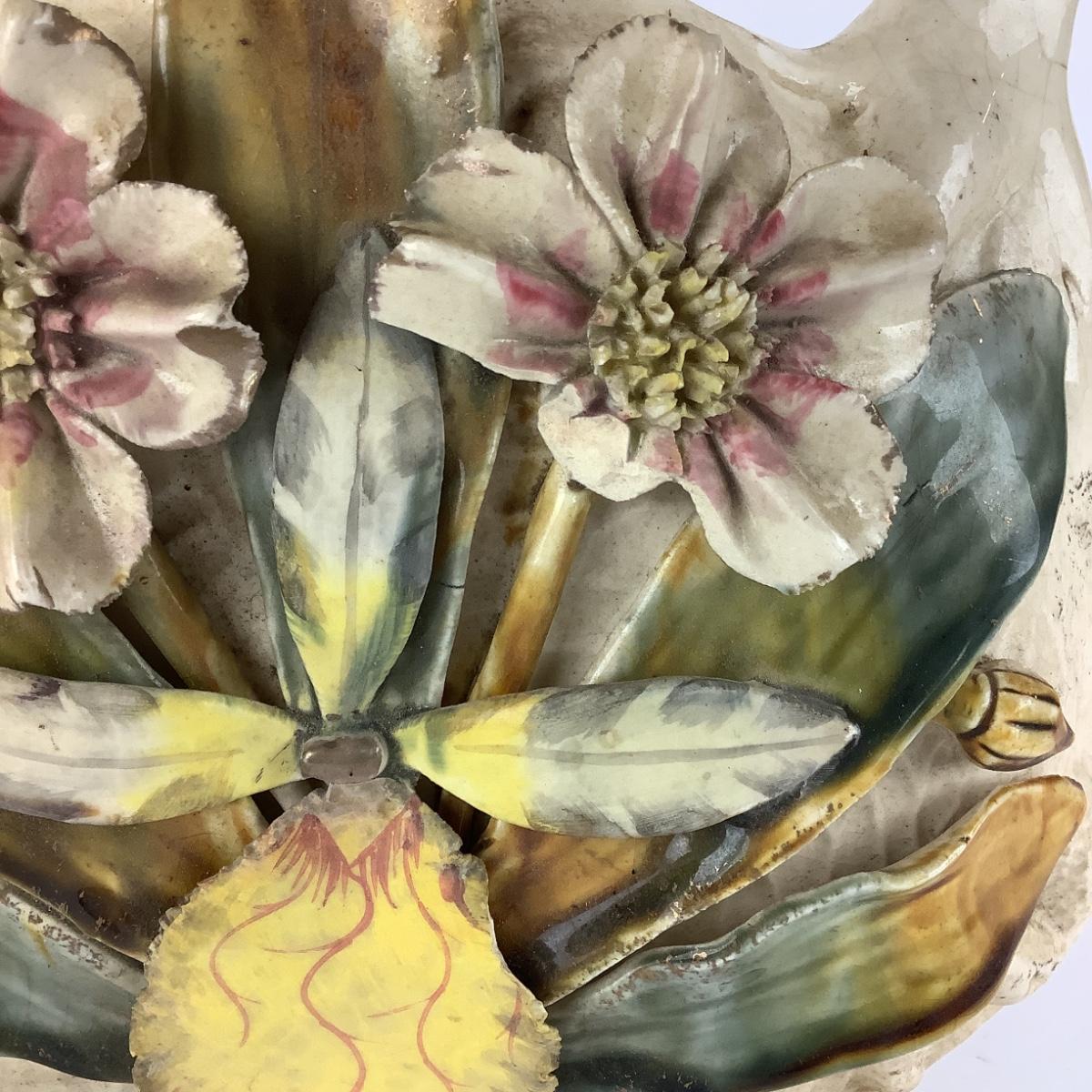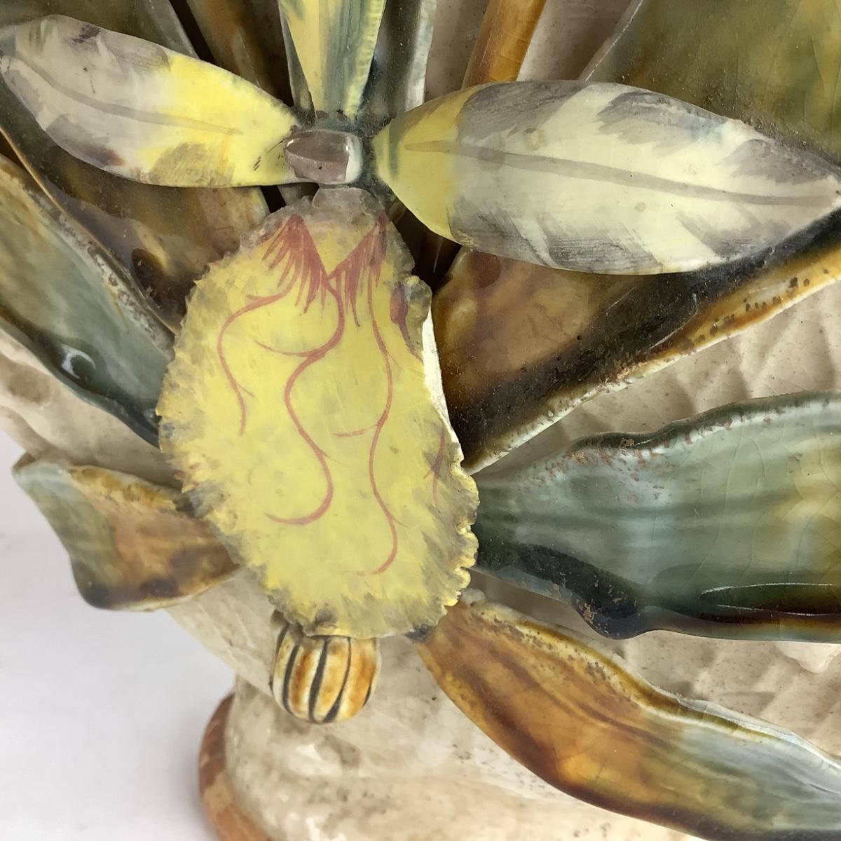 L927 Majolica Moon Flask Vase with Faux Floral Arrangement