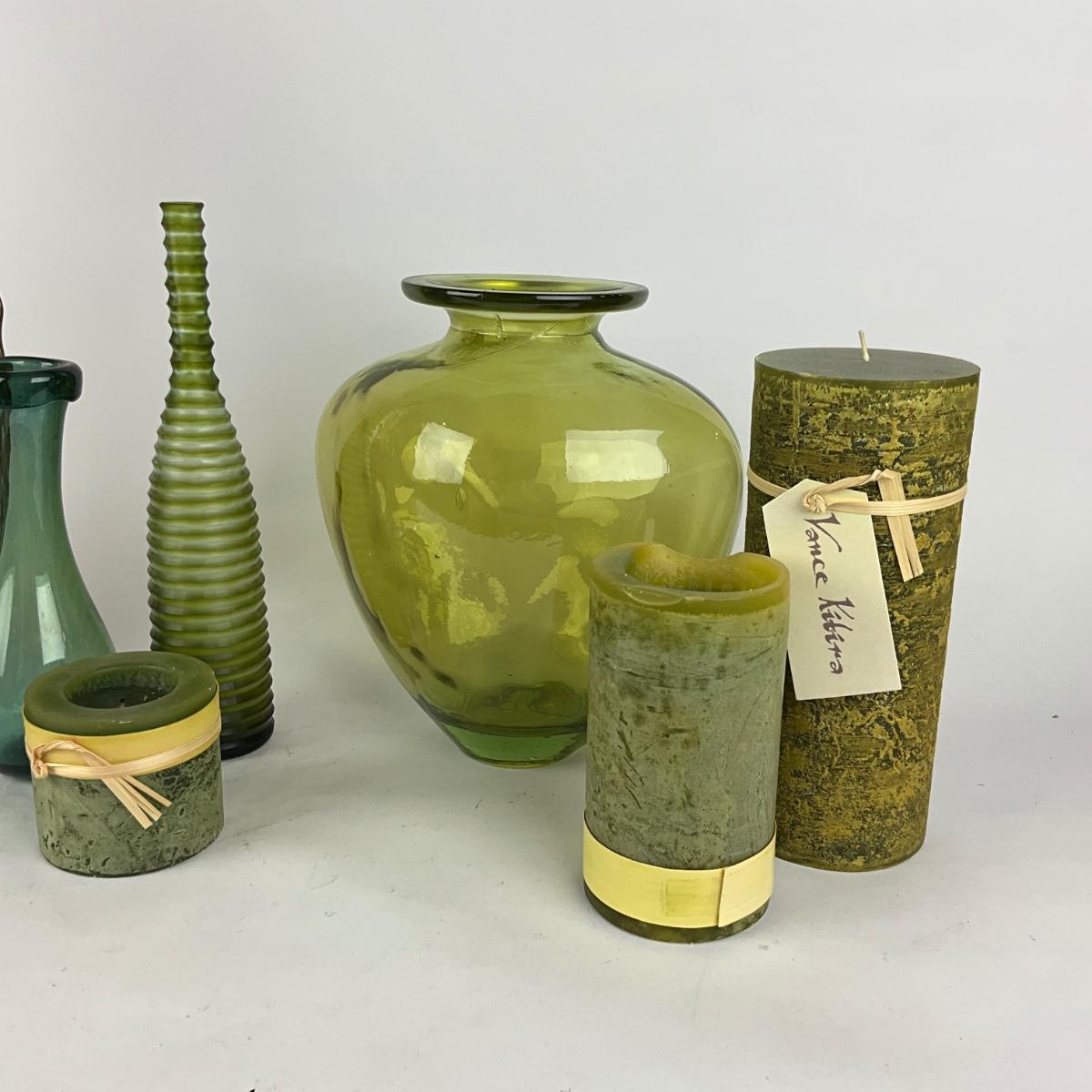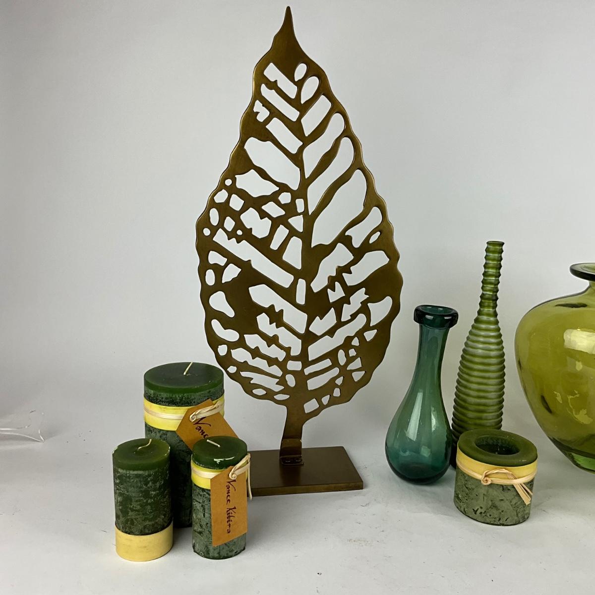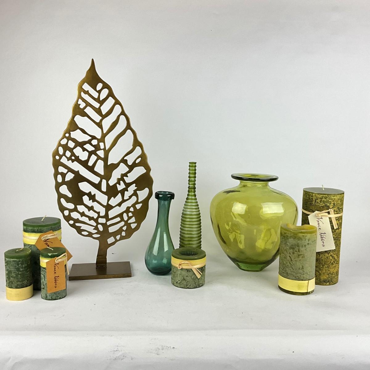 L948 Large Hyde Metal Arterious Leaf with Green Glass Vases and Candles