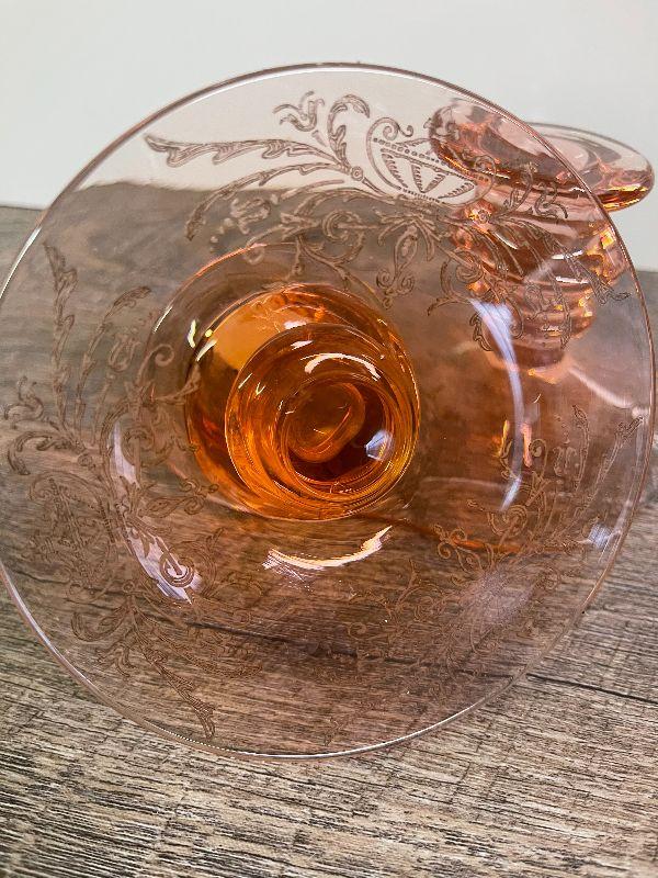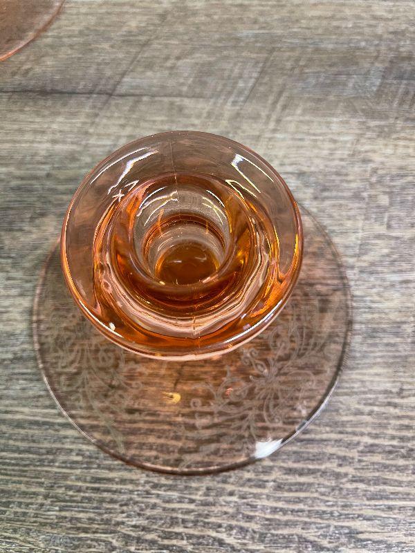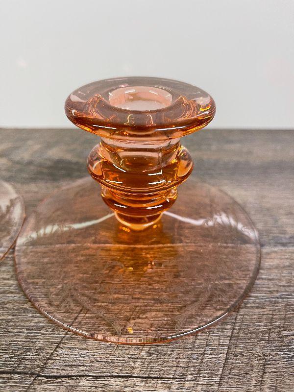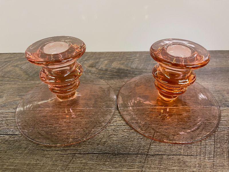 Lovely Pink Depression Glass Candlesticks with pattern on base. Please see all pictures for details. Please see pictures for condition and measurements if taken. All items are sold as found and if furniture, you will need to be able to move yourself. Thank you for looking and have fun bidding! As always, thank you for being a Treasure Me Hunter!