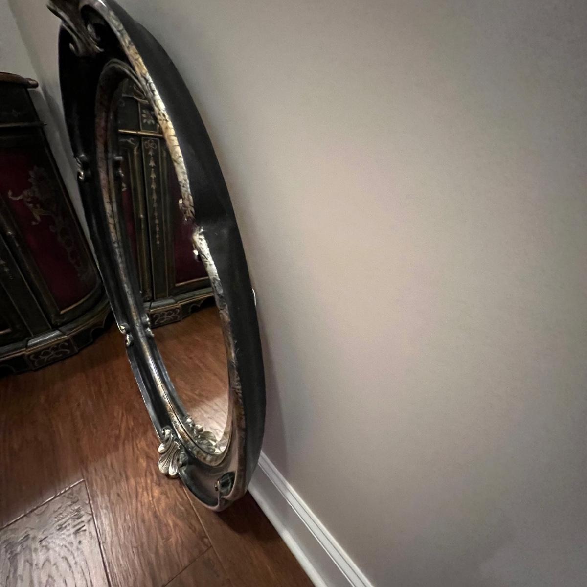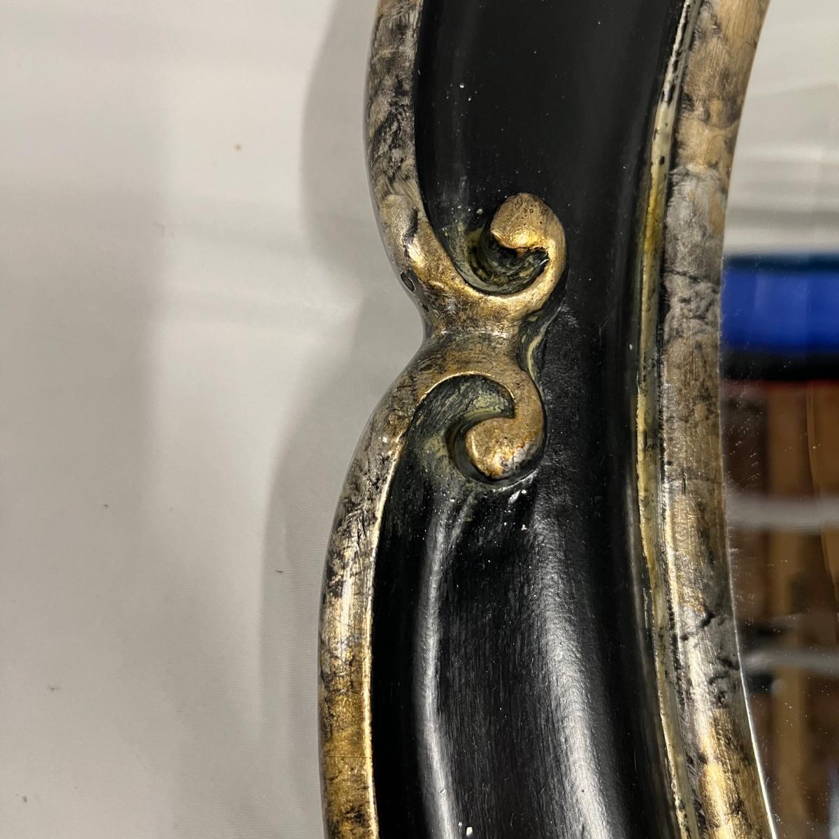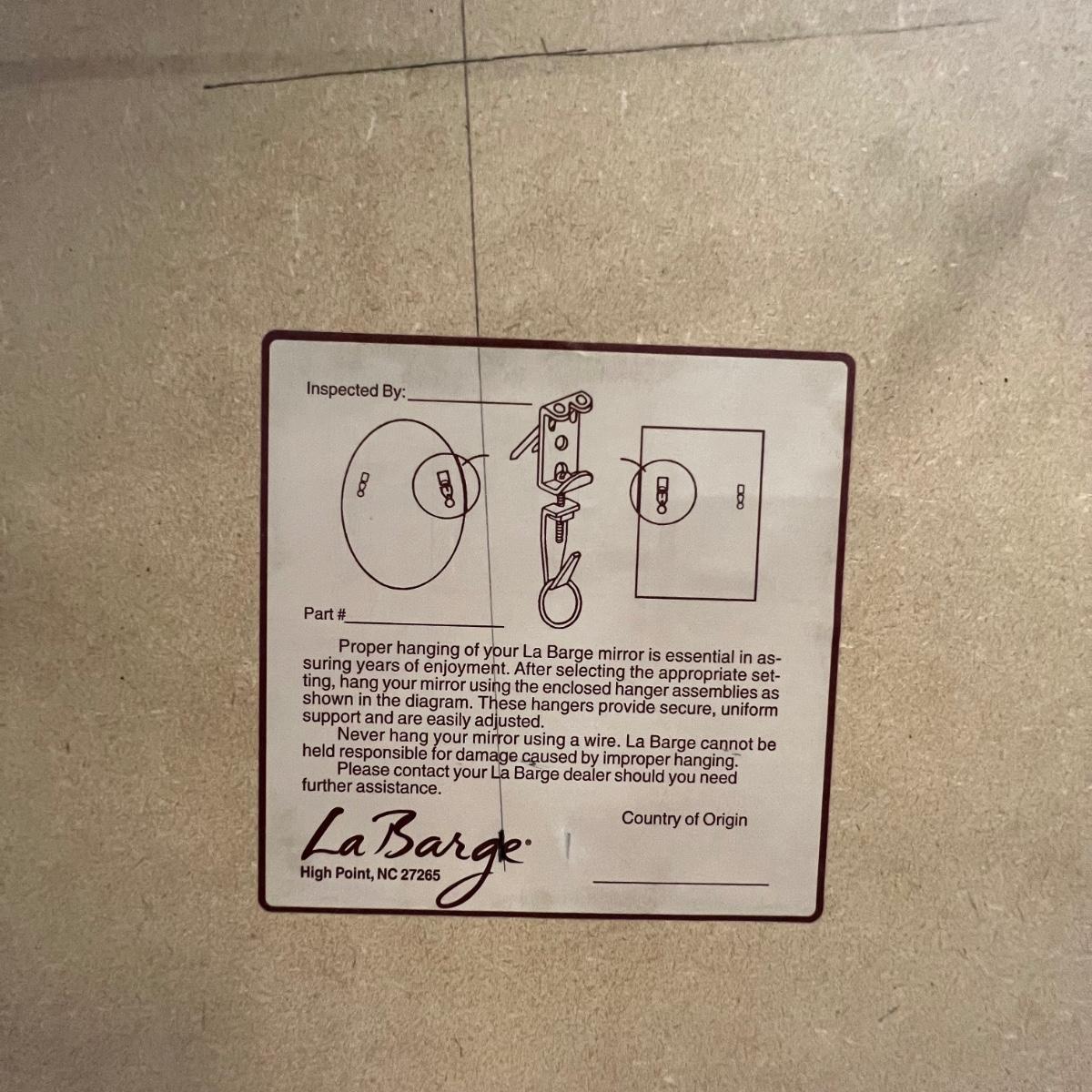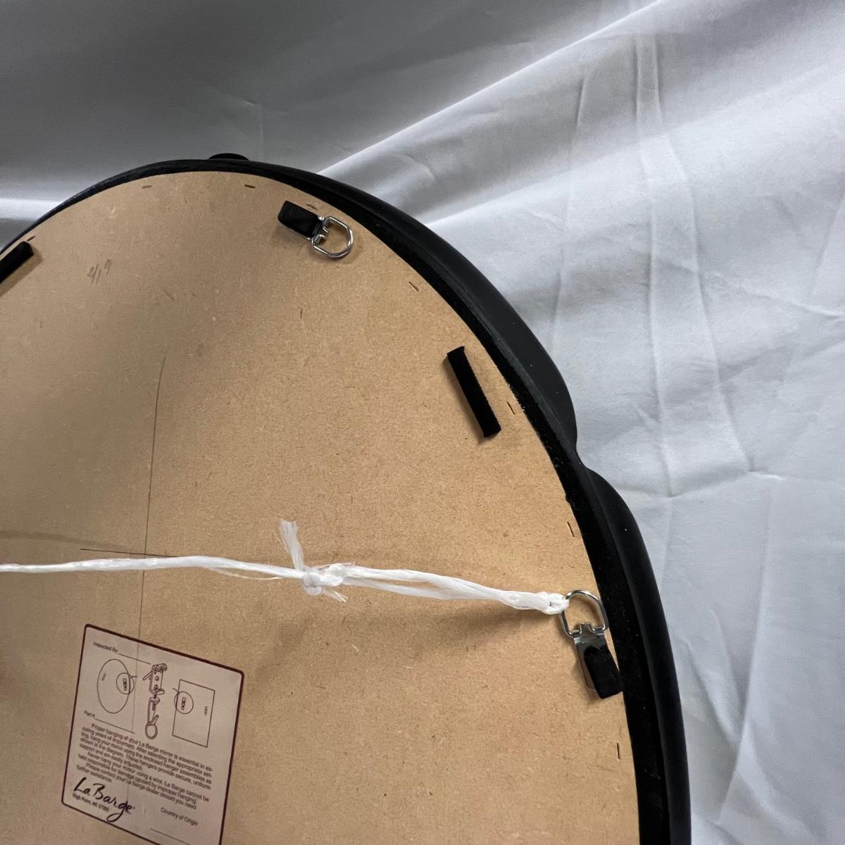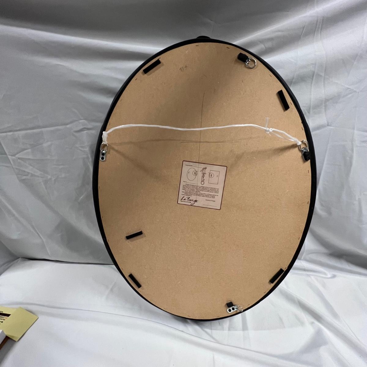 This La Barge oval mirror appears to be wood painted black with an iridescent painted inner trim and silver painted accents. Glass is beveled and the durable hanging hardware offers two different orientations for hanging.