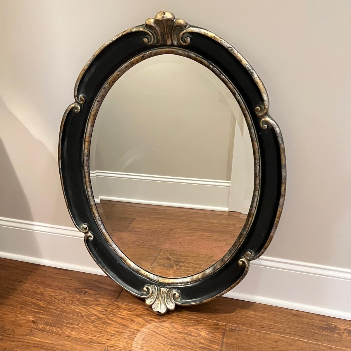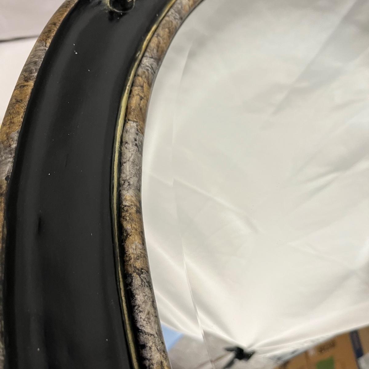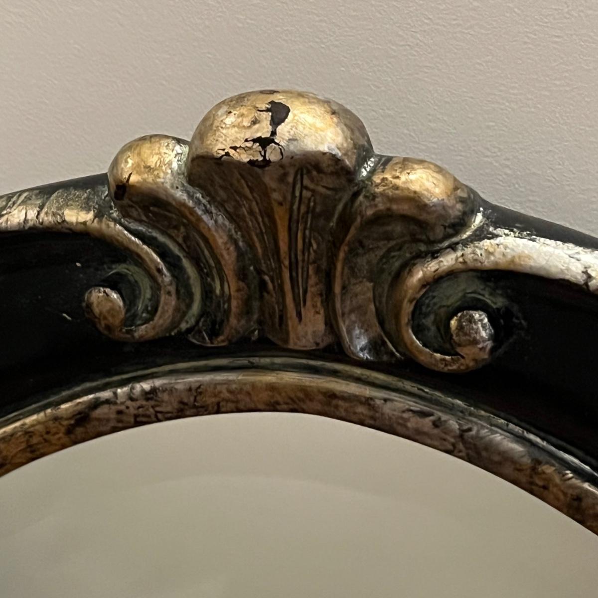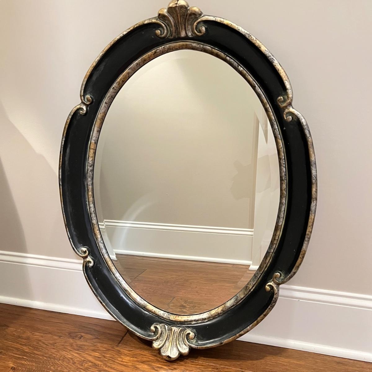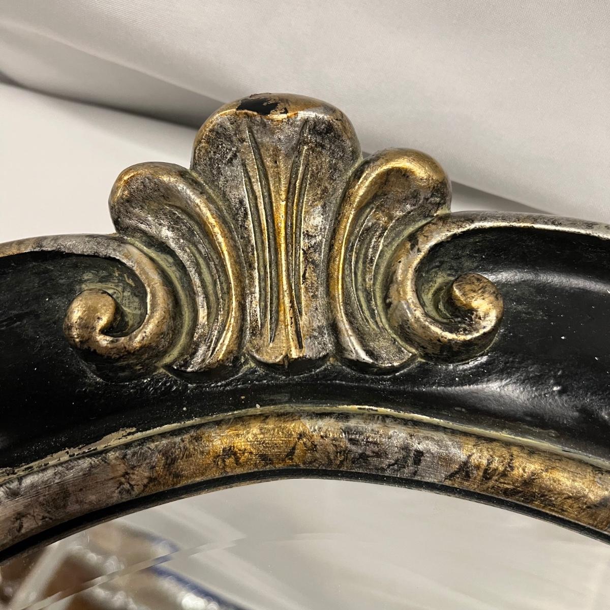 This La Barge oval mirror appears to be wood painted black with an iridescent painted inner trim and silver painted accents. Glass is beveled and the durable hanging hardware offers two different orientations for hanging.