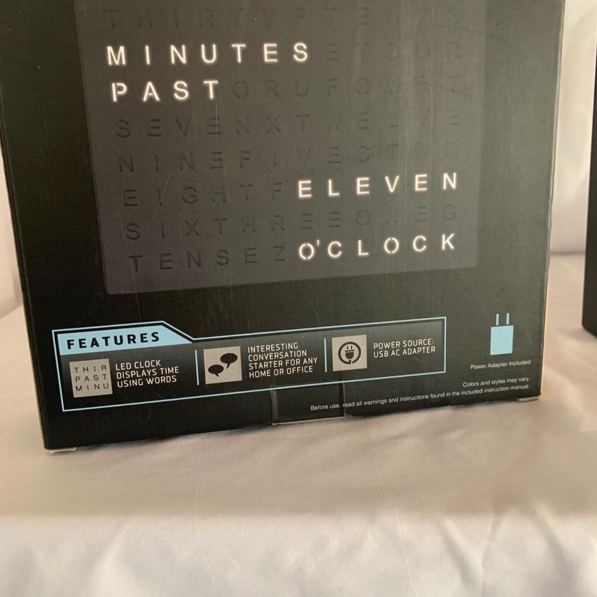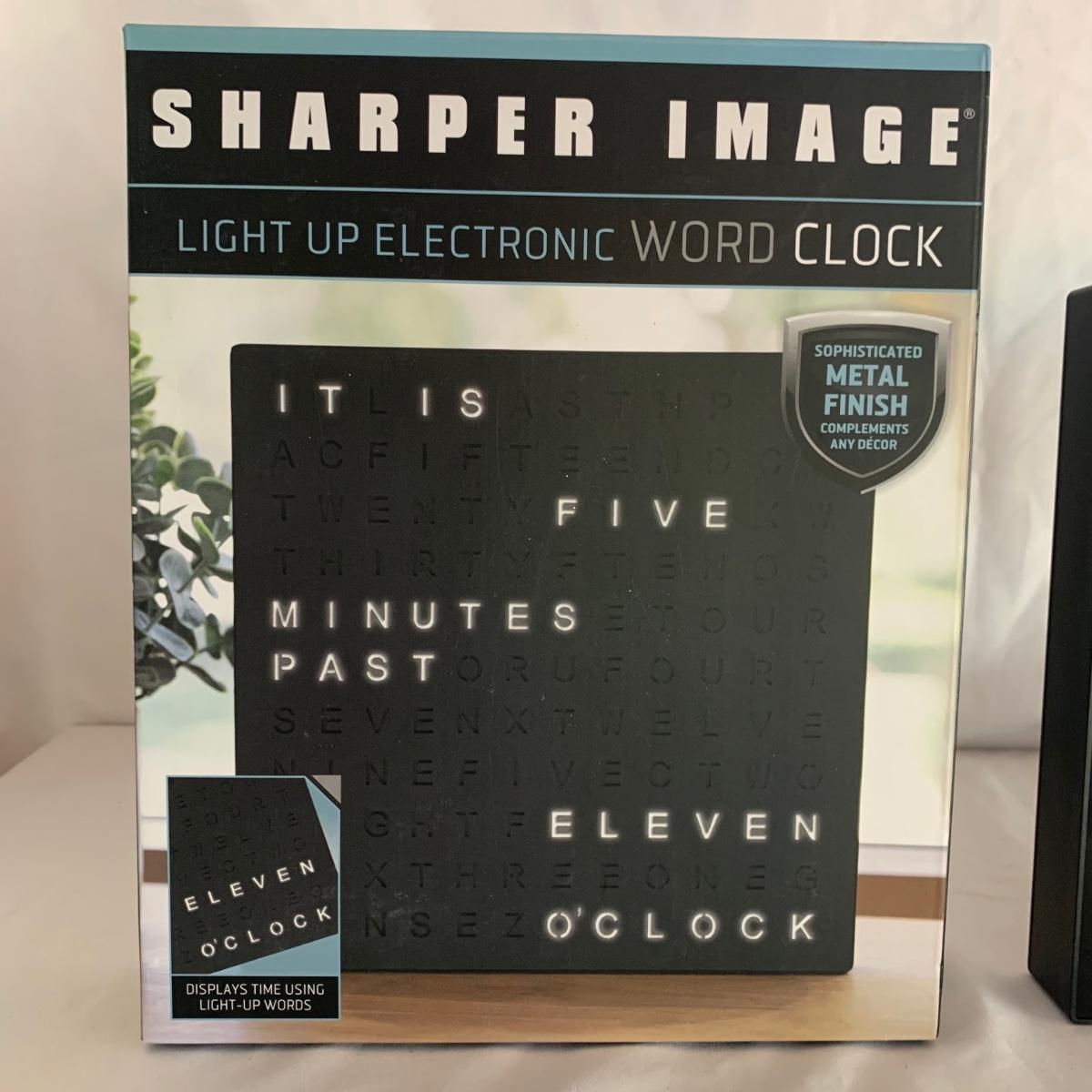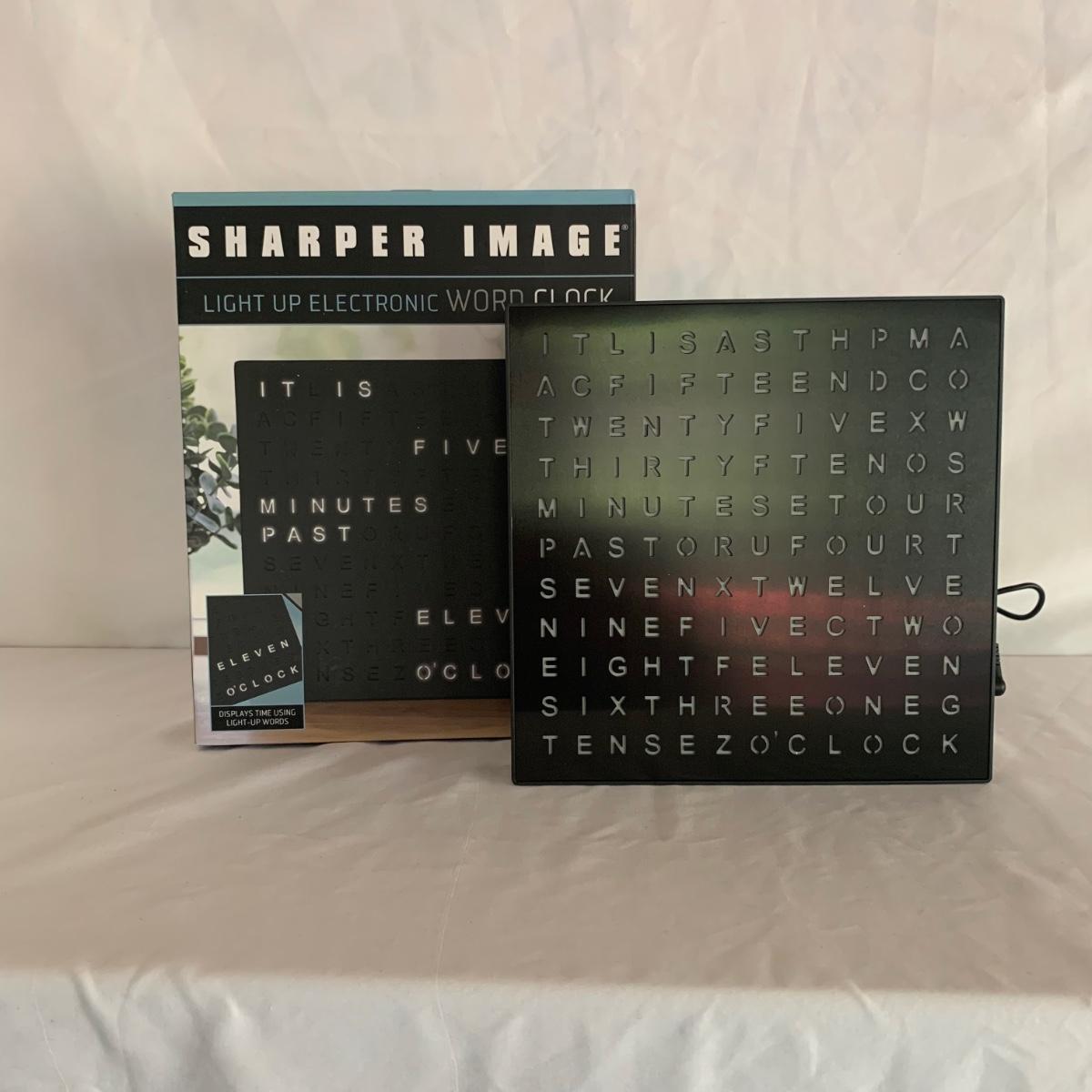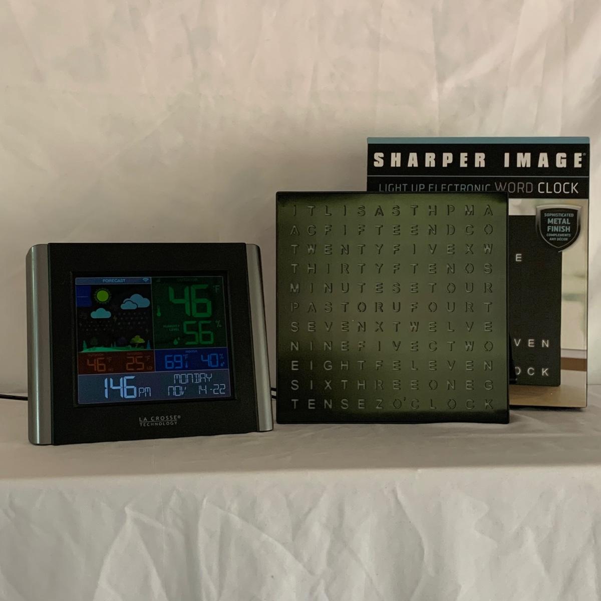 La Crosse Technology color weather station, Model C84343, displays the date & time, forecast, outdoor temperature, indoor temperature, and more. Item functioned when tested. It appears to be missing a button and has two other loose buttons, see photos. Outdoor sensor is included, but not in the pictures here. The Sharper Image Light Up Word Clock appears brand new in its original box. The clock measures 8” x 8”.