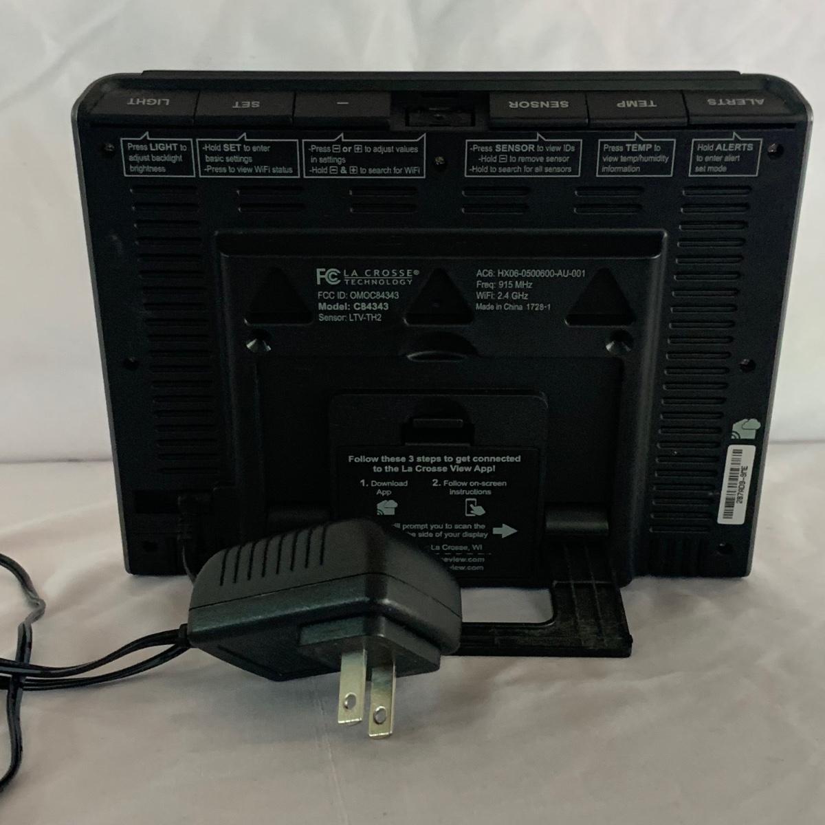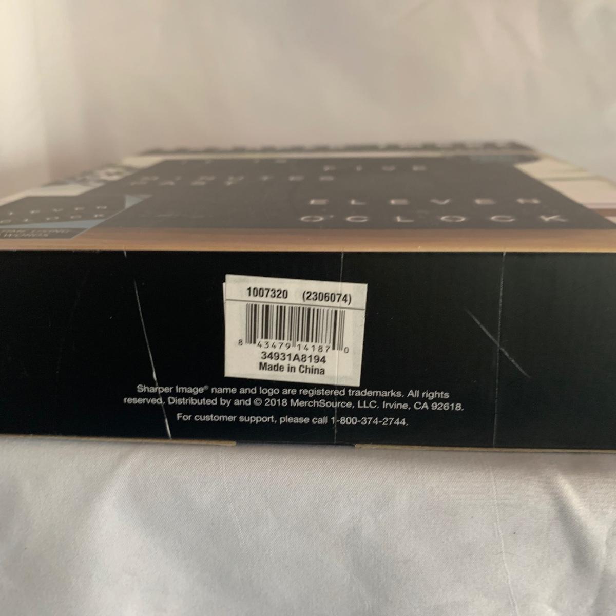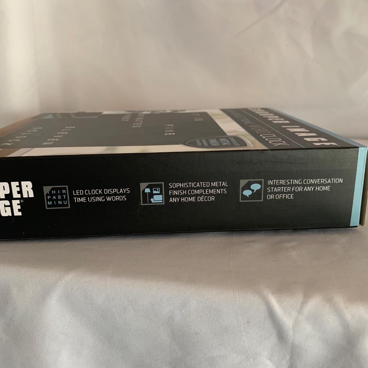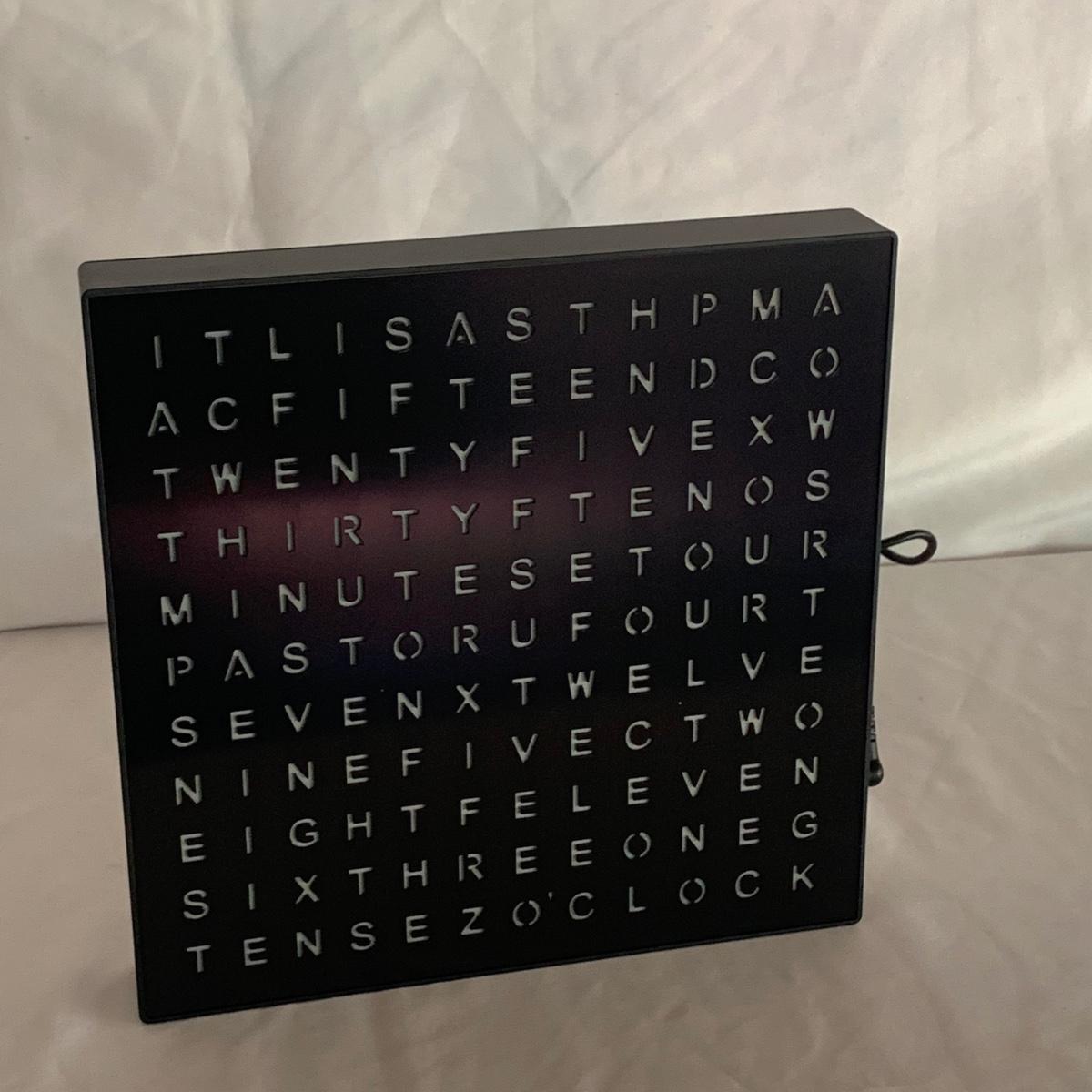 La Crosse Technology color weather station, Model C84343, displays the date & time, forecast, outdoor temperature, indoor temperature, and more. Item functioned when tested. It appears to be missing a button and has two other loose buttons, see photos. Outdoor sensor is included, but not in the pictures here. The Sharper Image Light Up Word Clock appears brand new in its original box. The clock measures 8” x 8”.