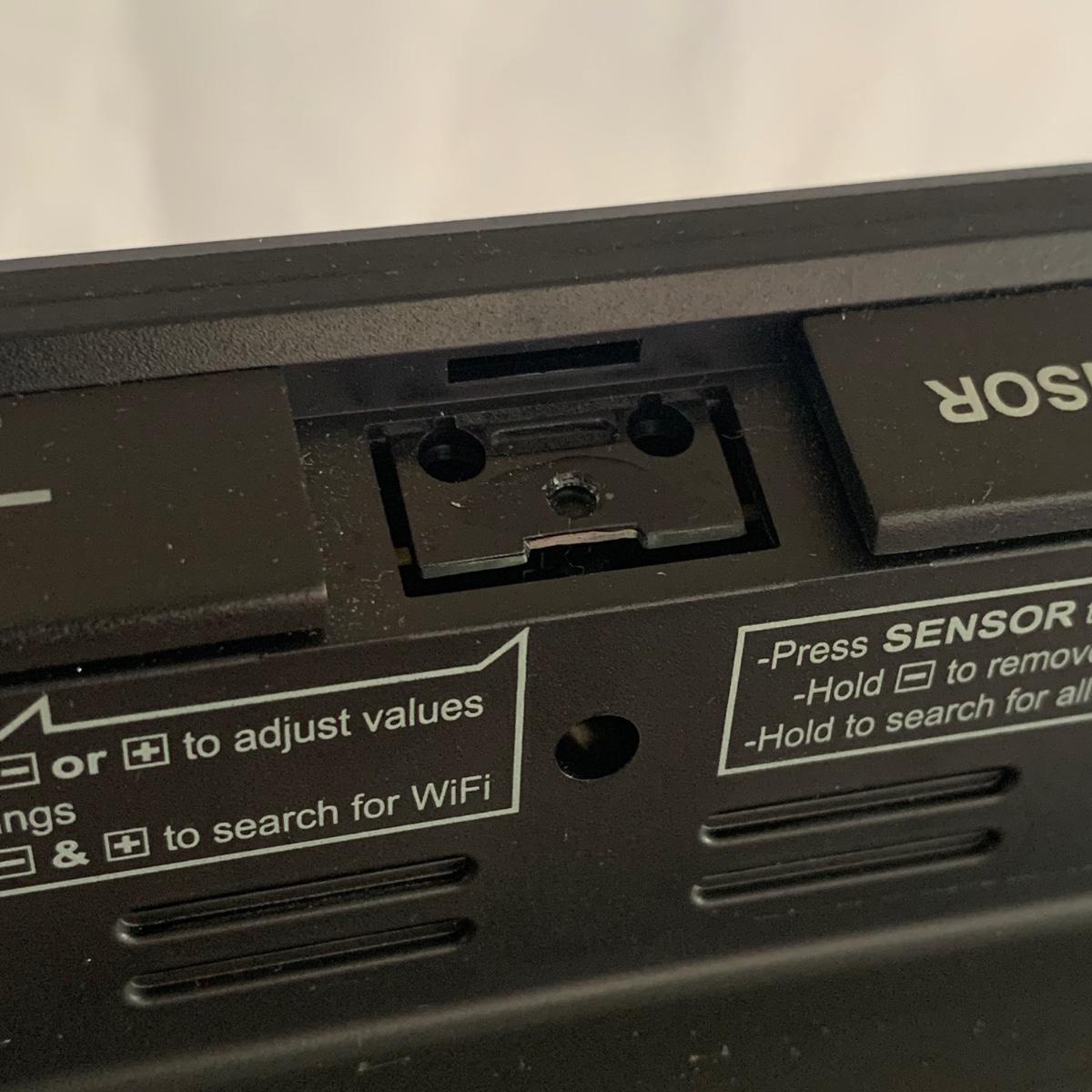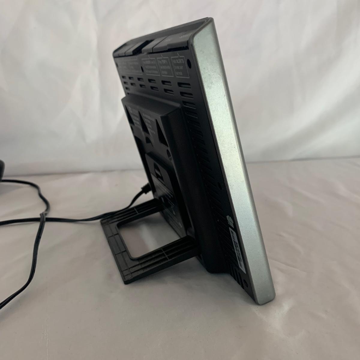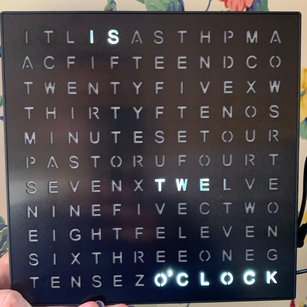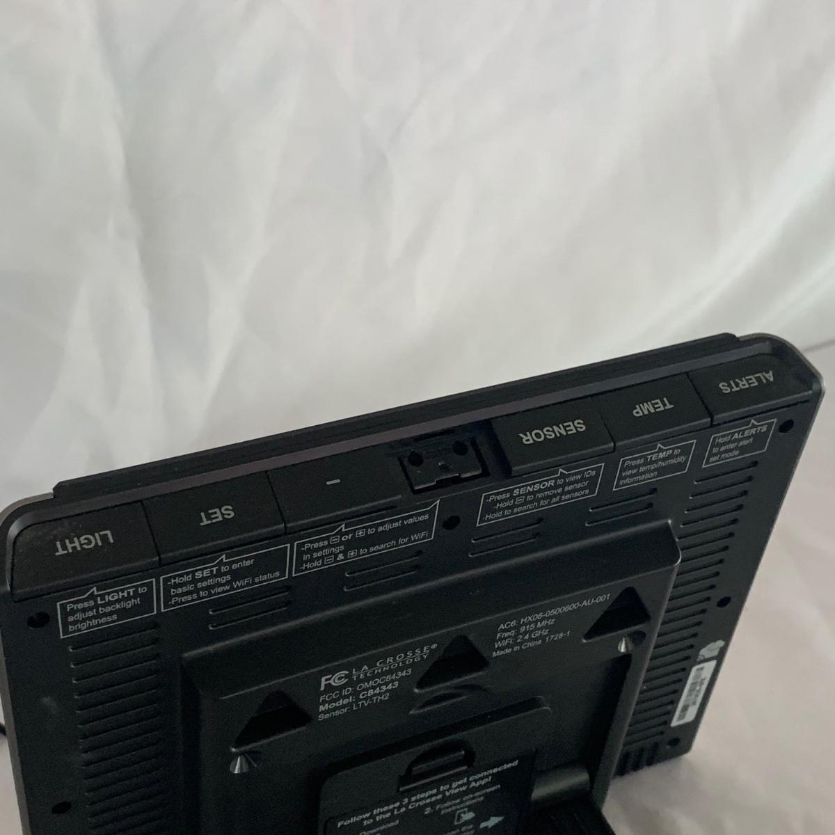 La Crosse Technology color weather station, Model C84343, displays the date & time, forecast, outdoor temperature, indoor temperature, and more. Item functioned when tested. It appears to be missing a button and has two other loose buttons, see photos. Outdoor sensor is included, but not in the pictures here. The Sharper Image Light Up Word Clock appears brand new in its original box. The clock measures 8” x 8”.