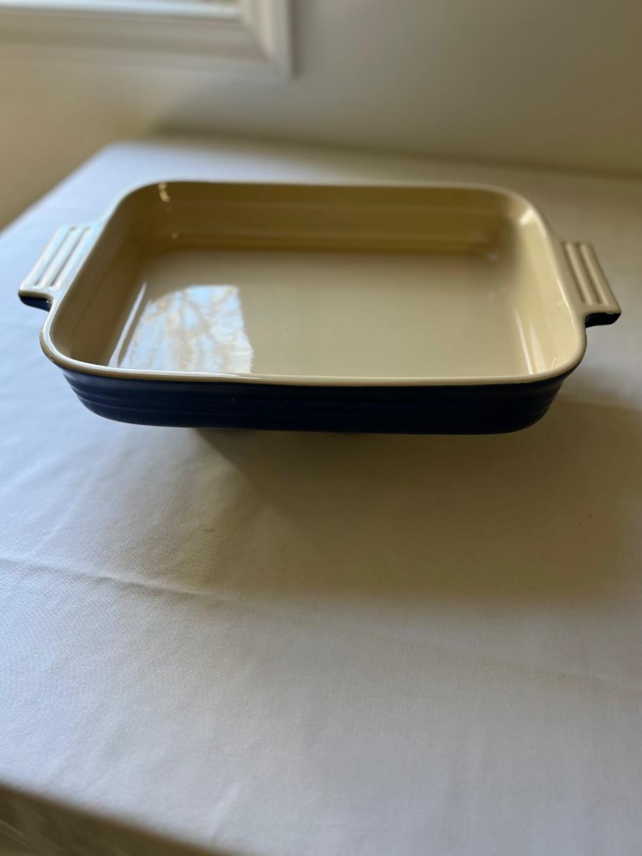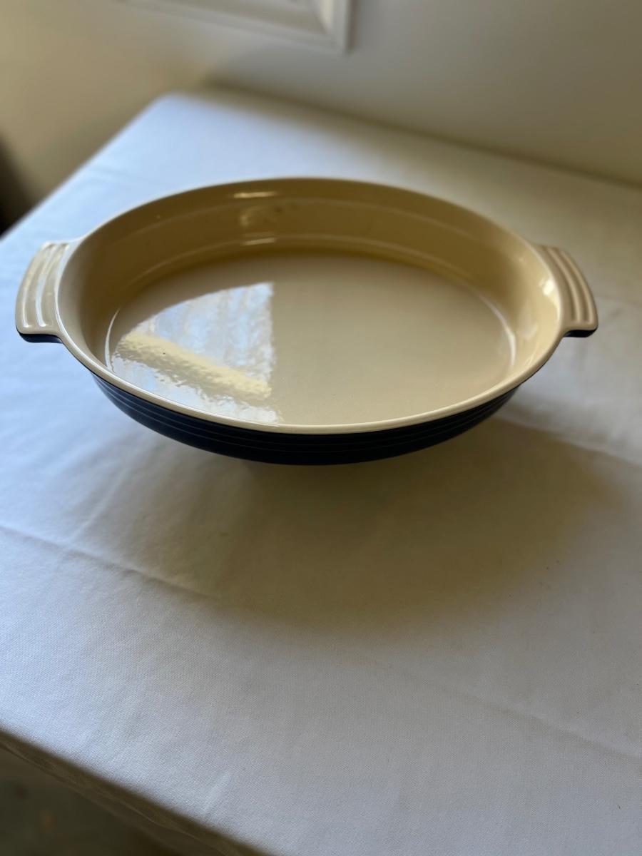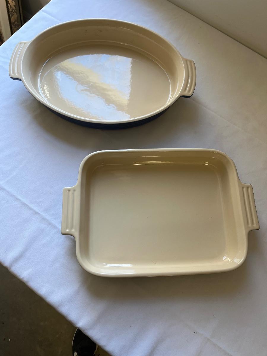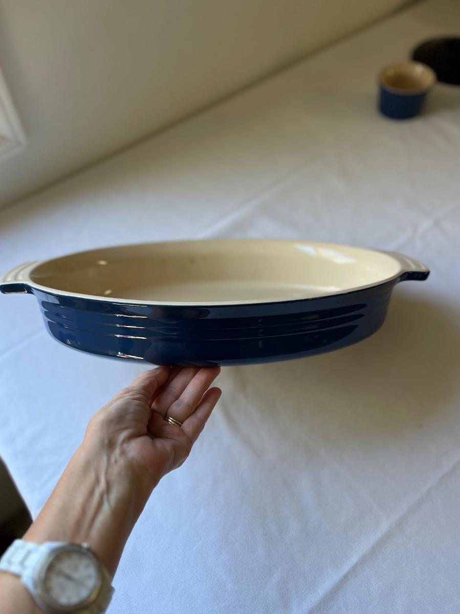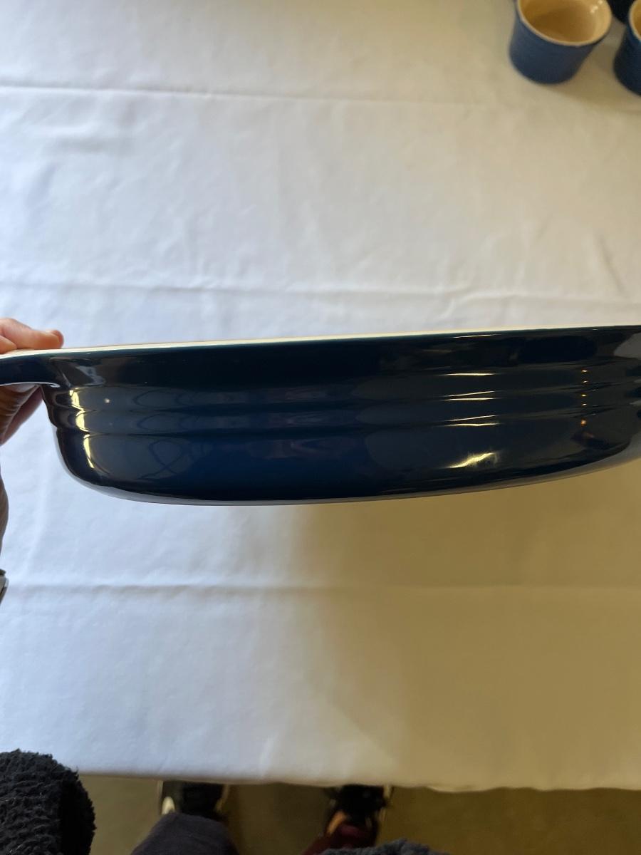 This includes beautiful blue ceramic stoneware by LeCreuset in a rectangular pan, overall size, 10” x 2” x 15”. And an oval pan measuring 10.75” x 2.5” x 16.25”. Also a LC smaller black lidded casserole dish measuring 7”D. Plus LC blue ramekins, 2” x 3.25”D and a chaffing stand that holds tea candles.
