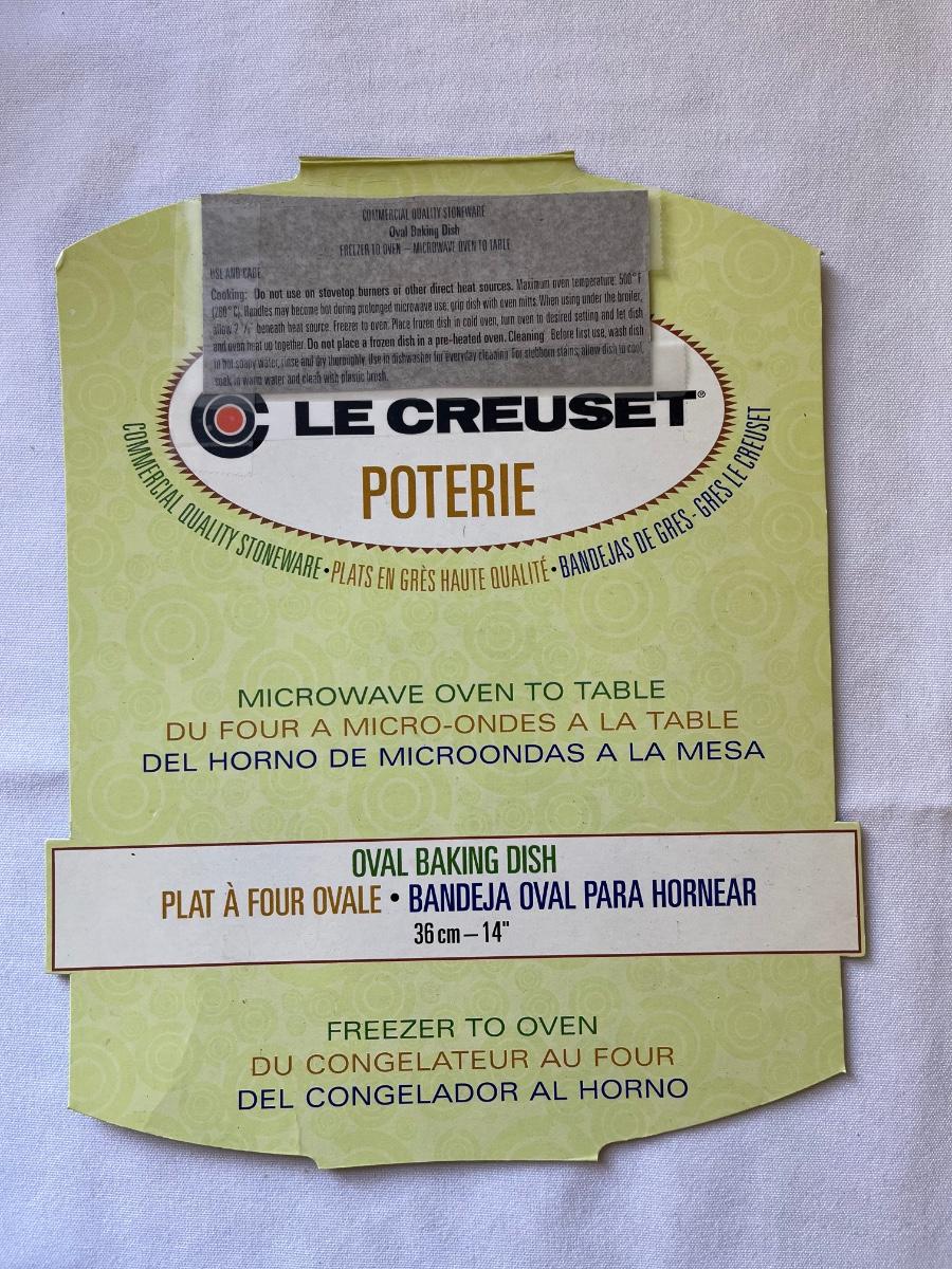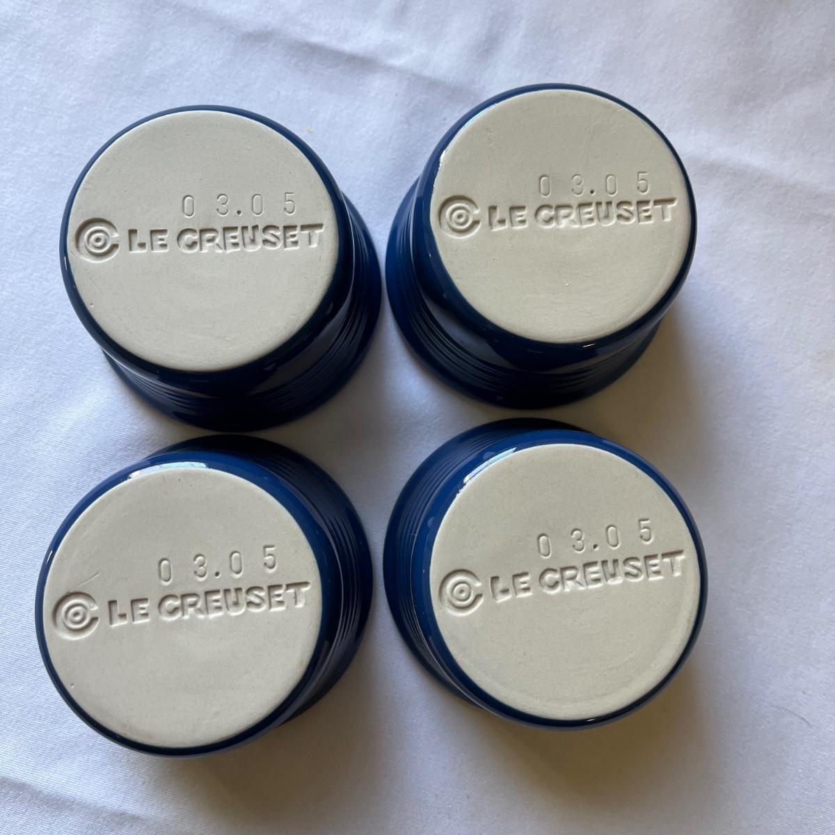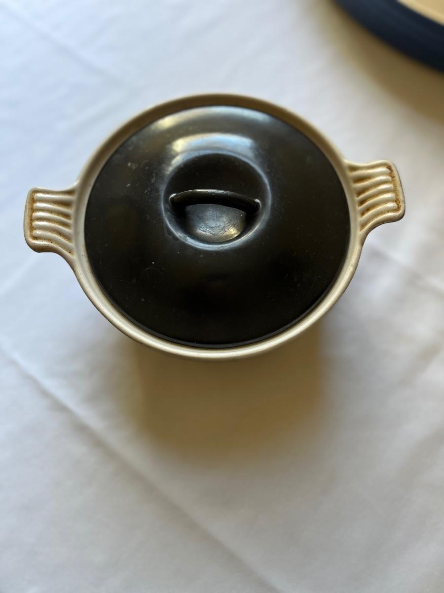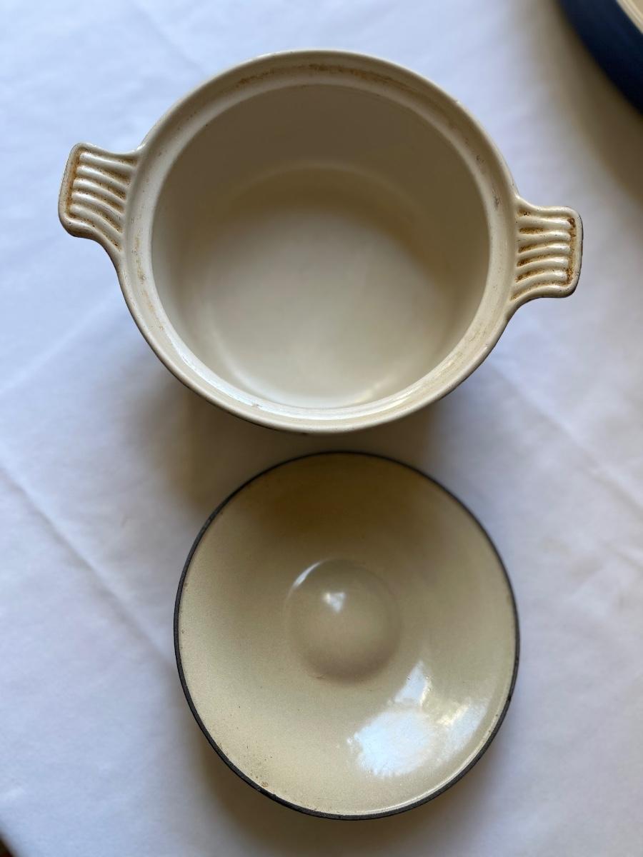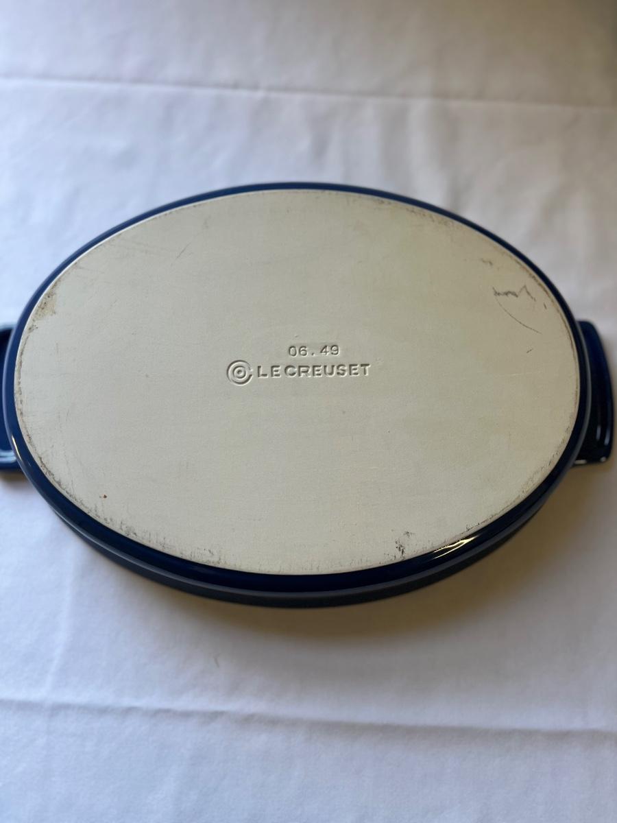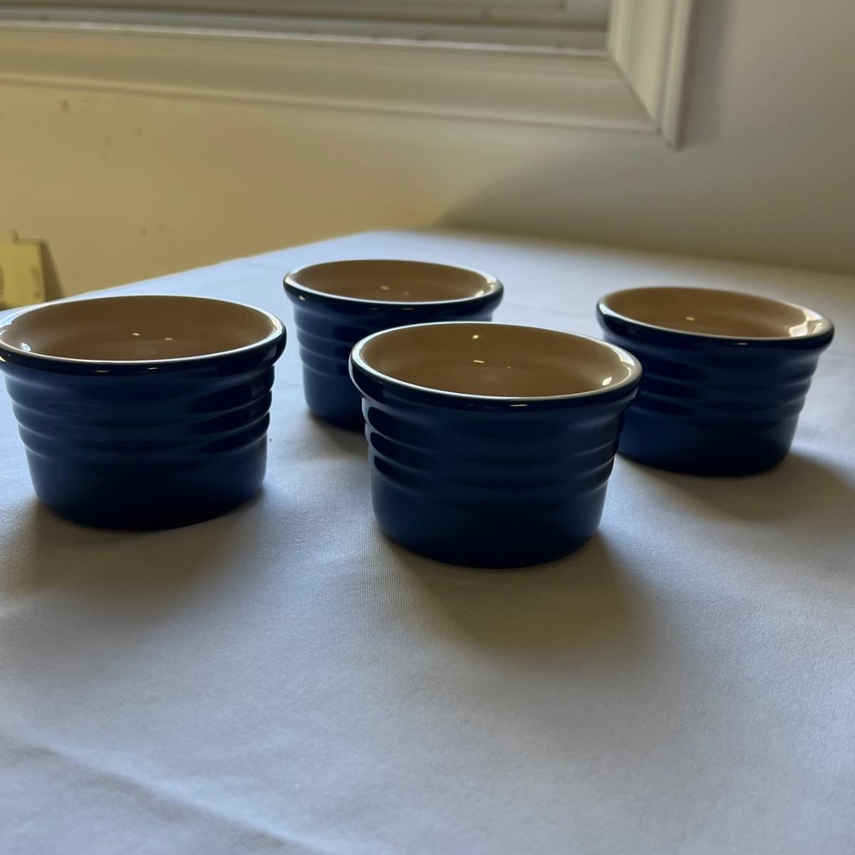 This includes beautiful blue ceramic stoneware by LeCreuset in a rectangular pan, overall size, 10” x 2” x 15”. And an oval pan measuring 10.75” x 2.5” x 16.25”. Also a LC smaller black lidded casserole dish measuring 7”D. Plus LC blue ramekins, 2” x 3.25”D and a chaffing stand that holds tea candles.