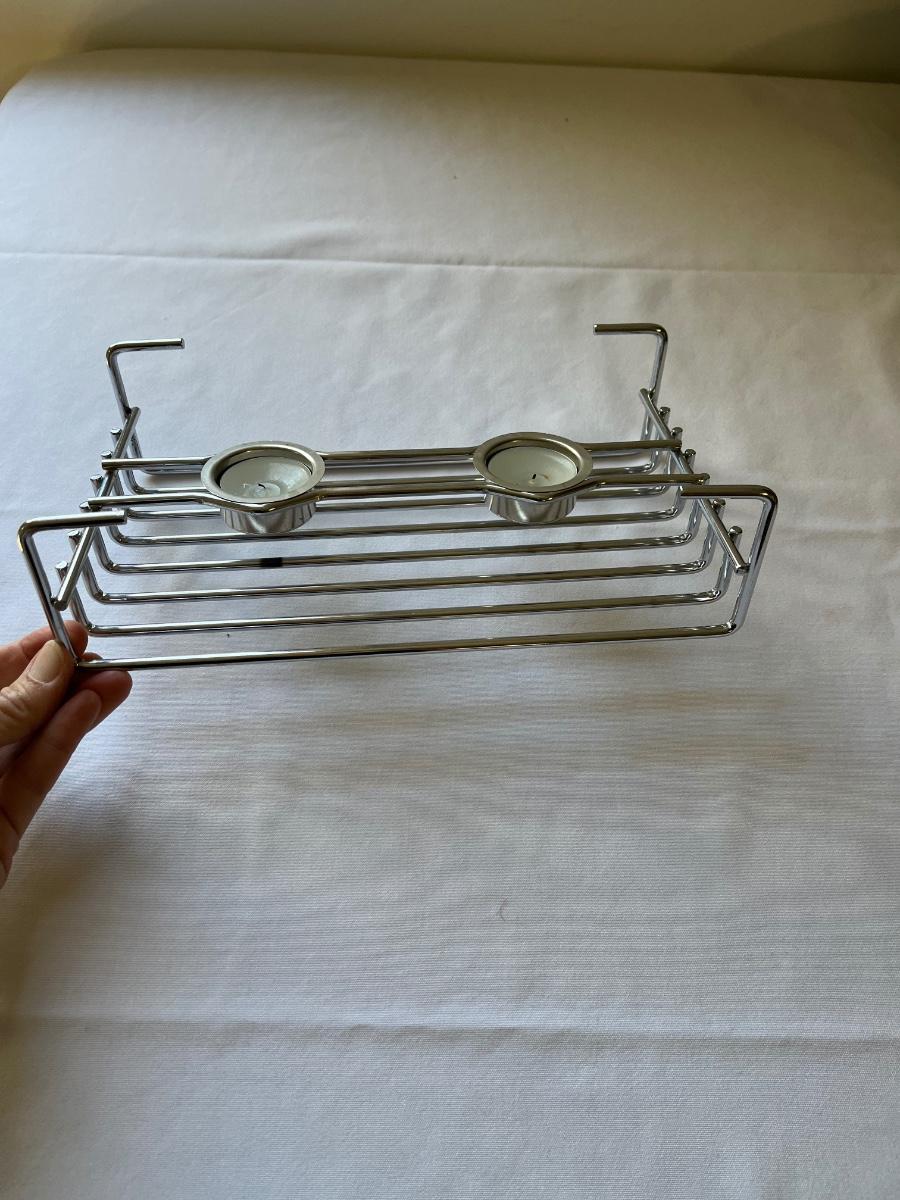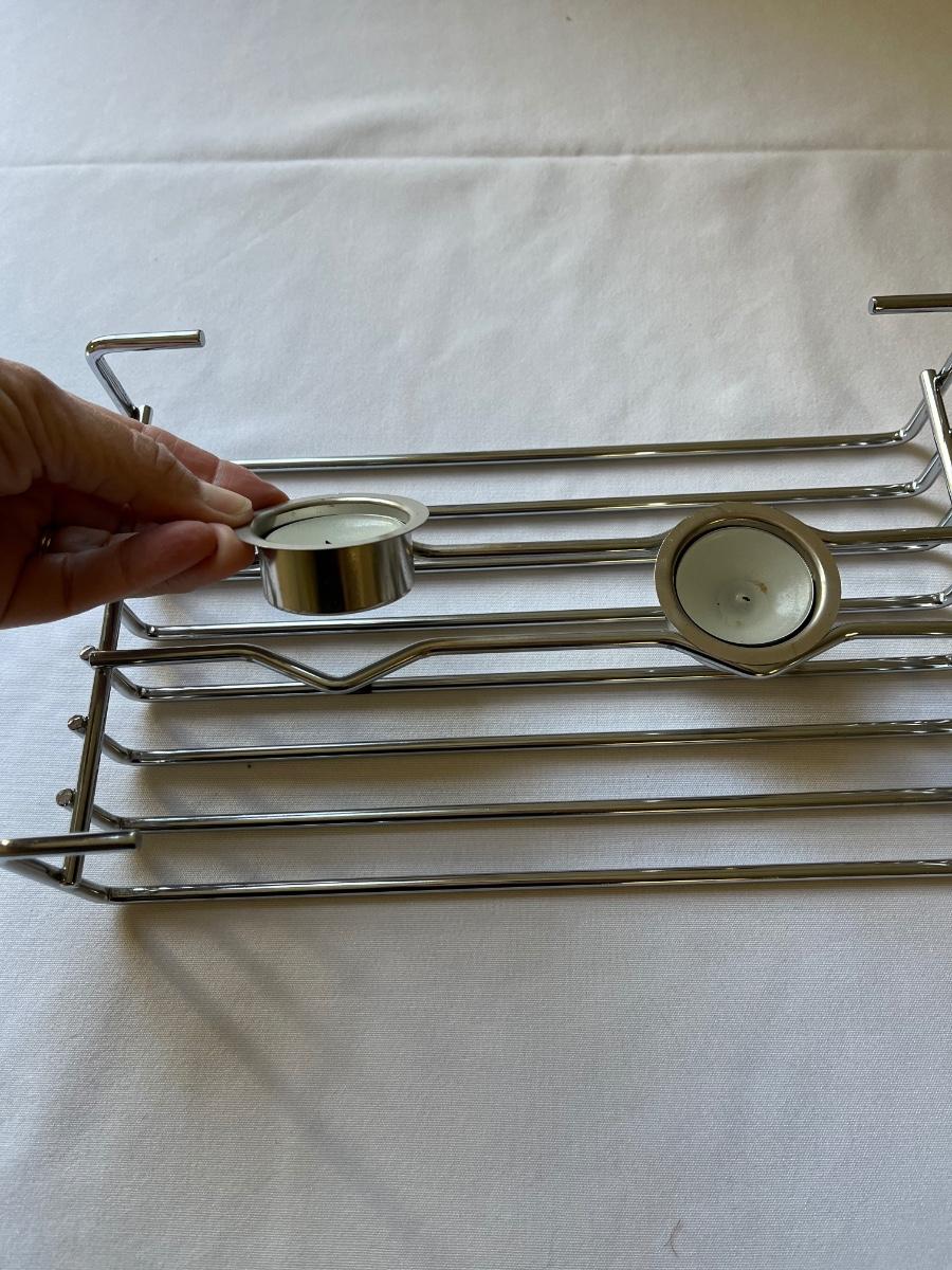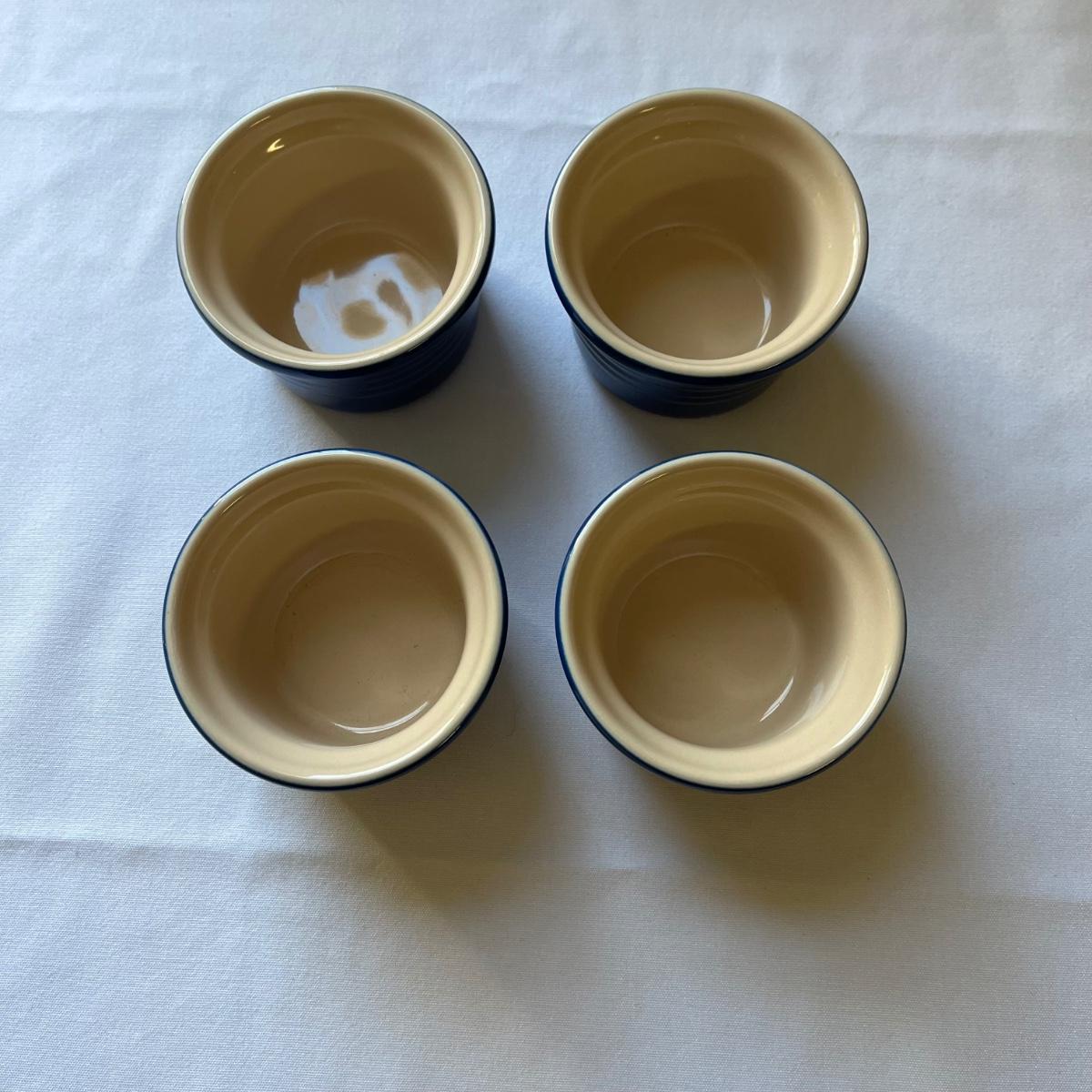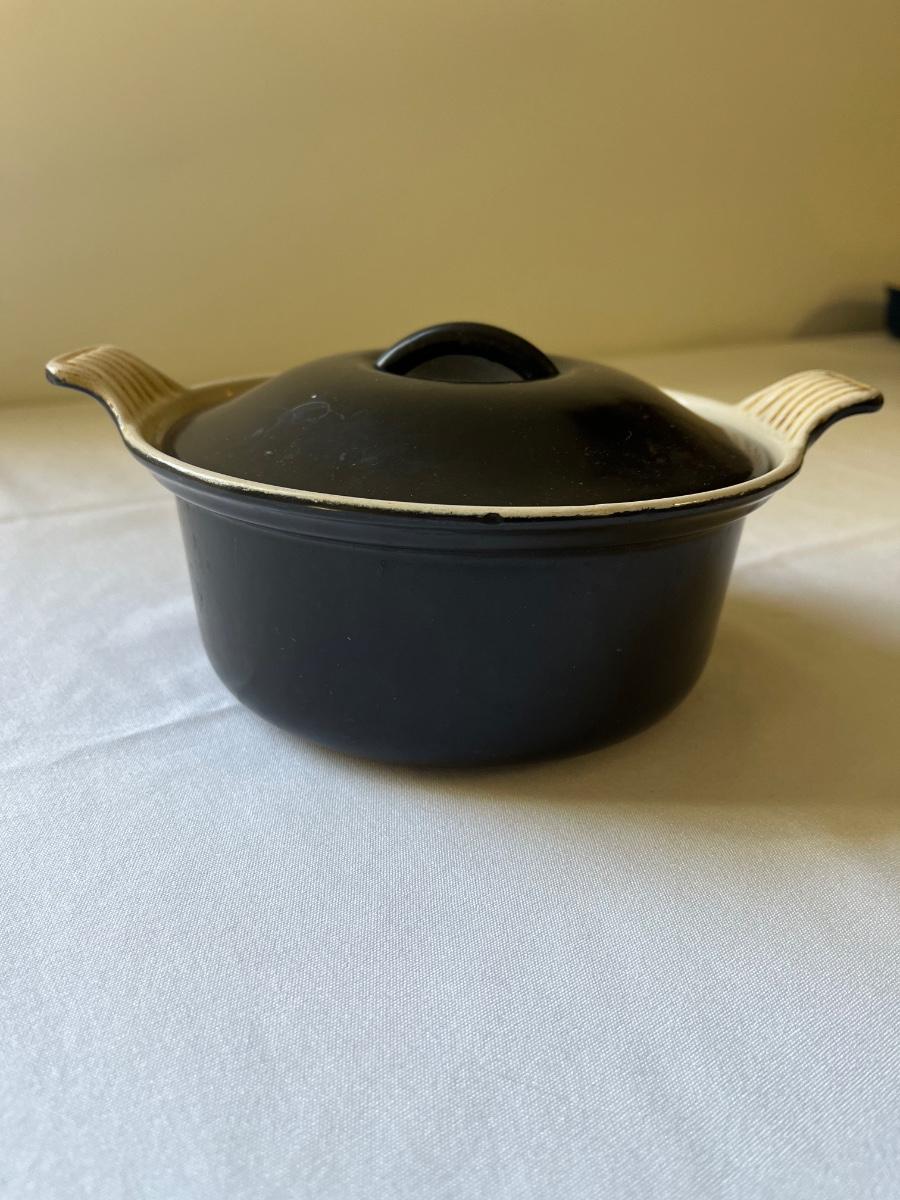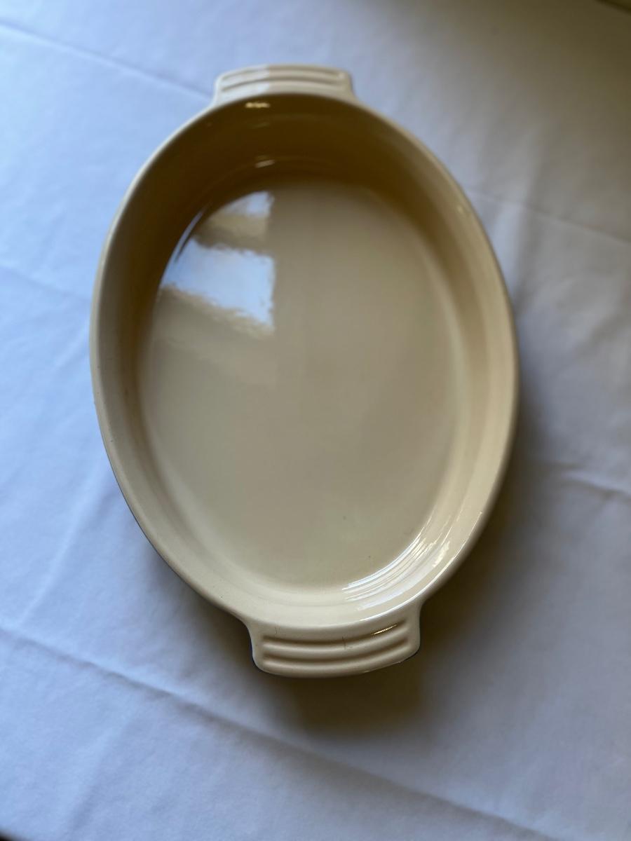 This includes beautiful blue ceramic stoneware by LeCreuset in a rectangular pan, overall size, 10” x 2” x 15”. And an oval pan measuring 10.75” x 2.5” x 16.25”. Also a LC smaller black lidded casserole dish measuring 7”D. Plus LC blue ramekins, 2” x 3.25”D and a chaffing stand that holds tea candles.