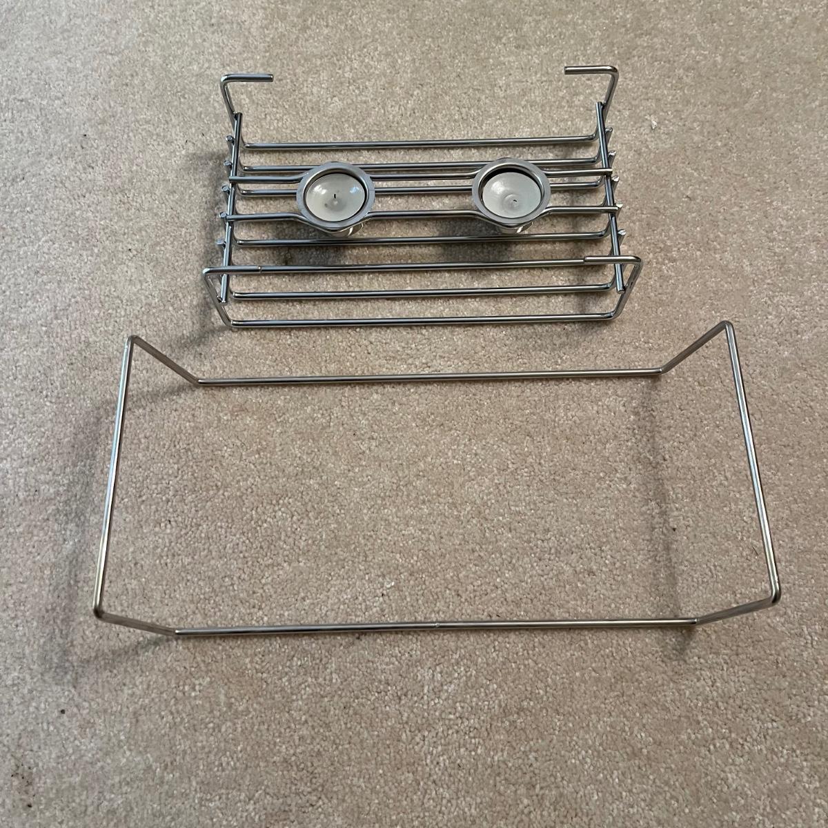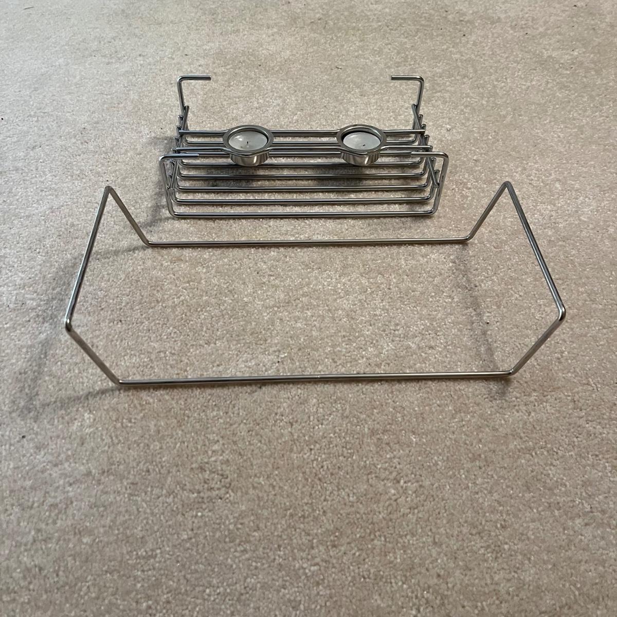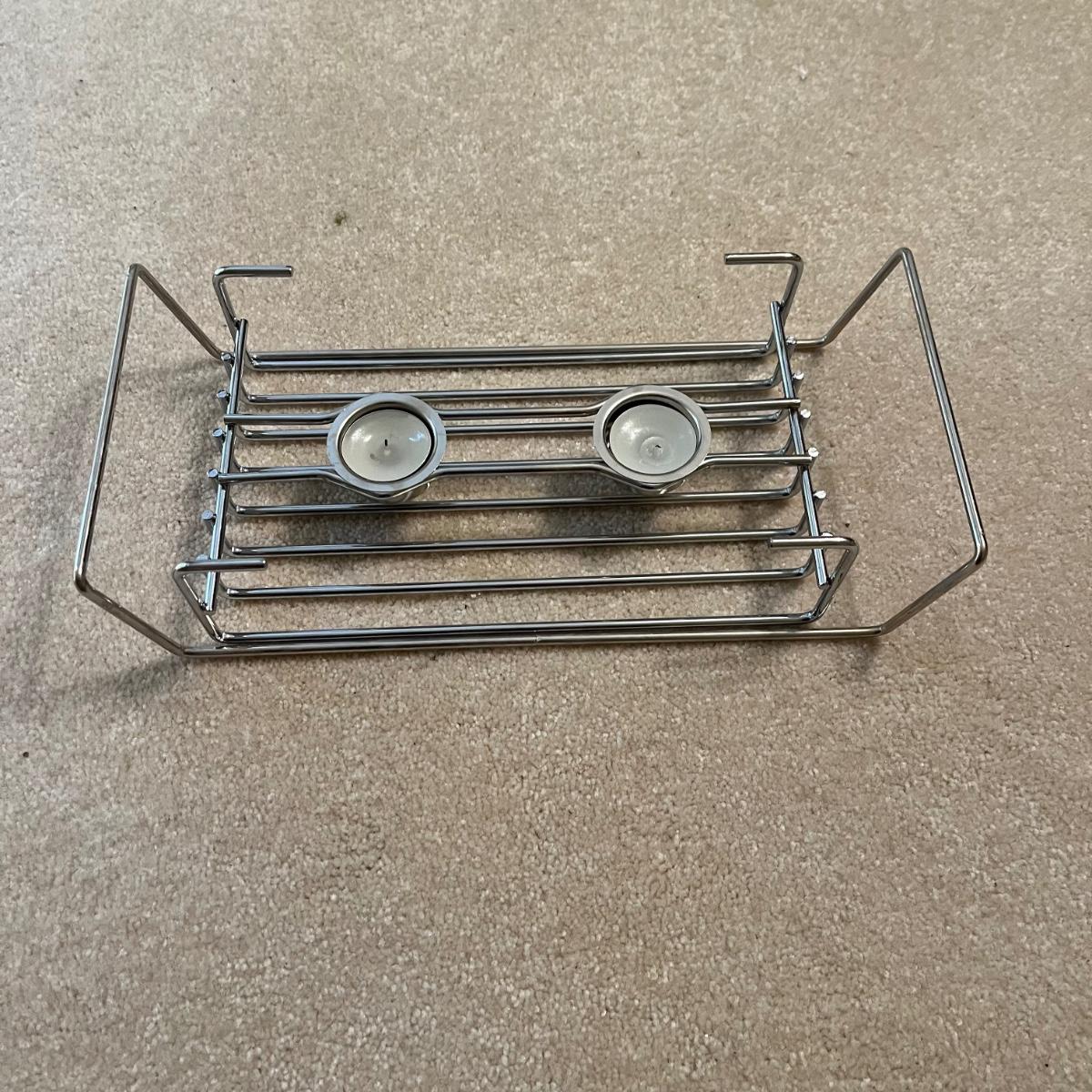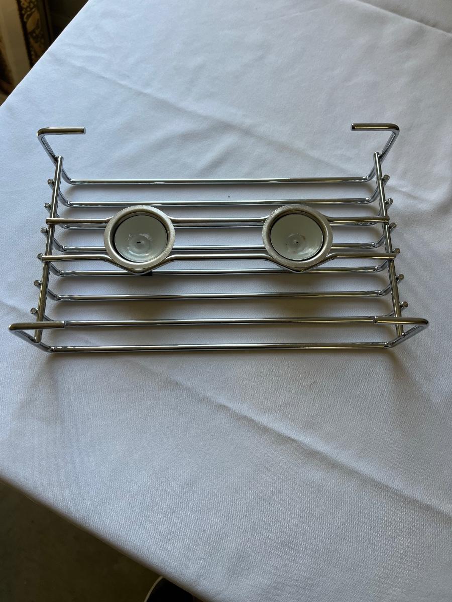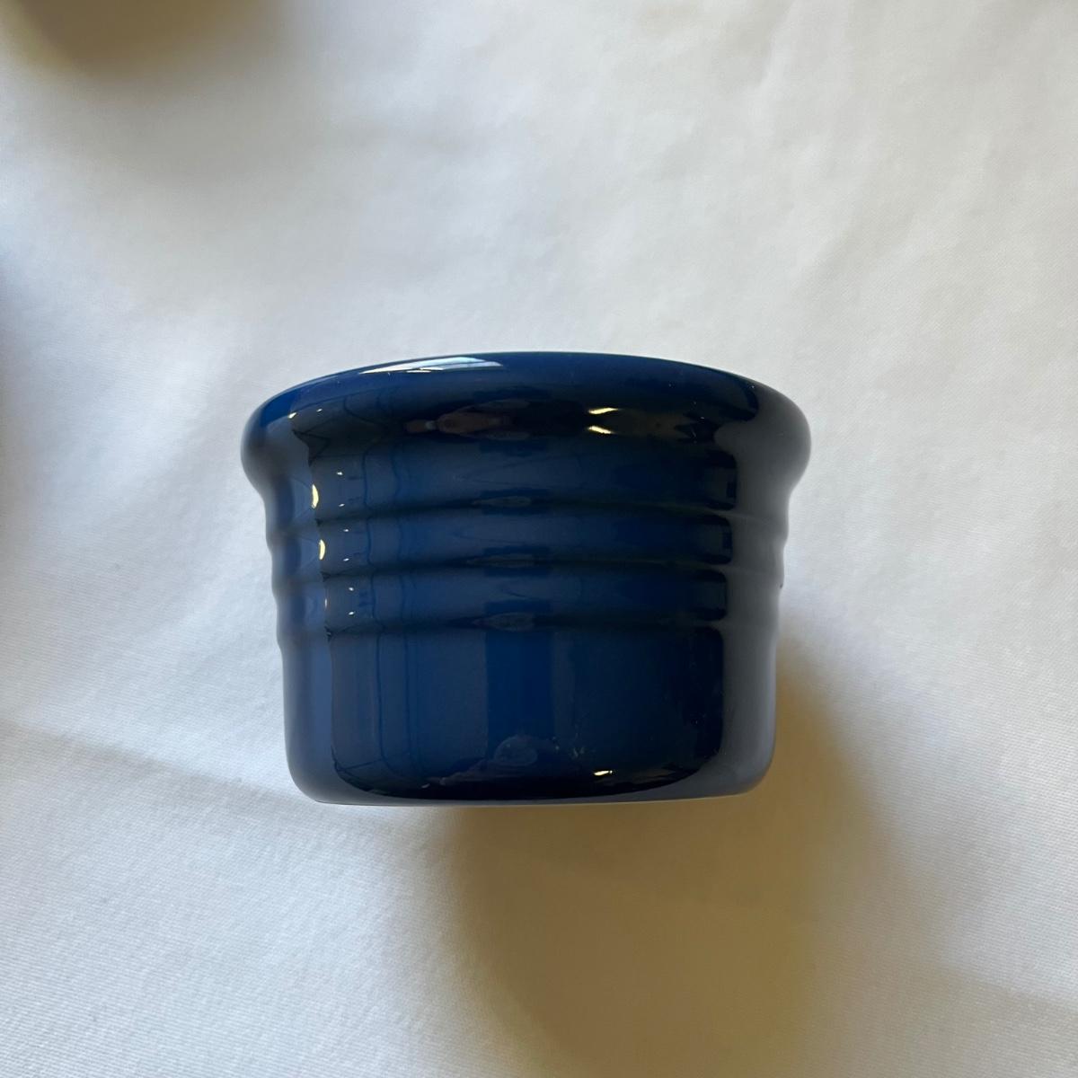 This includes beautiful blue ceramic stoneware by LeCreuset in a rectangular pan, overall size, 10” x 2” x 15”. And an oval pan measuring 10.75” x 2.5” x 16.25”. Also a LC smaller black lidded casserole dish measuring 7”D. Plus LC blue ramekins, 2” x 3.25”D and a chaffing stand that holds tea candles.