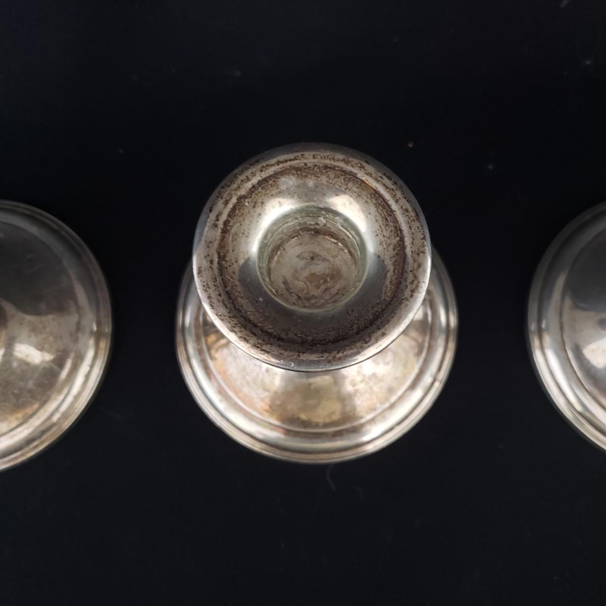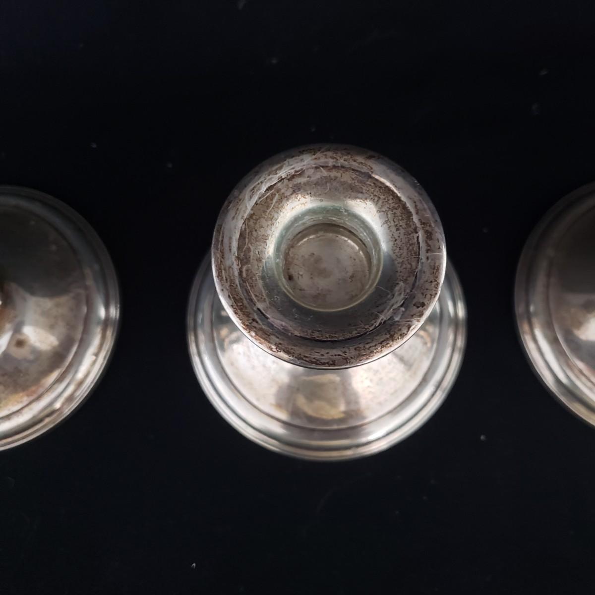 This ten piece Sterling candlestick lot contains three different sizes. The smallest ones from La Pierre measure approximately 3" x 3"H. The last pair pictured are engraved with "RM" and have a bent rim at the top on one of them.