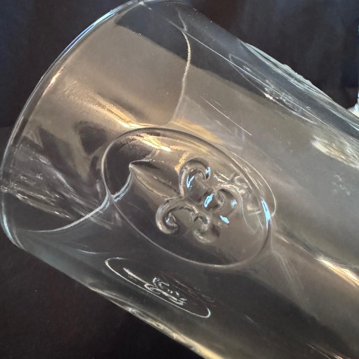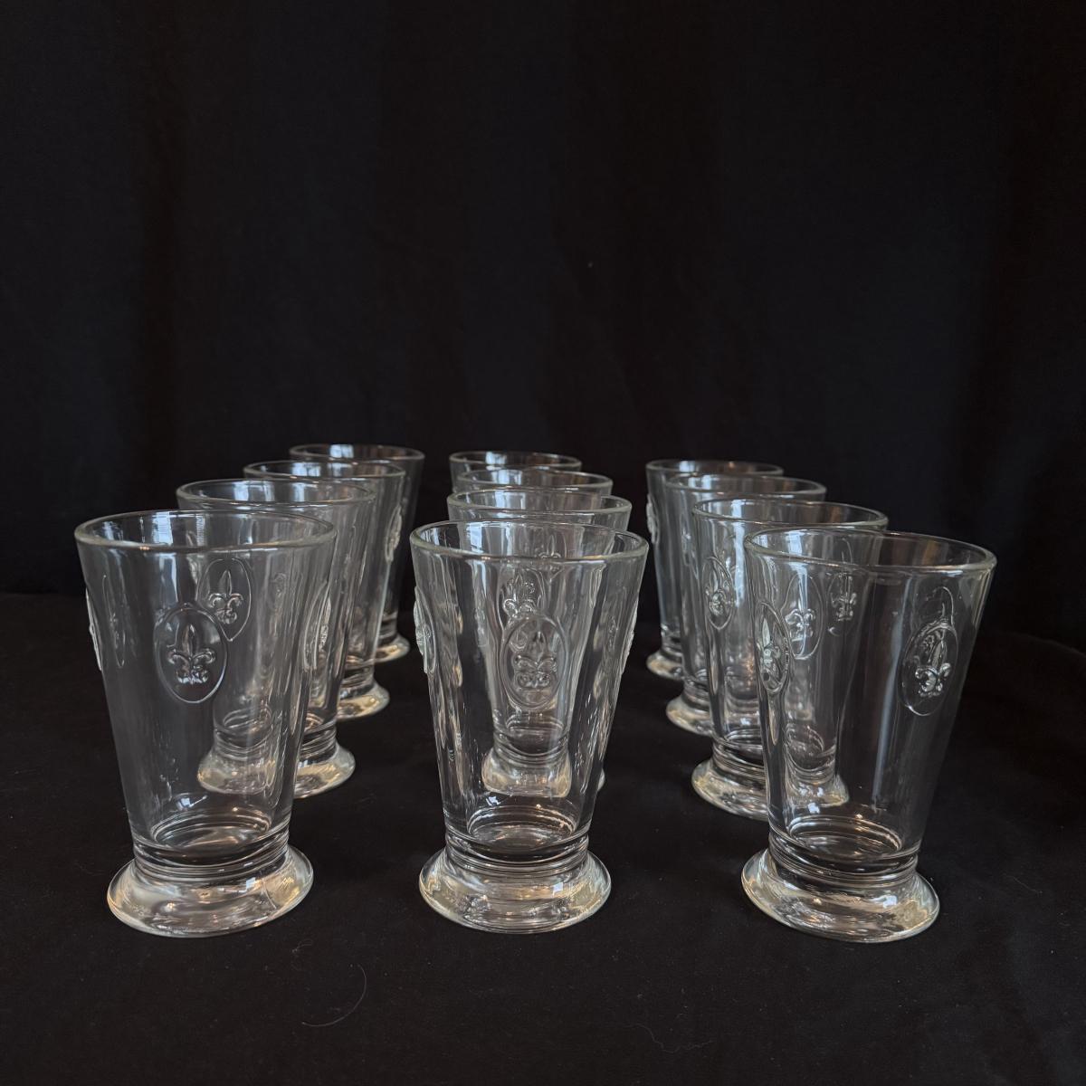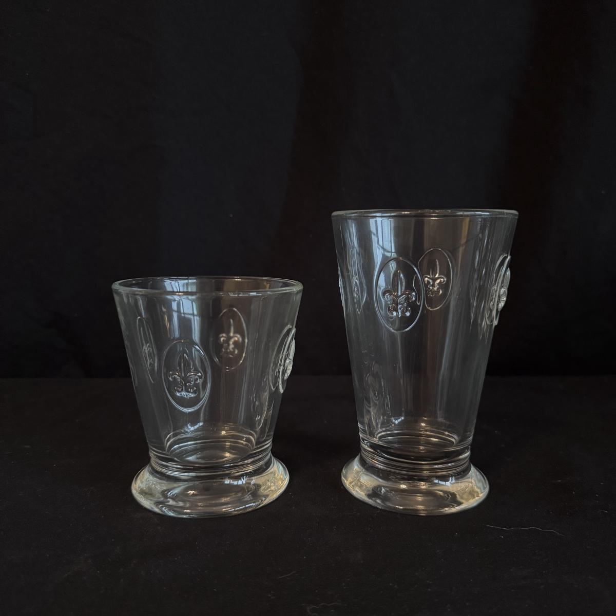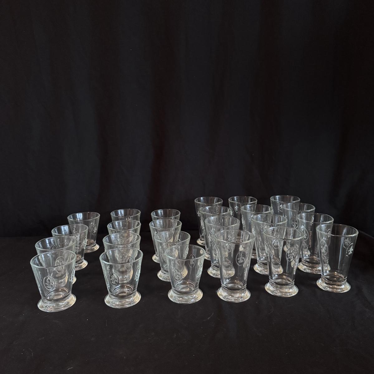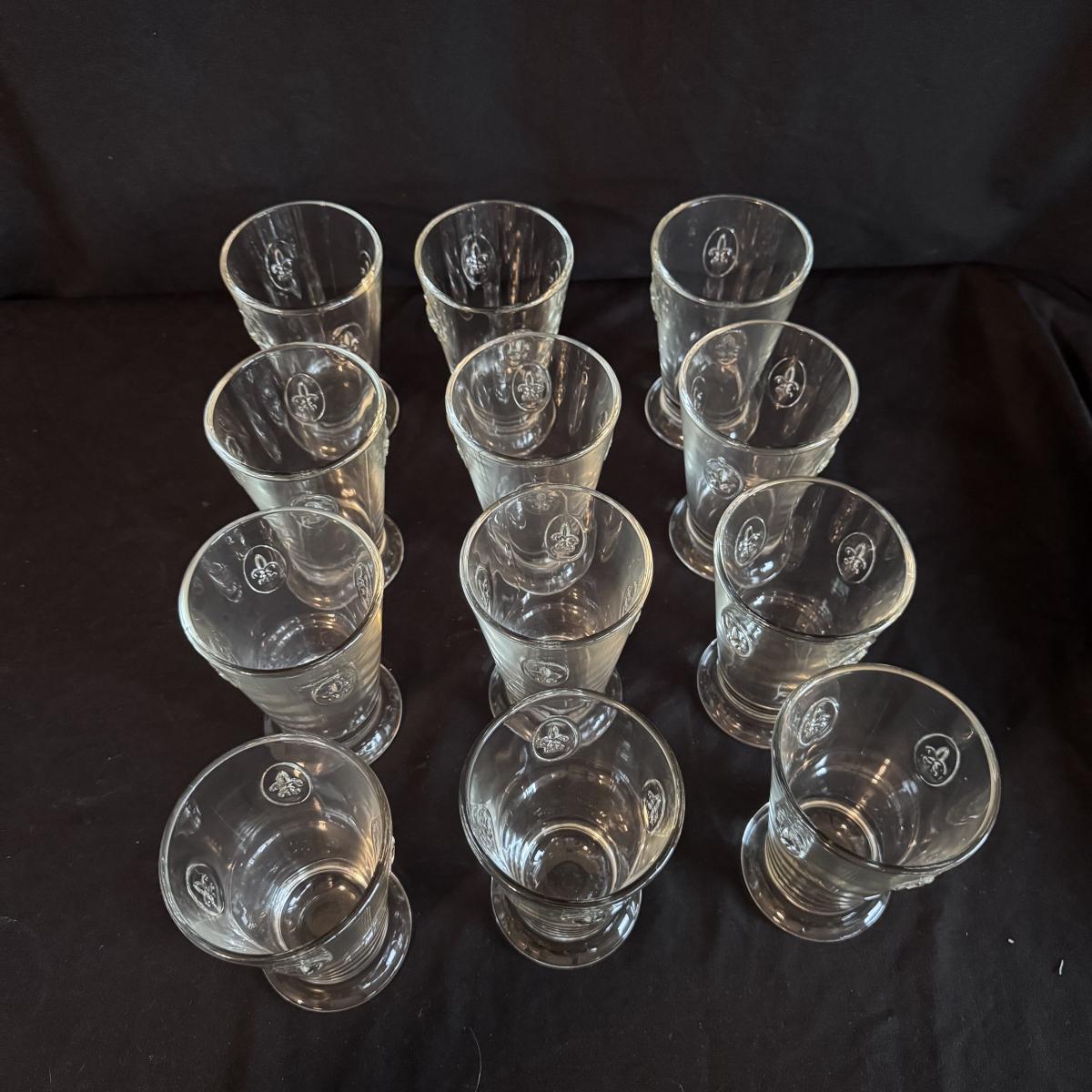 This lot of La Rochere glasses includes twelve short glasses and twelve taller - all from the ‘Fleur de Lys’ collection. The tallest glasses individually measure 3.25”D x 5.5”H. Shipping available.