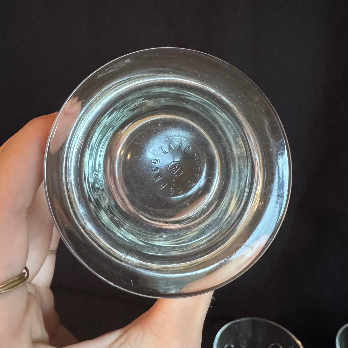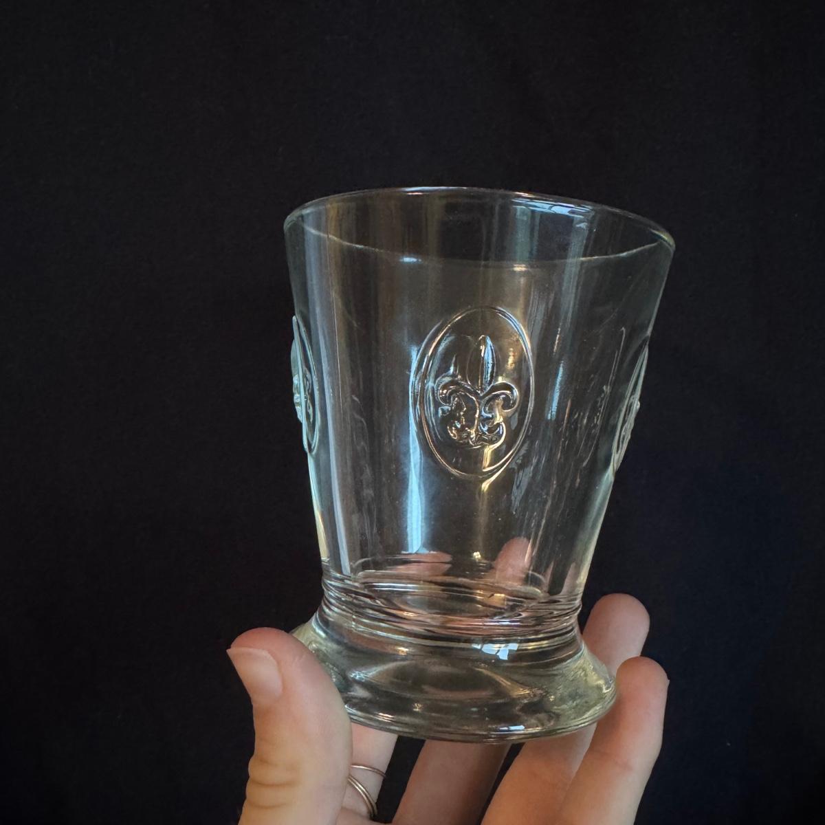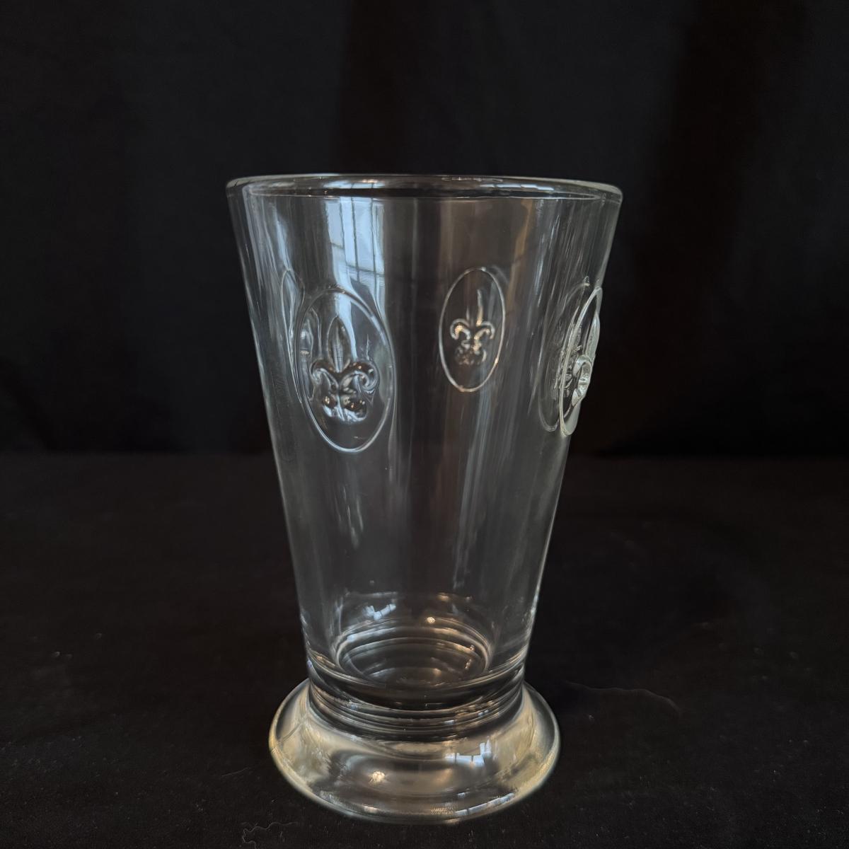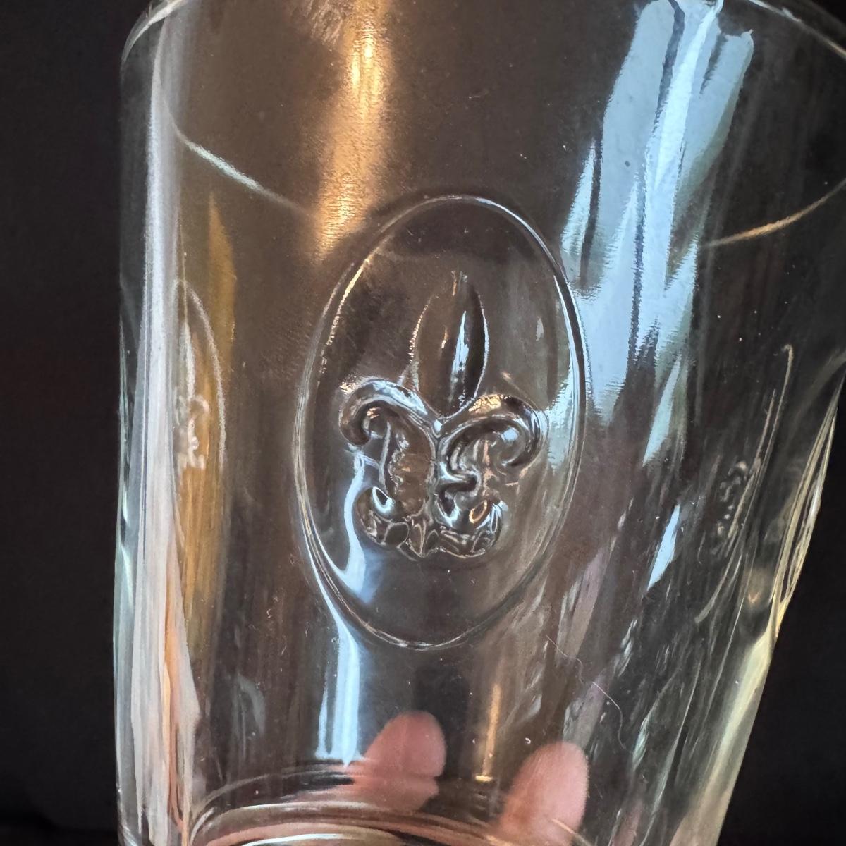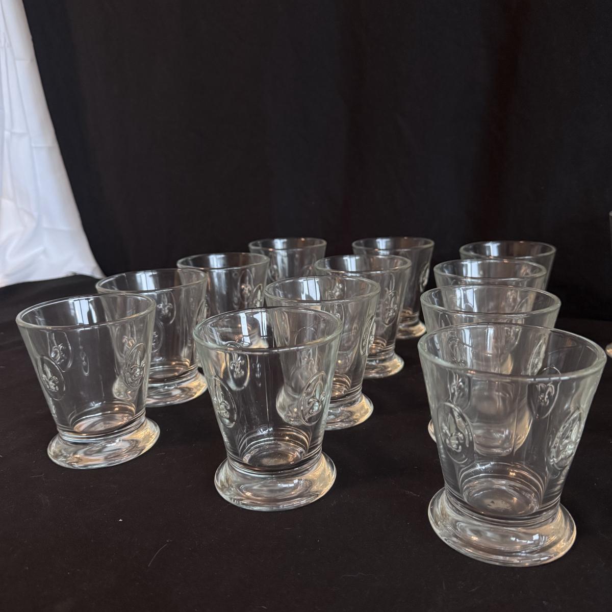 This lot of La Rochere glasses includes twelve short glasses and twelve taller - all from the ‘Fleur de Lys’ collection. The tallest glasses individually measure 3.25”D x 5.5”H. Shipping available.