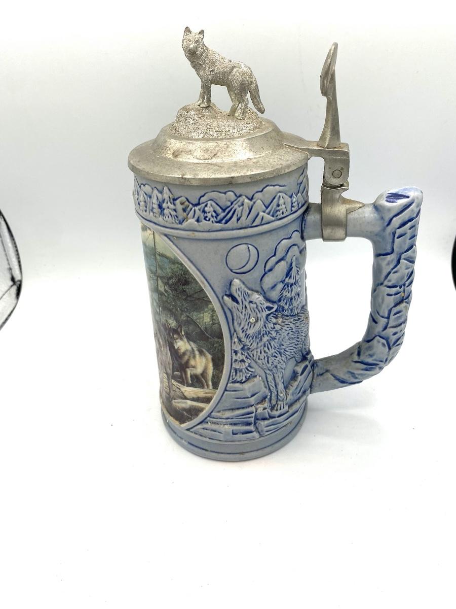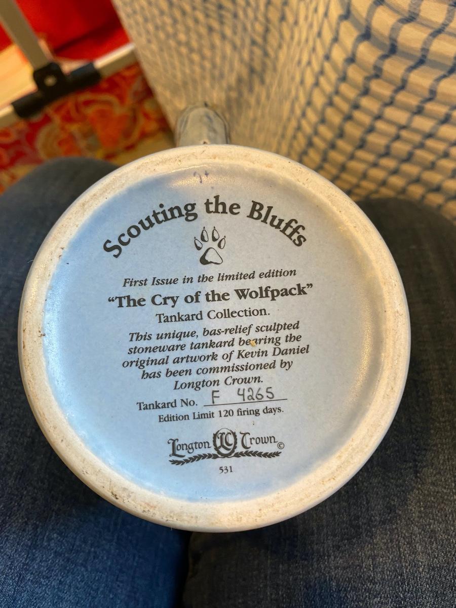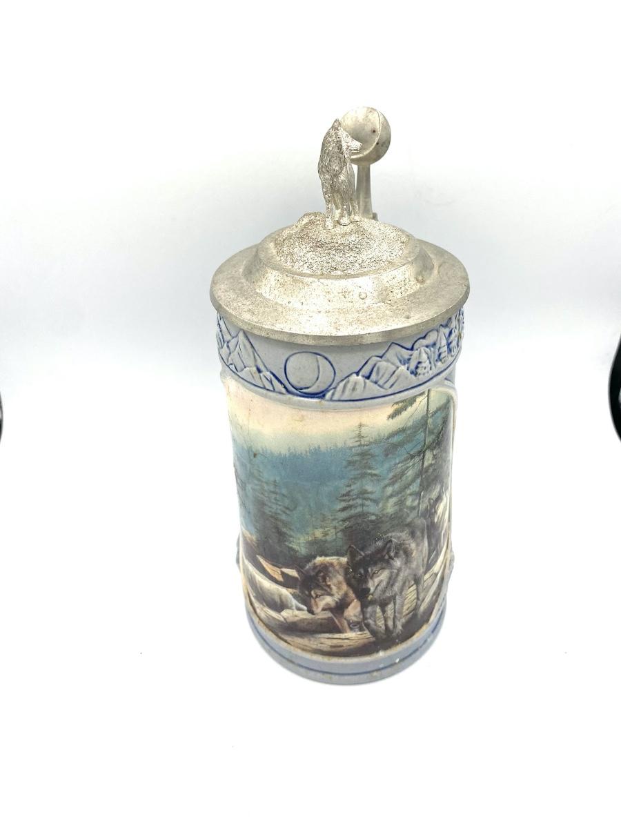 Lonton Crown Tankard, "Scouting The Bluffs' from "The Cry of the Wolfpack" collection,. Tankard No. F 4265. 9" base to top, handle to front of tankard 6". MINT condition