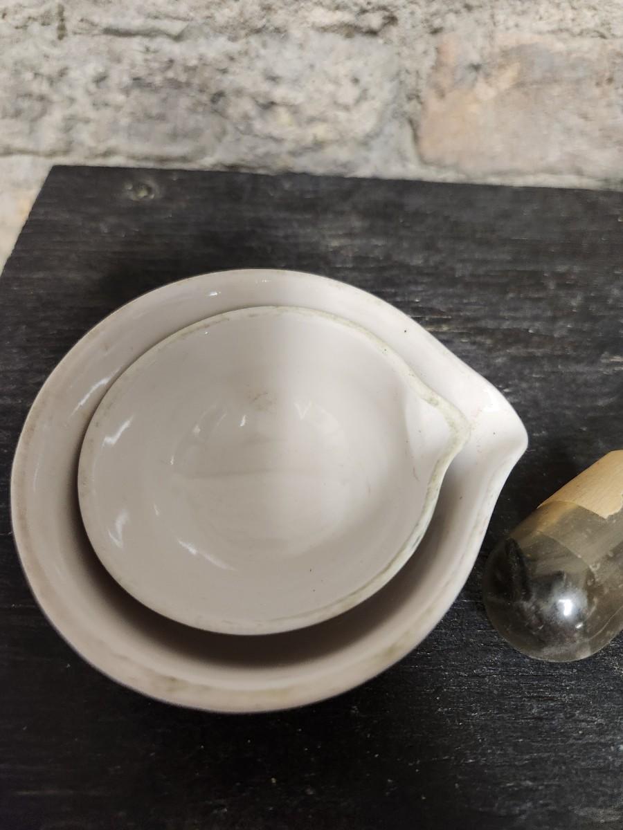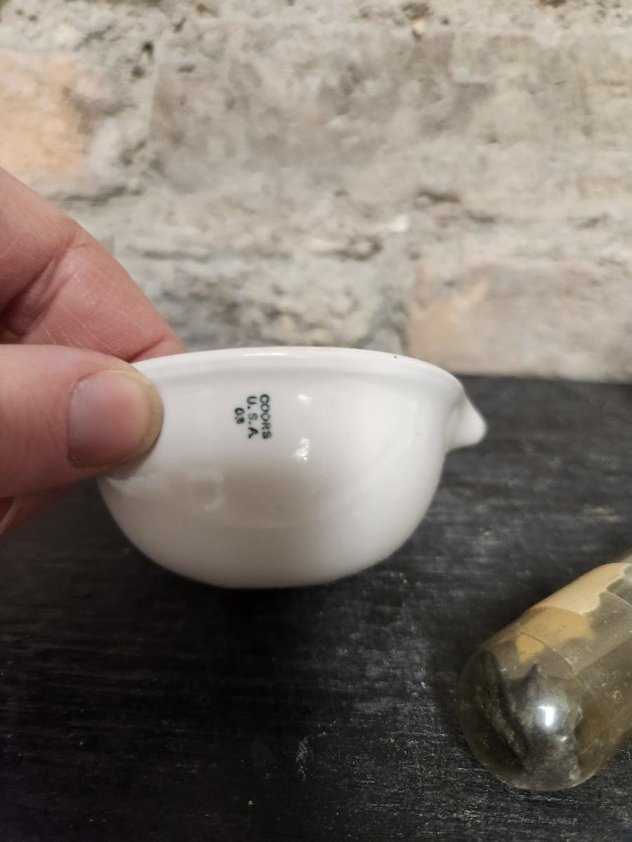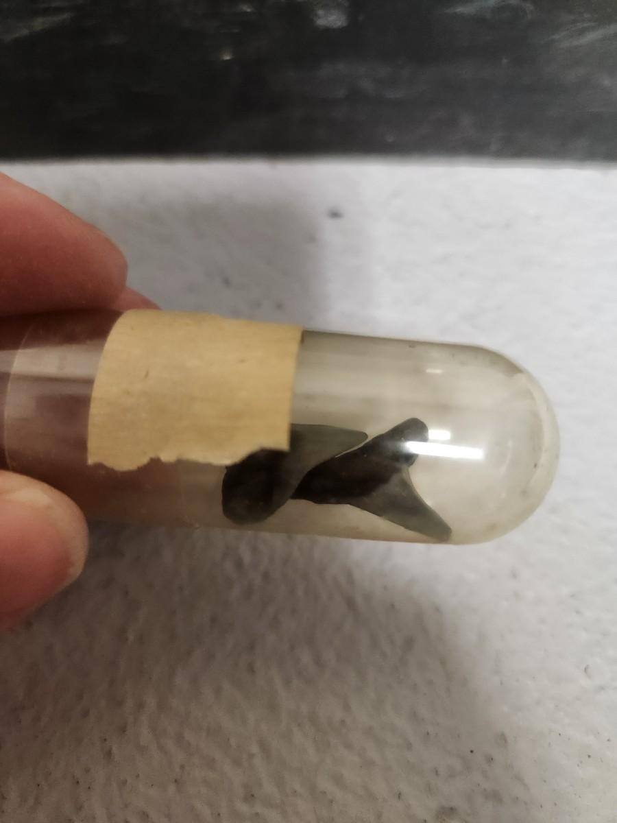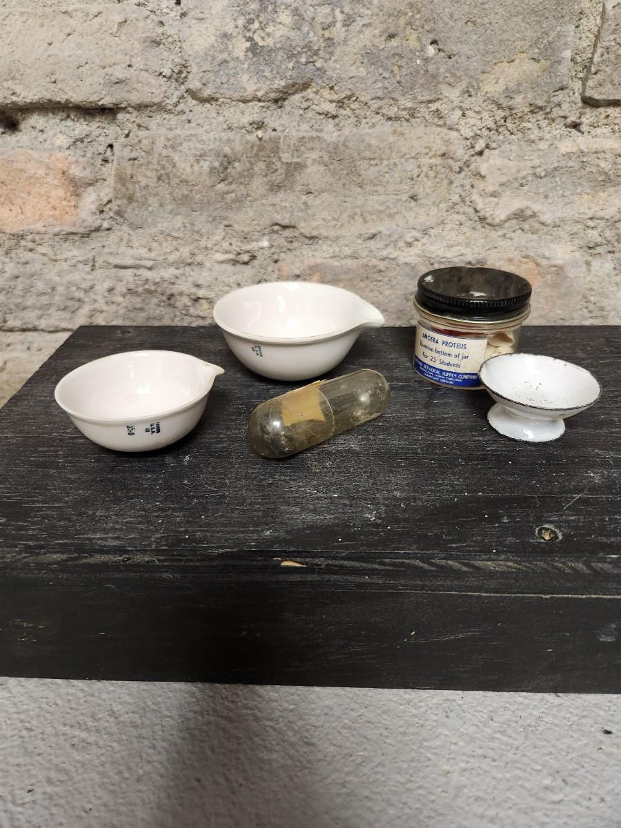 Remnants of a professors estate. 2 small porcelain bowls marks Coors. A pair of shark teeth and a container of misc other teeth and a random enamelware salt...probably used for something else in this setting.
