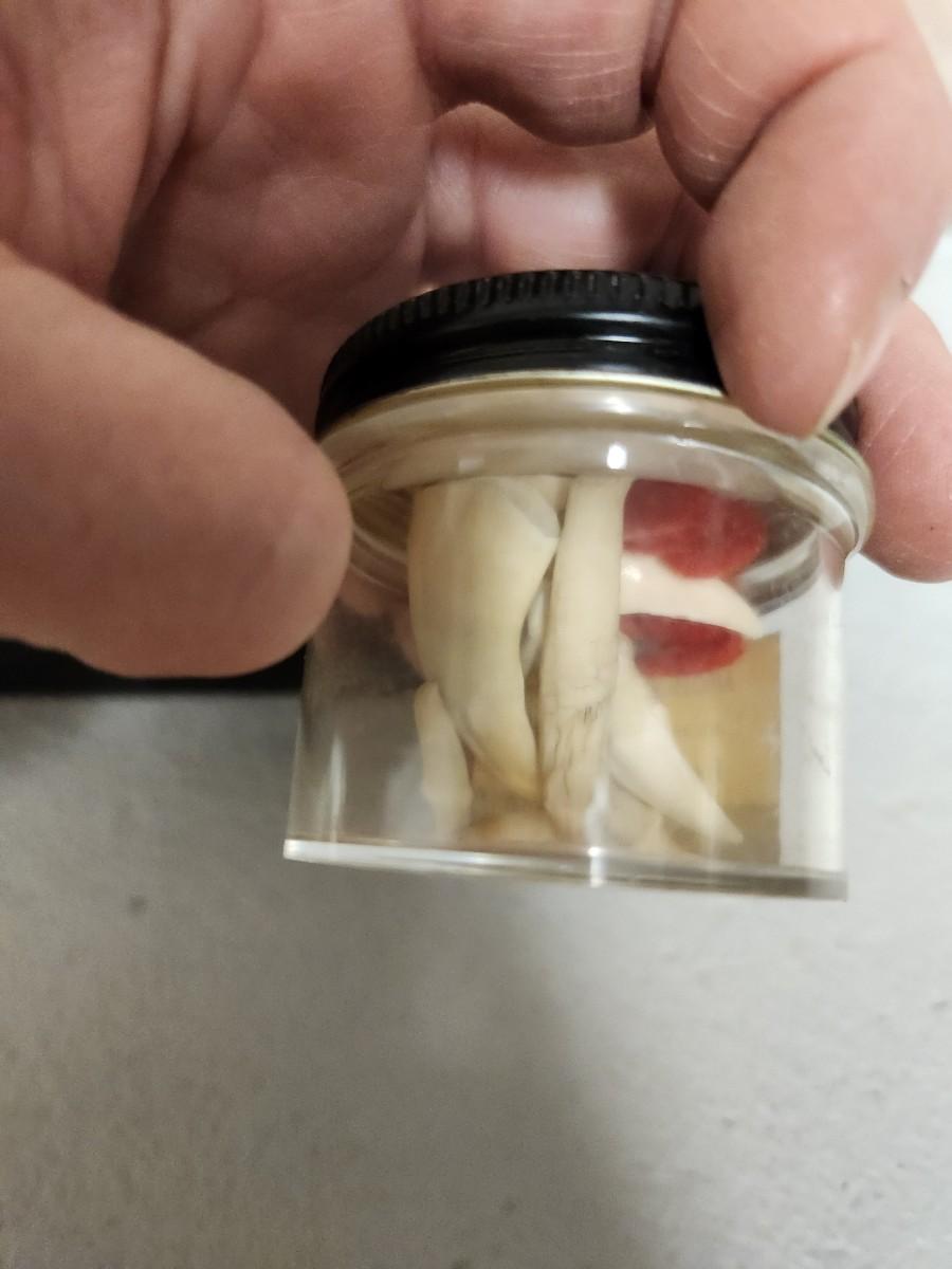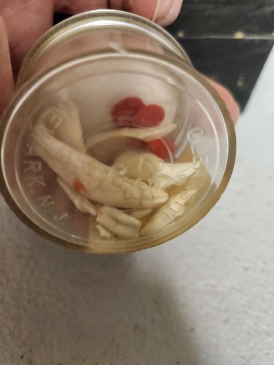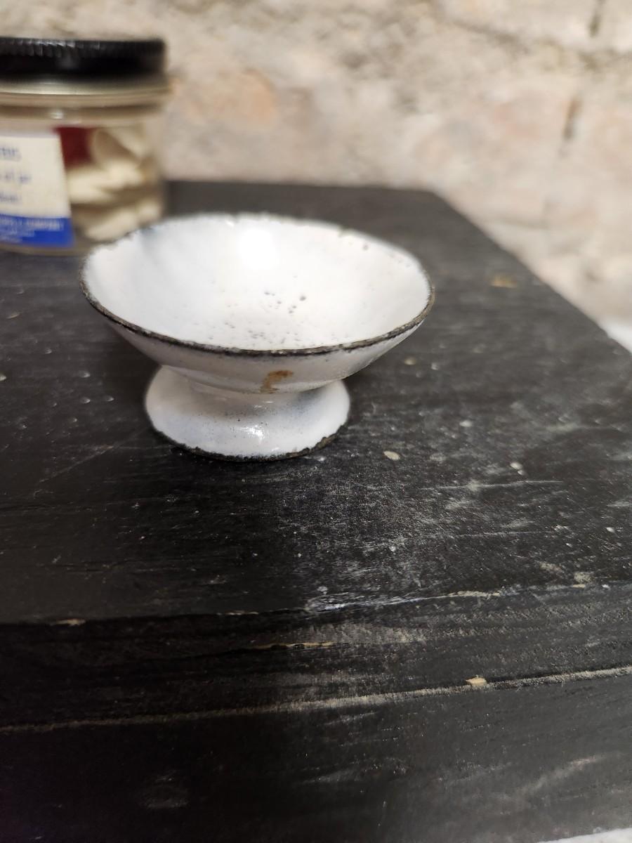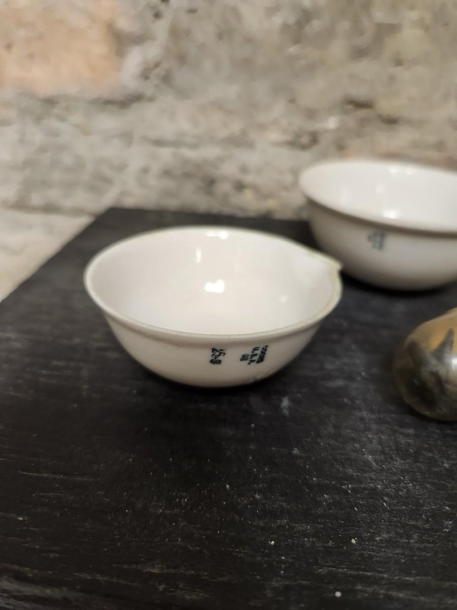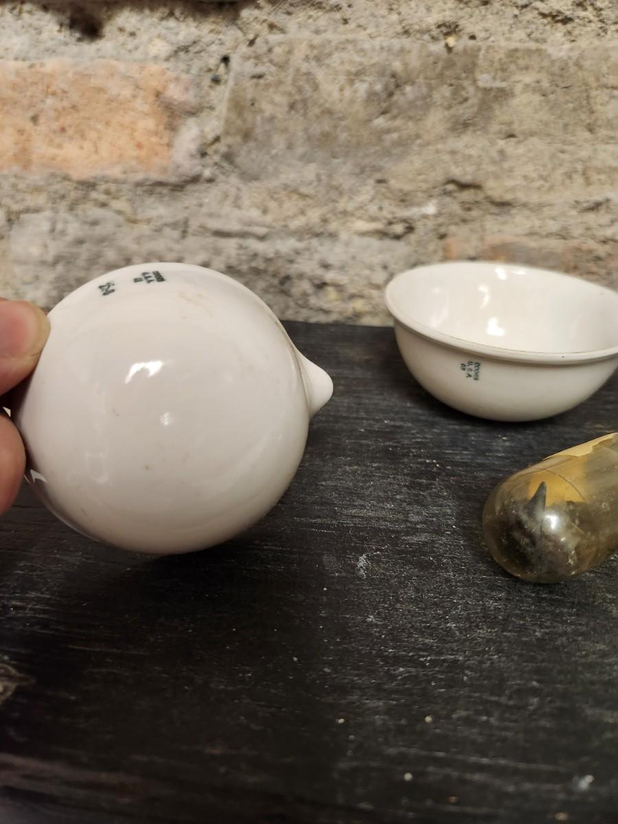 Remnants of a professors estate. 2 small porcelain bowls marks Coors. A pair of shark teeth and a container of misc other teeth and a random enamelware salt...probably used for something else in this setting.