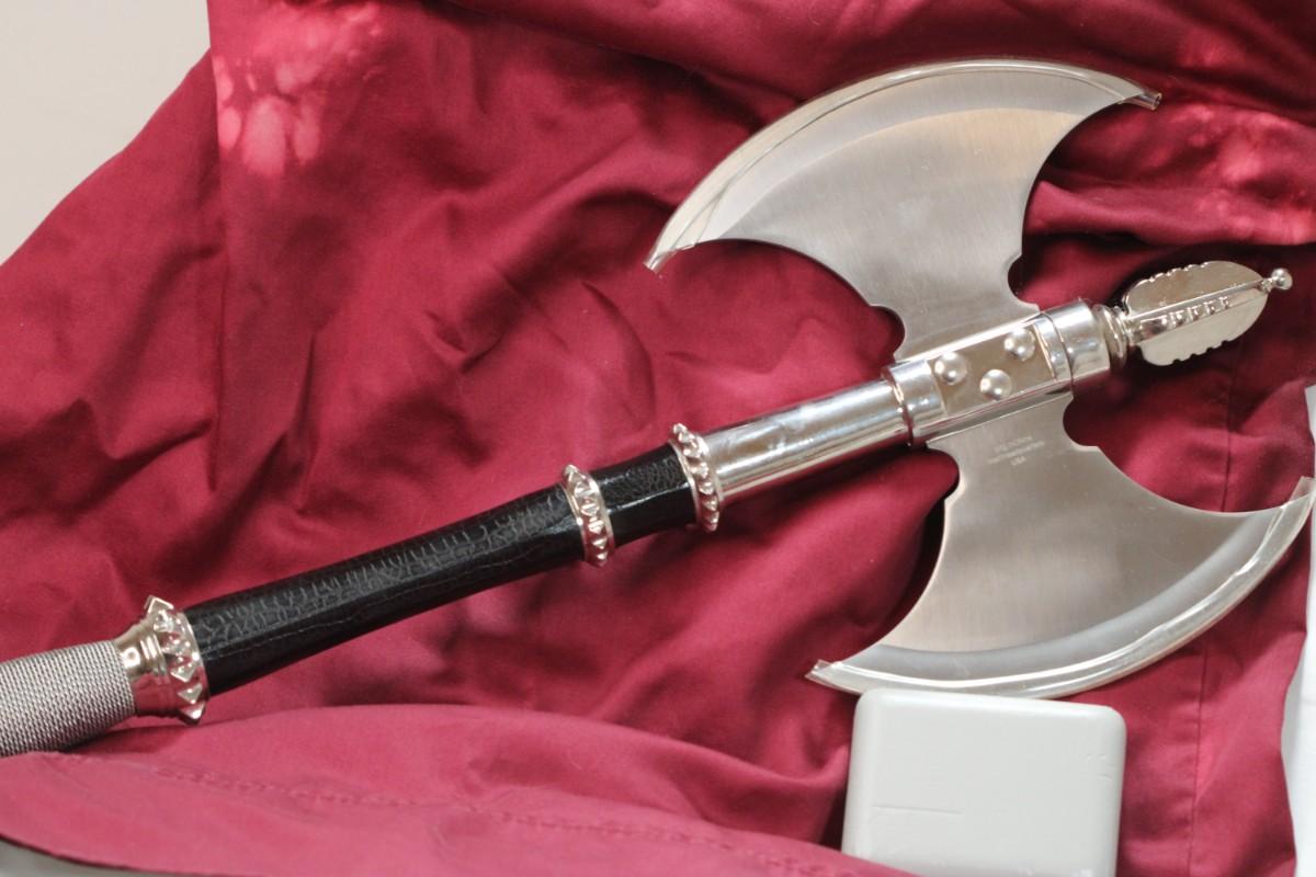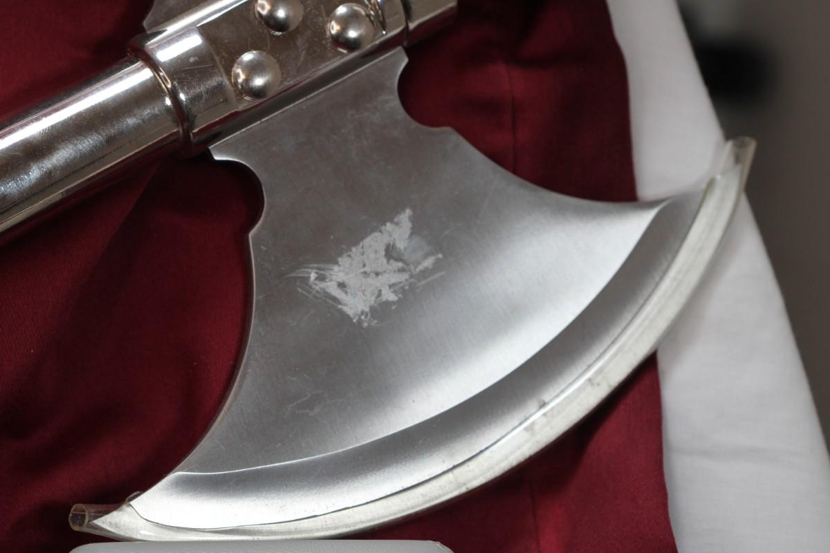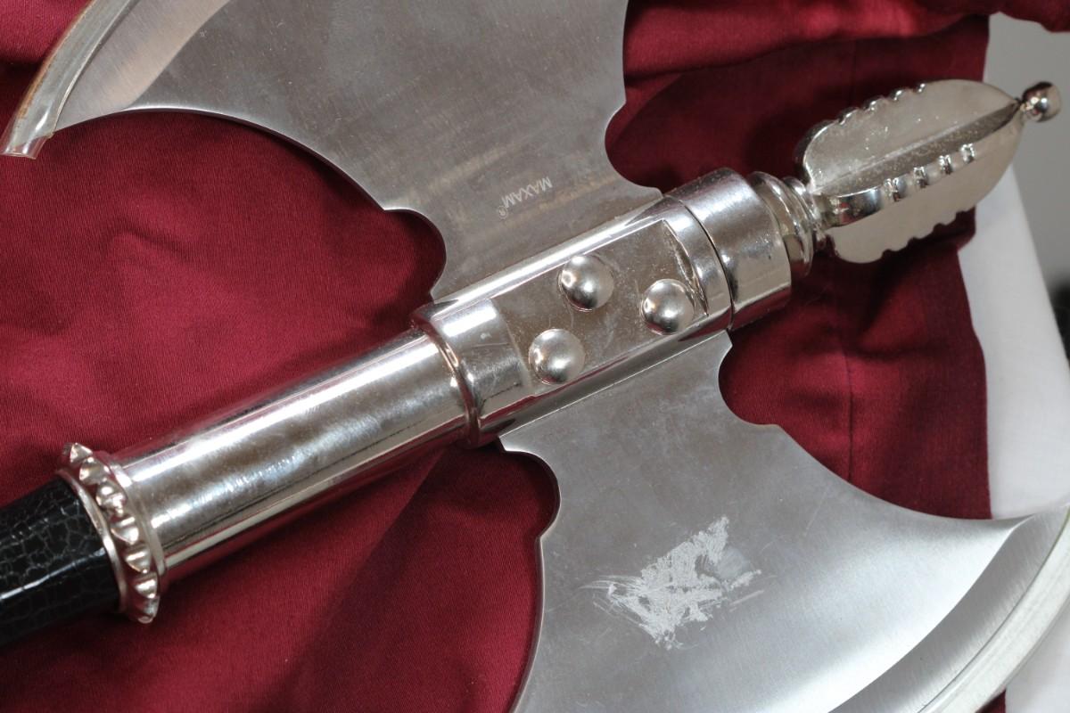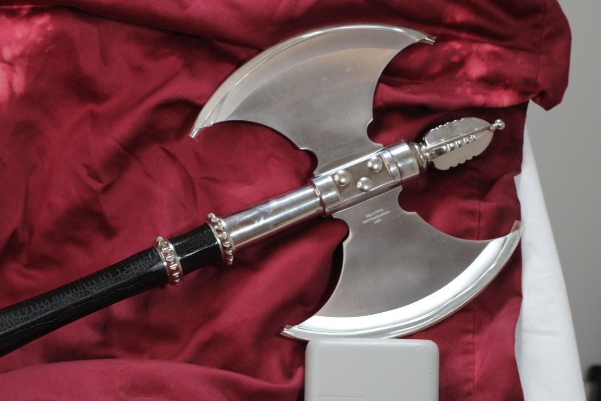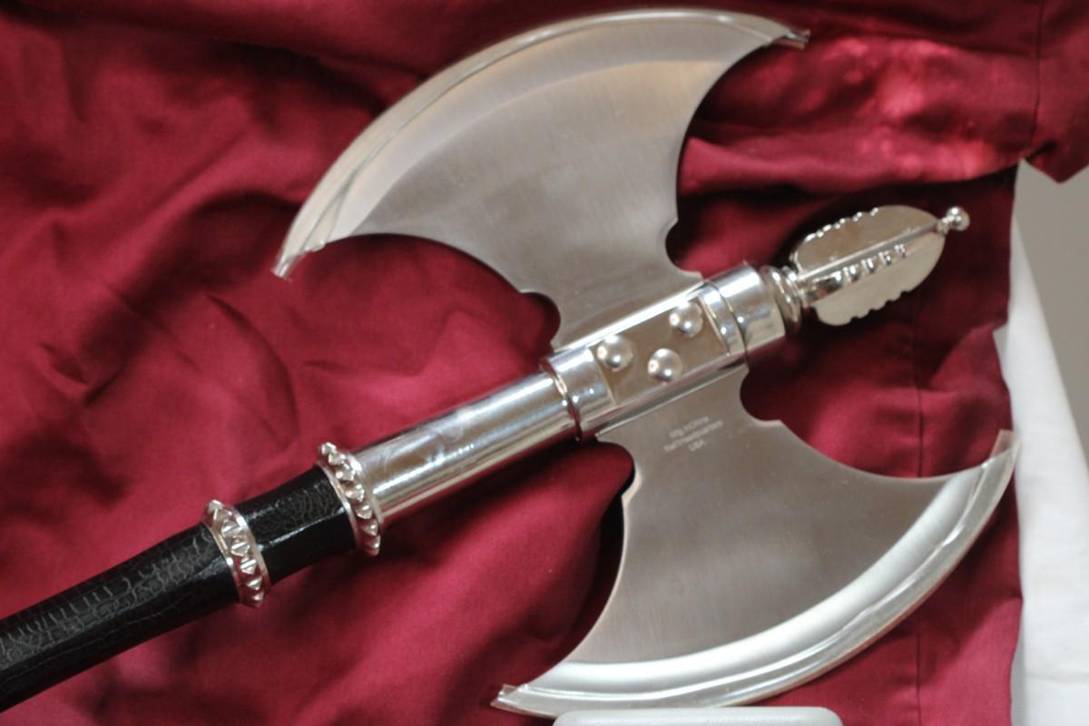 Must be 21 years old, this is a repro but a real axe with 2- 7 in Blades made of steel, not aluminum, Solid handle 6.5 in with a stem lenght of 22 inches from top to bottom. Protective covers on blade very sharp, not a toy for collectors could not be used as movie props .Greek copy of the famous "Labry Axe". ALL SOLID HANDLES AND METAL ATTACHMENTS.
