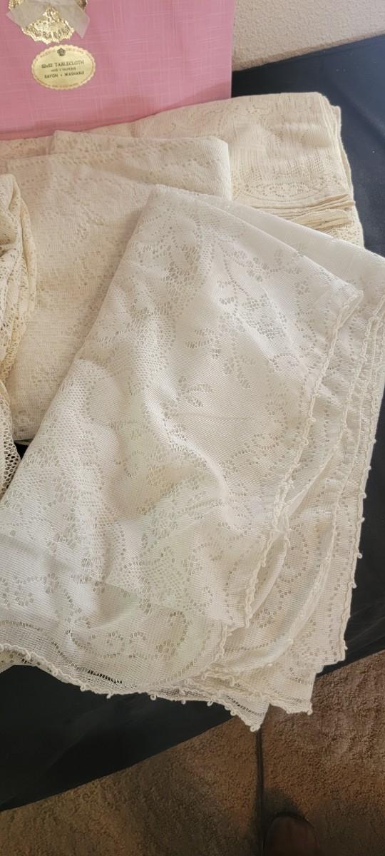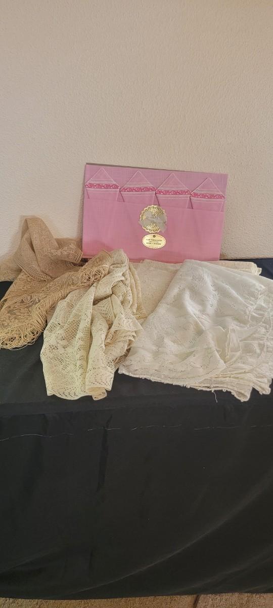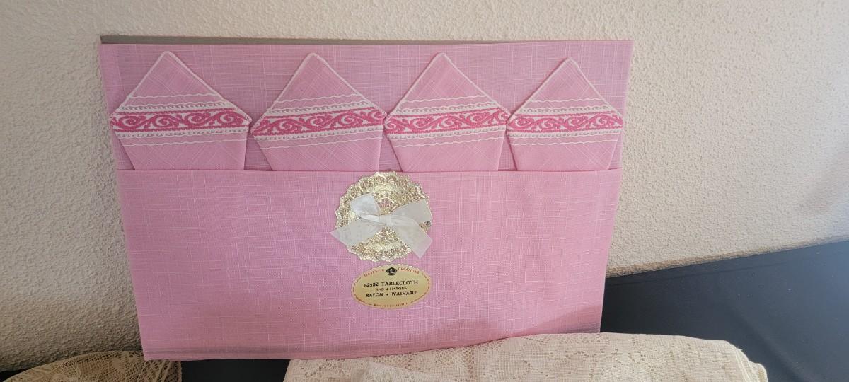 52 x 52 rayon pink tablecloth and napkins, four lace tablecloths, lace runner