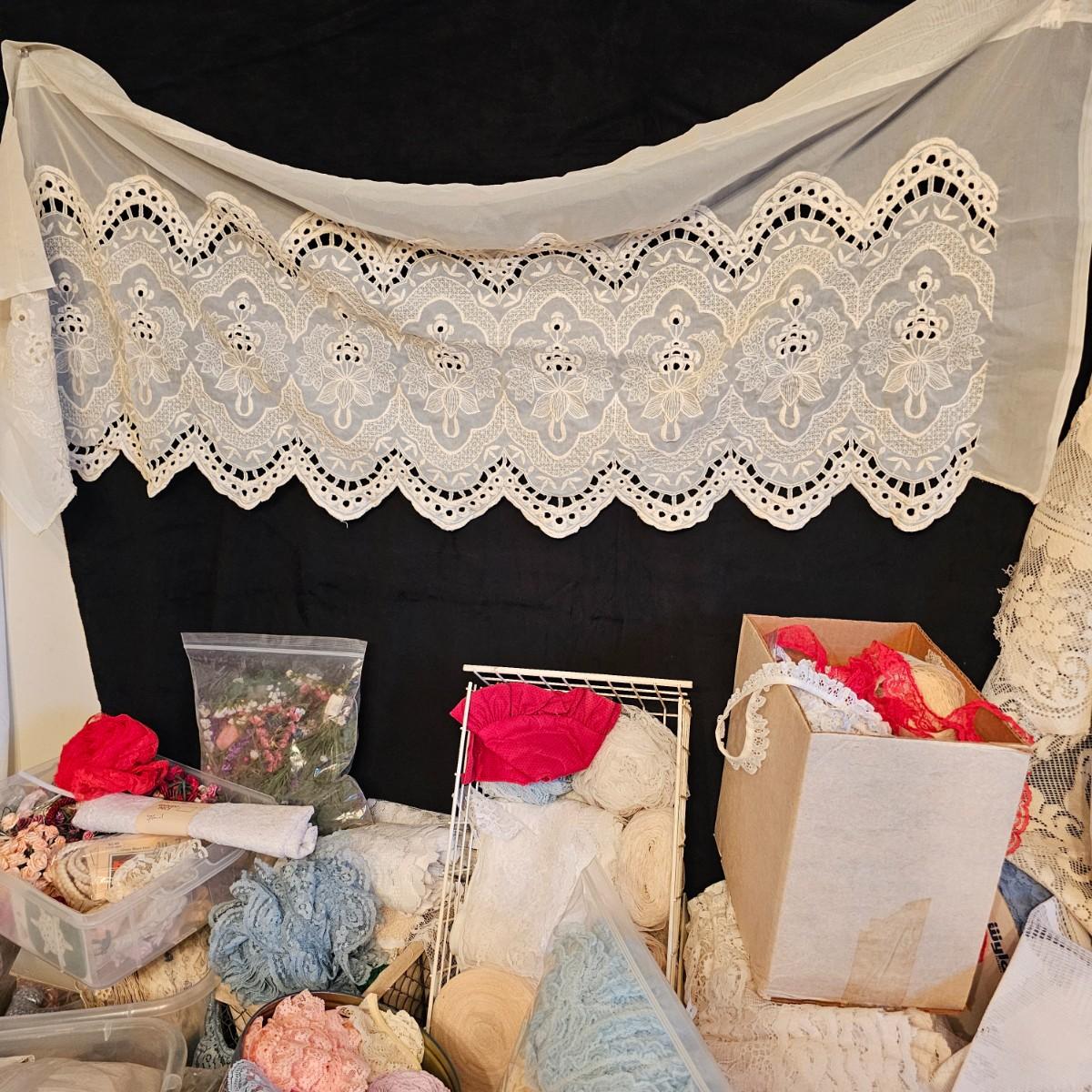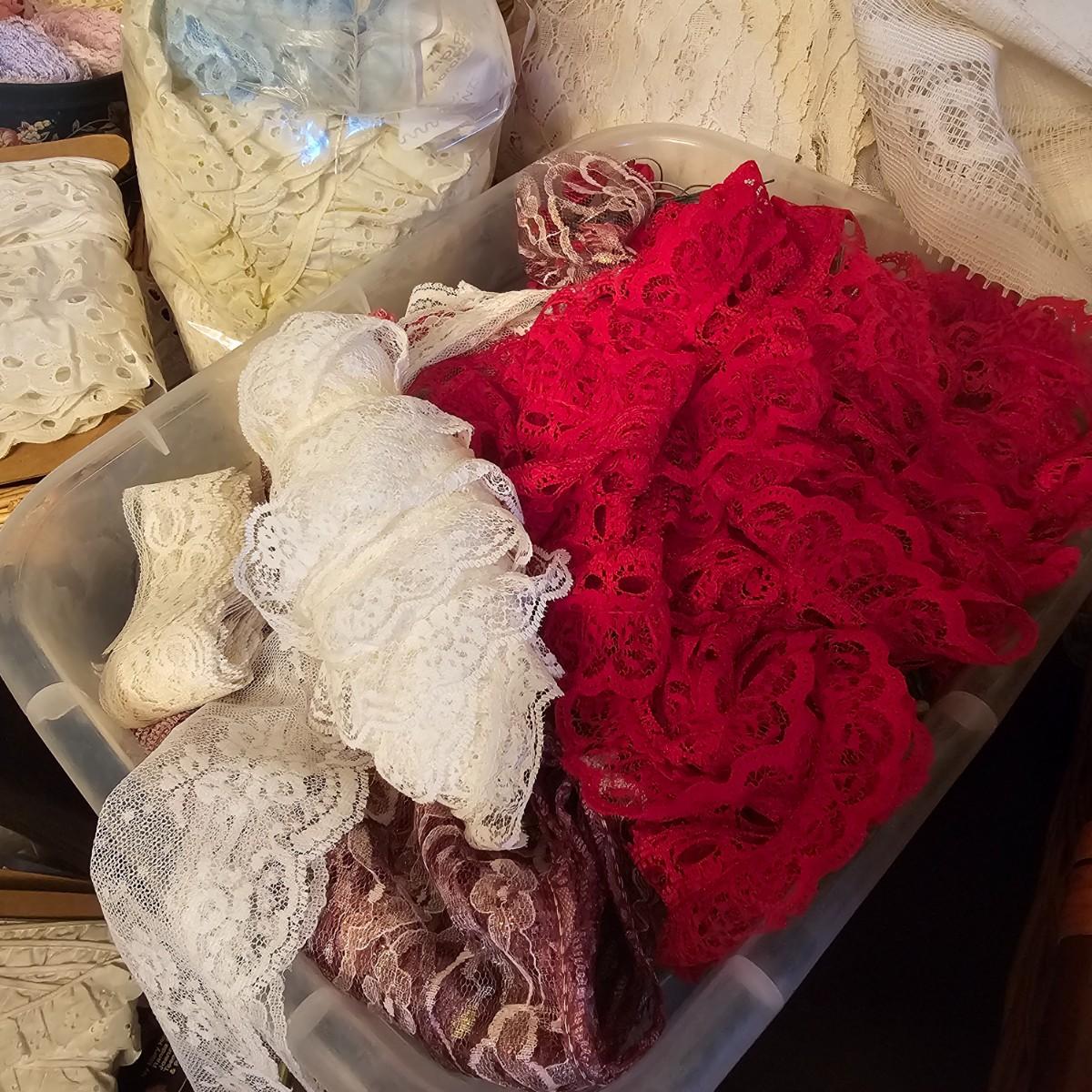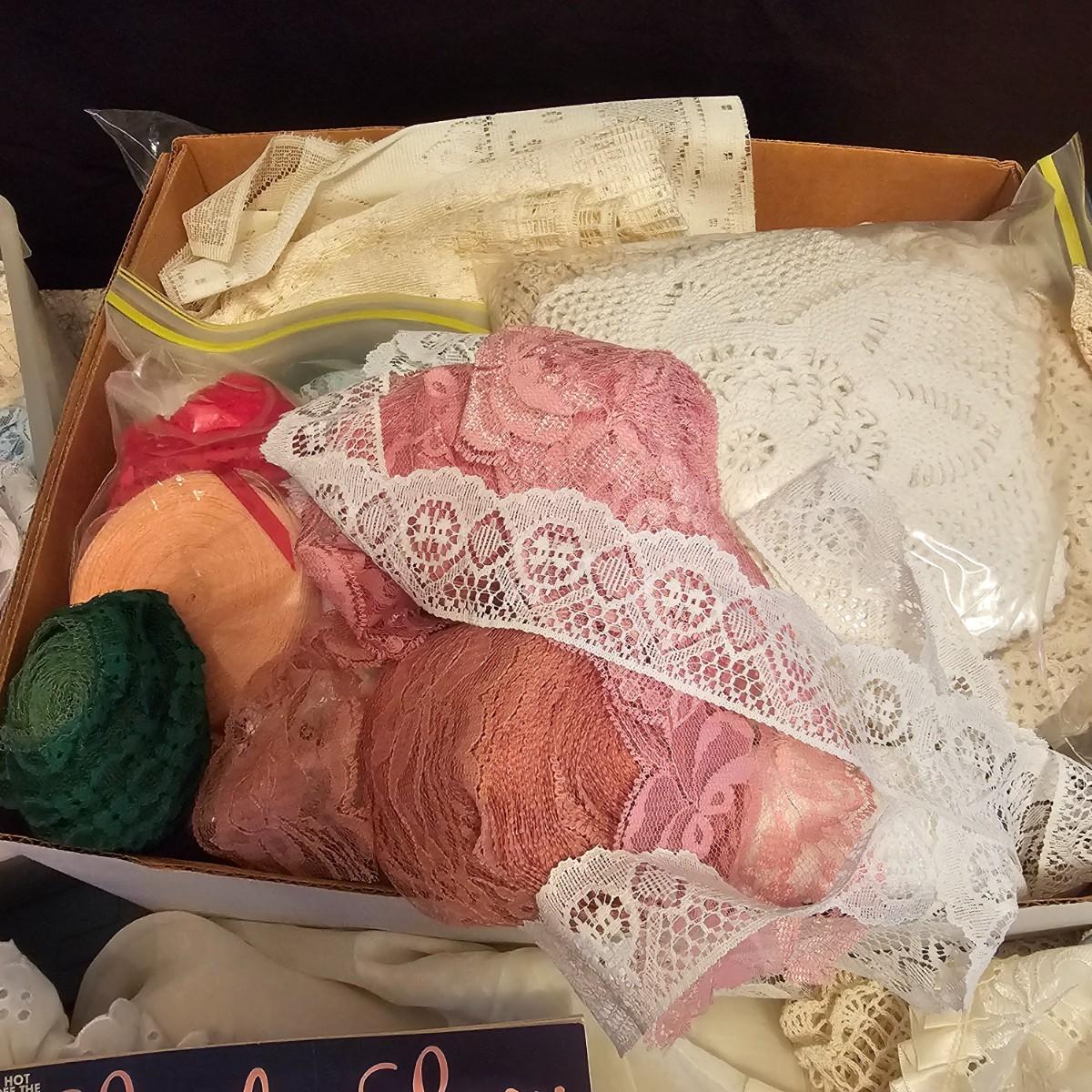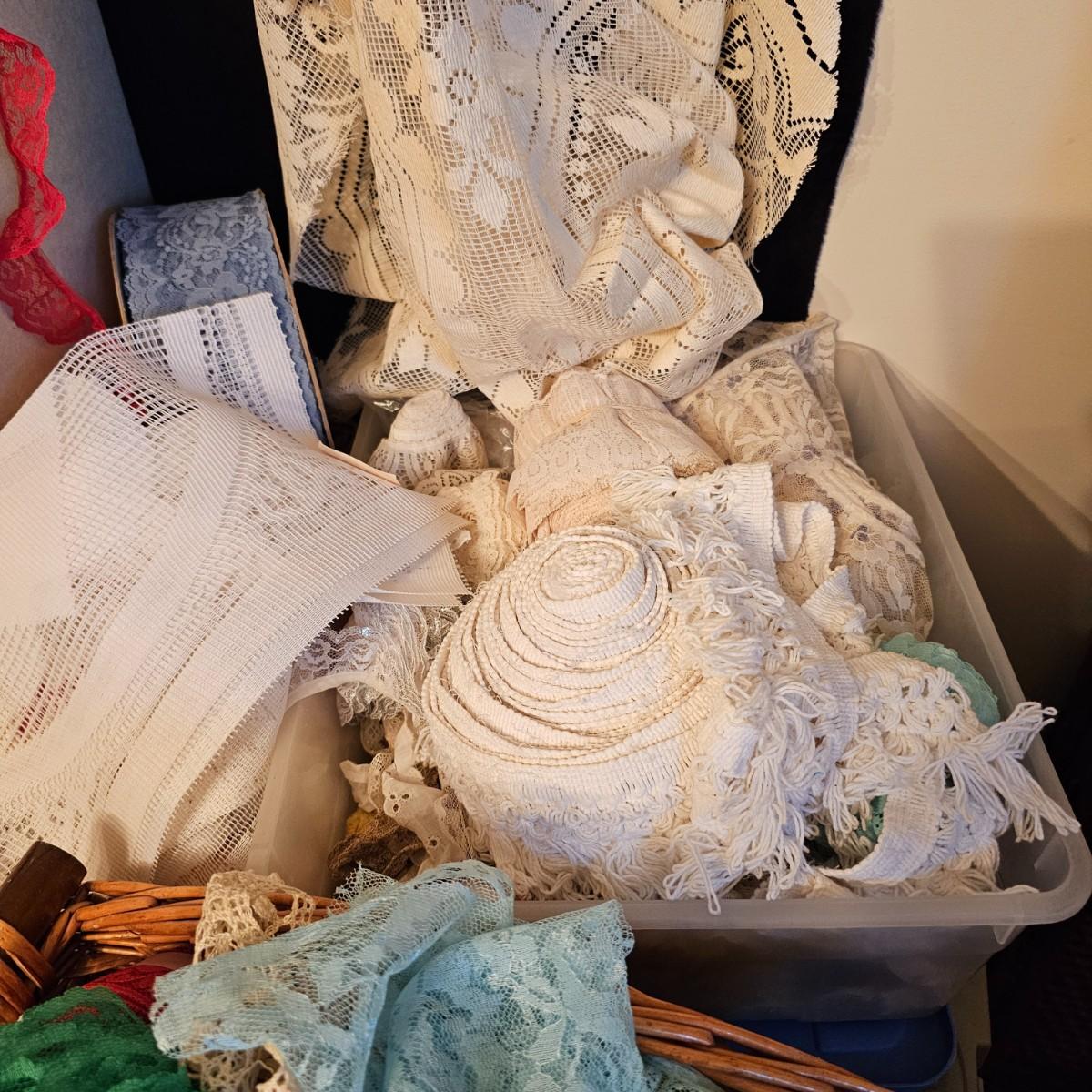 One word says it all. Lace, yards and yards of lace in all shapes, rolls, colors and designs. Some pre made pieces and some vintage items as well. Red, green, blue, lavender and of course white and off white items. Also includes some embellishments to use in decorating with the lace, tiny flower stems and more. Some items are stained and discolored from age. 14 small tubs, one box and two bags all included with items See photos for details. Local pickup only.