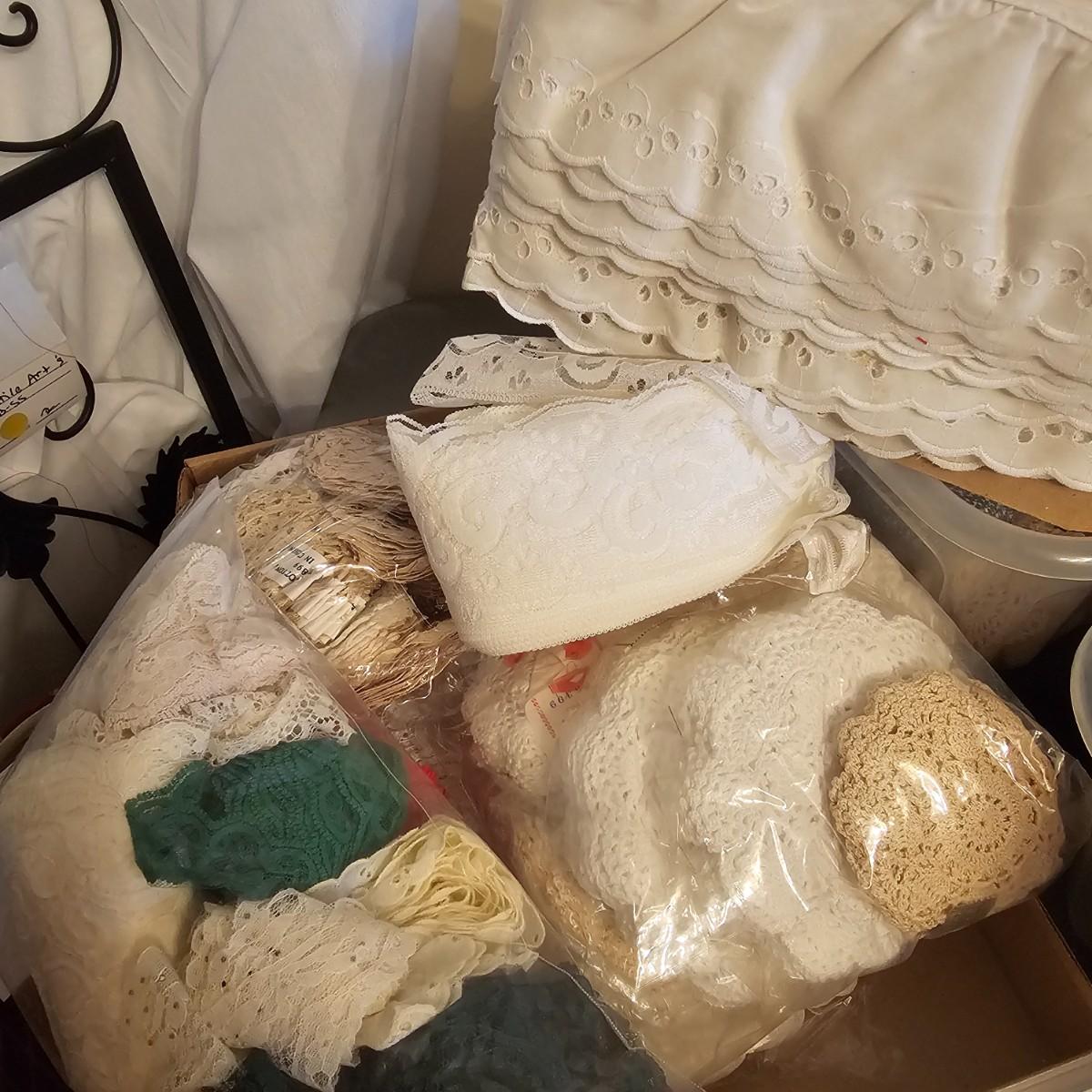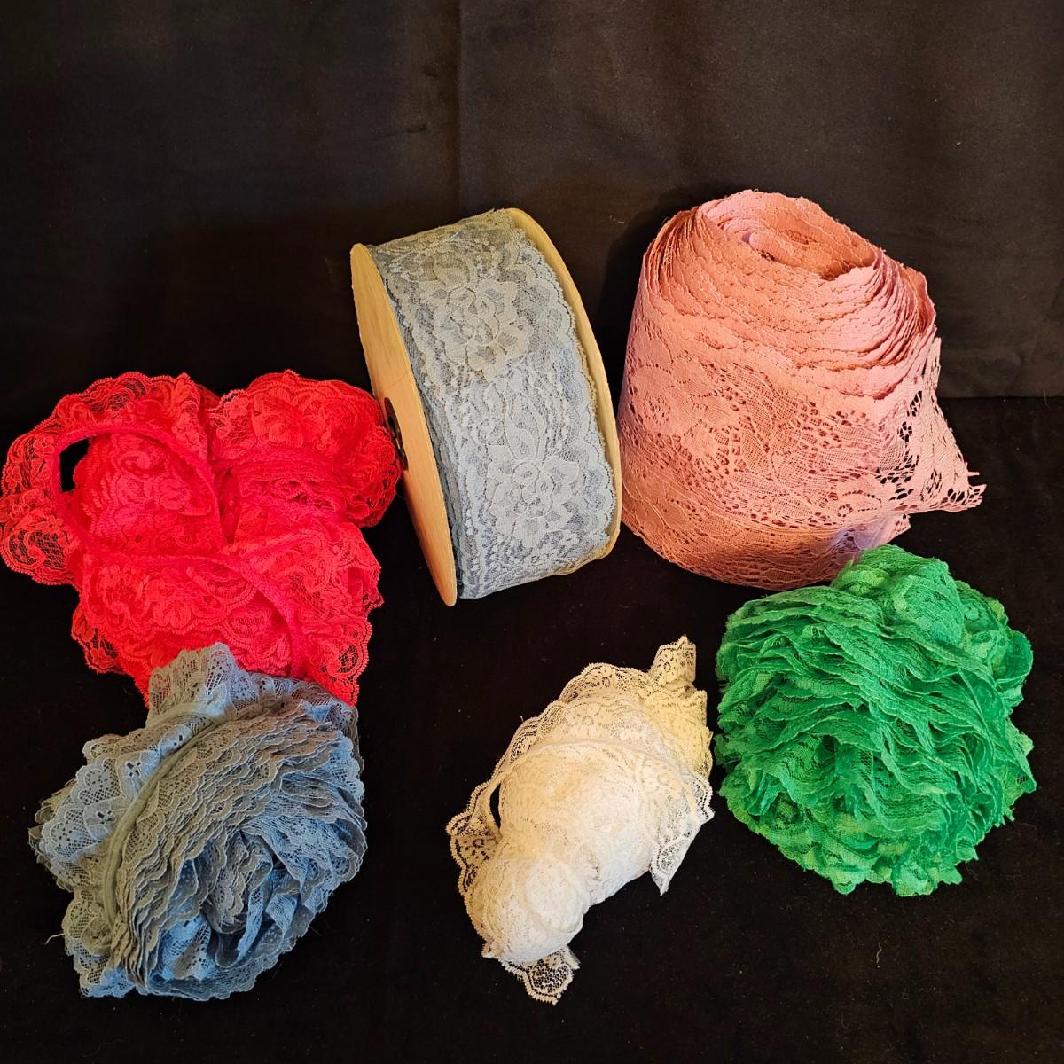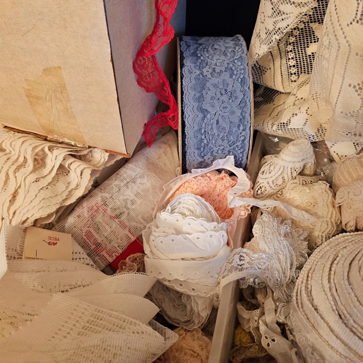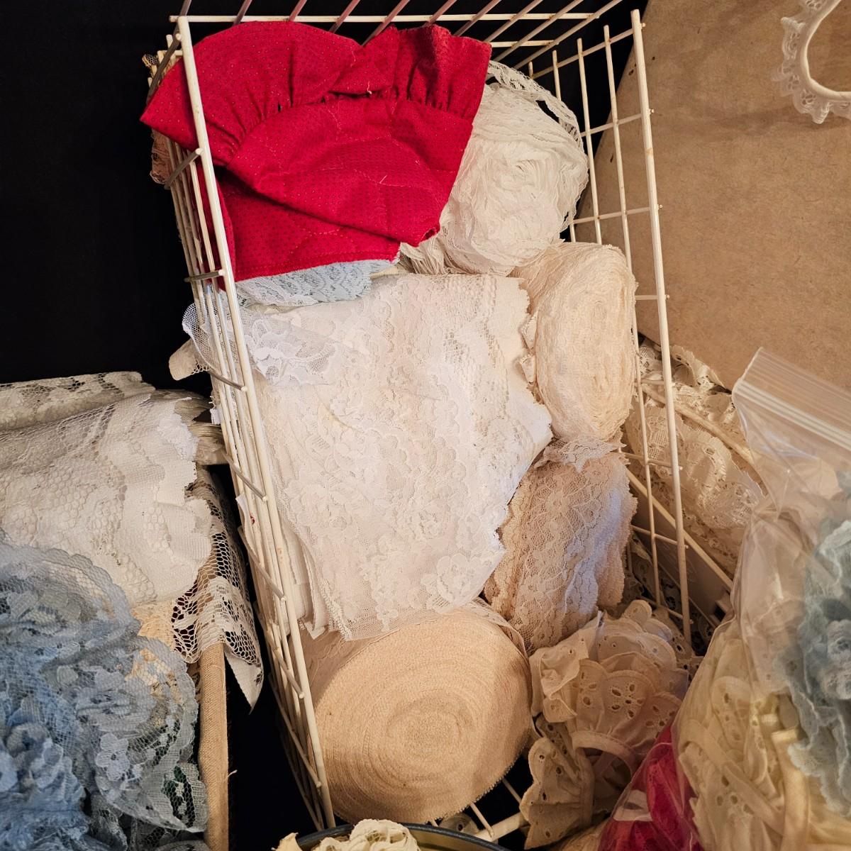 One word says it all. Lace, yards and yards of lace in all shapes, rolls, colors and designs. Some pre made pieces and some vintage items as well. Red, green, blue, lavender and of course white and off white items. Also includes some embellishments to use in decorating with the lace, tiny flower stems and more. Some items are stained and discolored from age. 14 small tubs, one box and two bags all included with items See photos for details. Local pickup only.