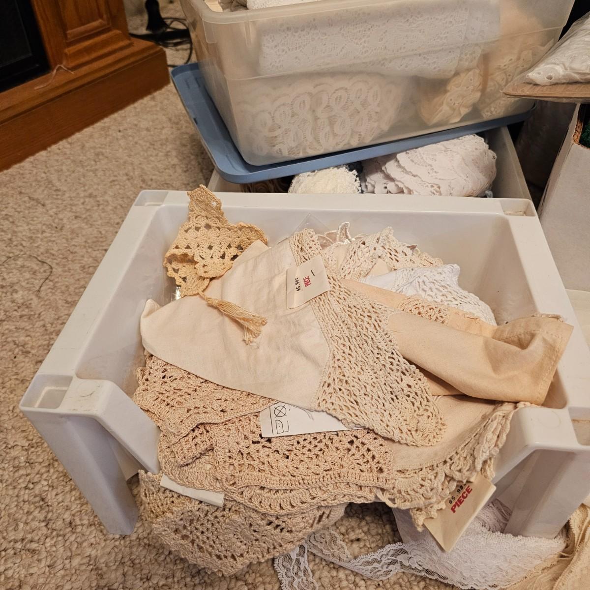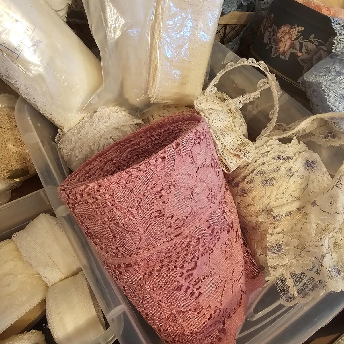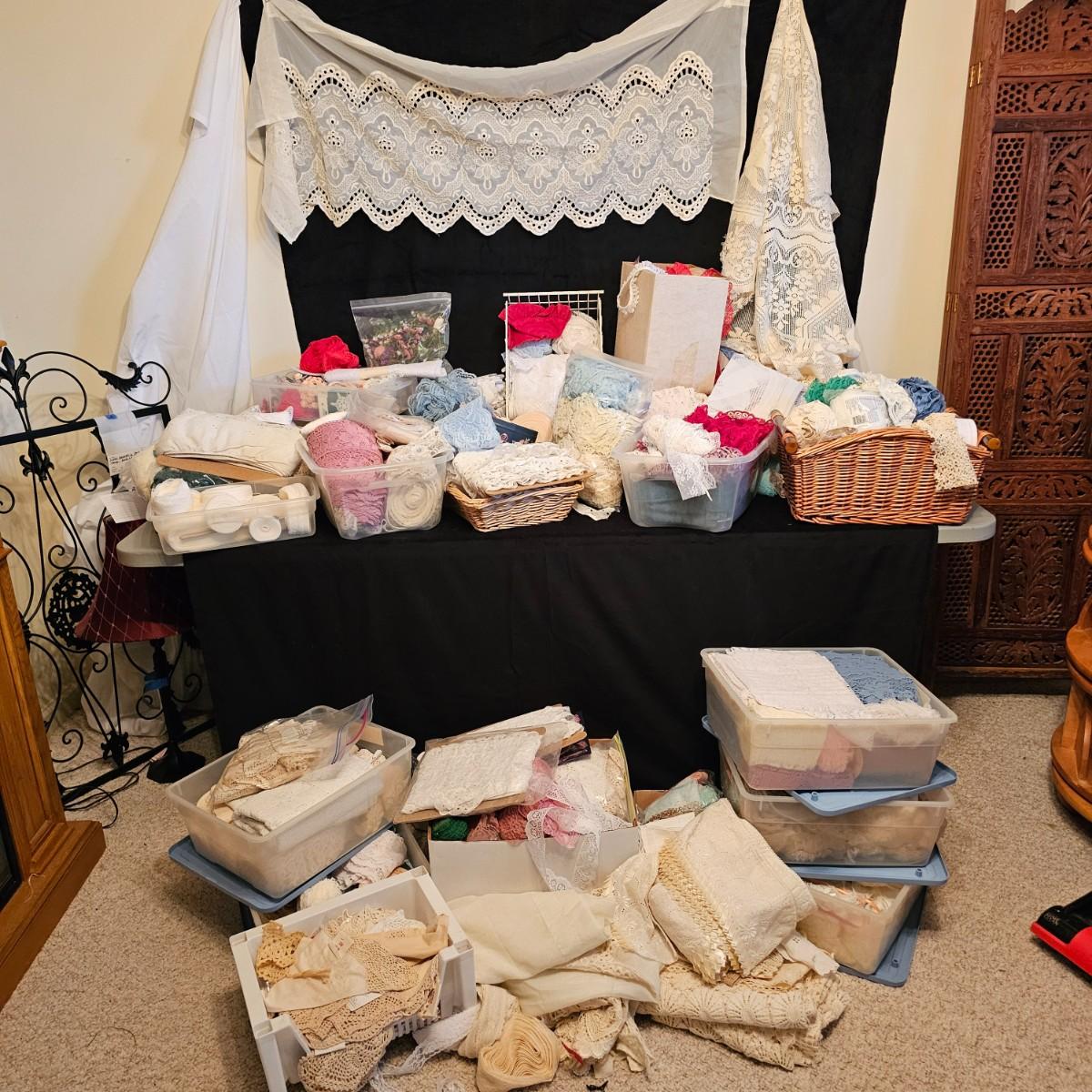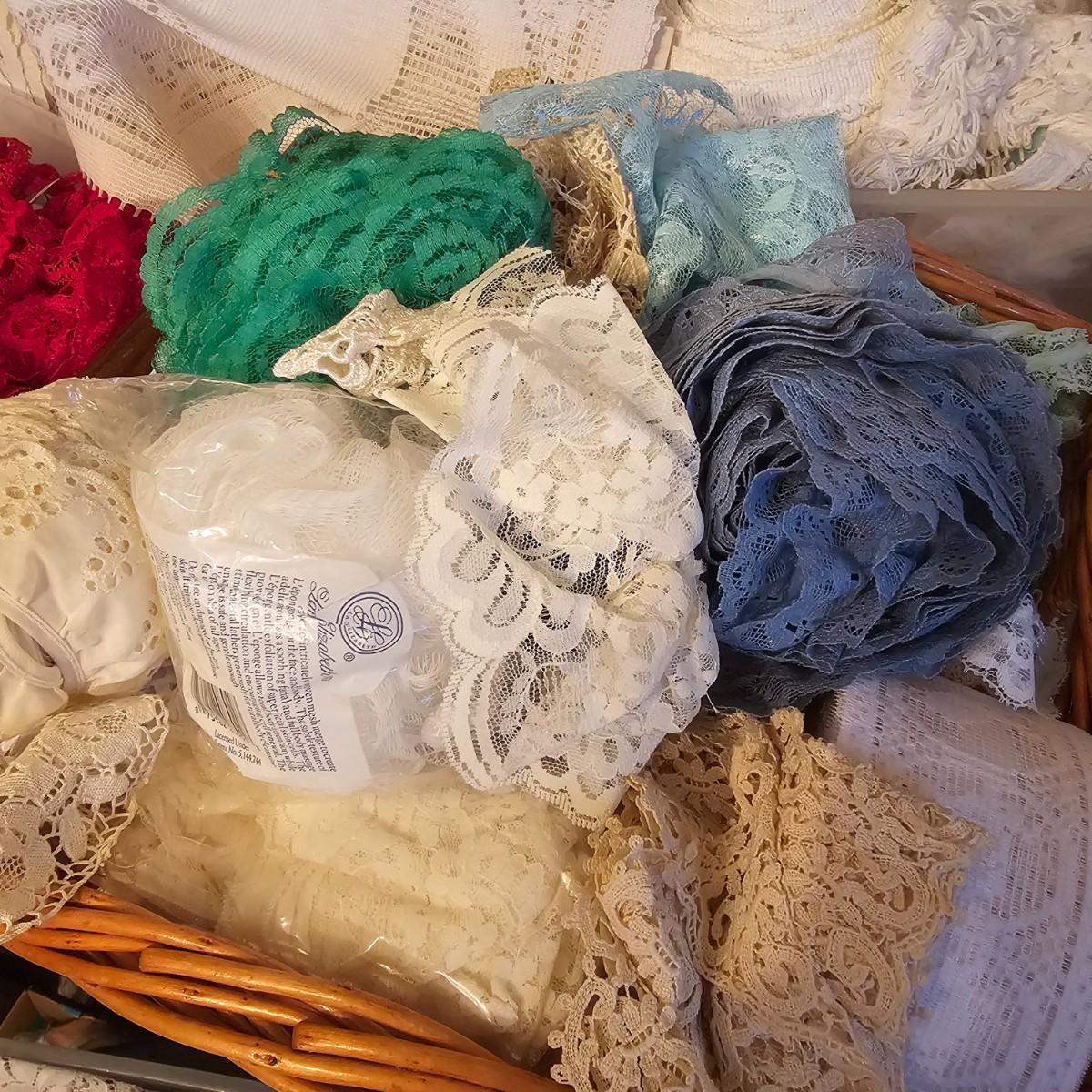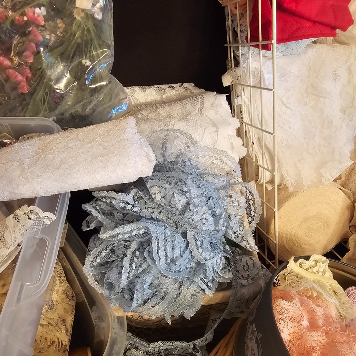 One word says it all. Lace, yards and yards of lace in all shapes, rolls, colors and designs. Some pre made pieces and some vintage items as well. Red, green, blue, lavender and of course white and off white items. Also includes some embellishments to use in decorating with the lace, tiny flower stems and more. Some items are stained and discolored from age. 14 small tubs, one box and two bags all included with items See photos for details. Local pickup only.