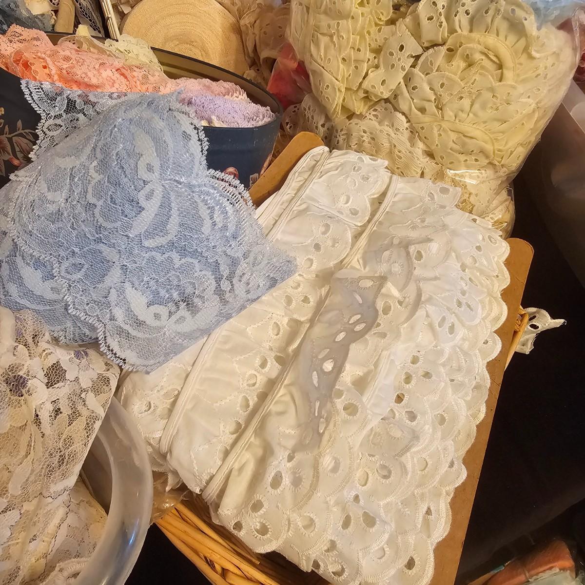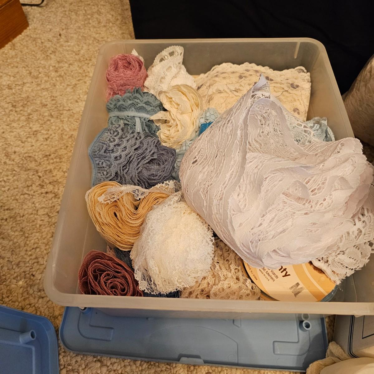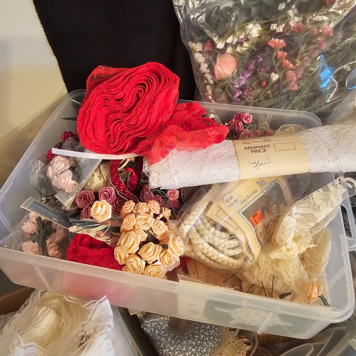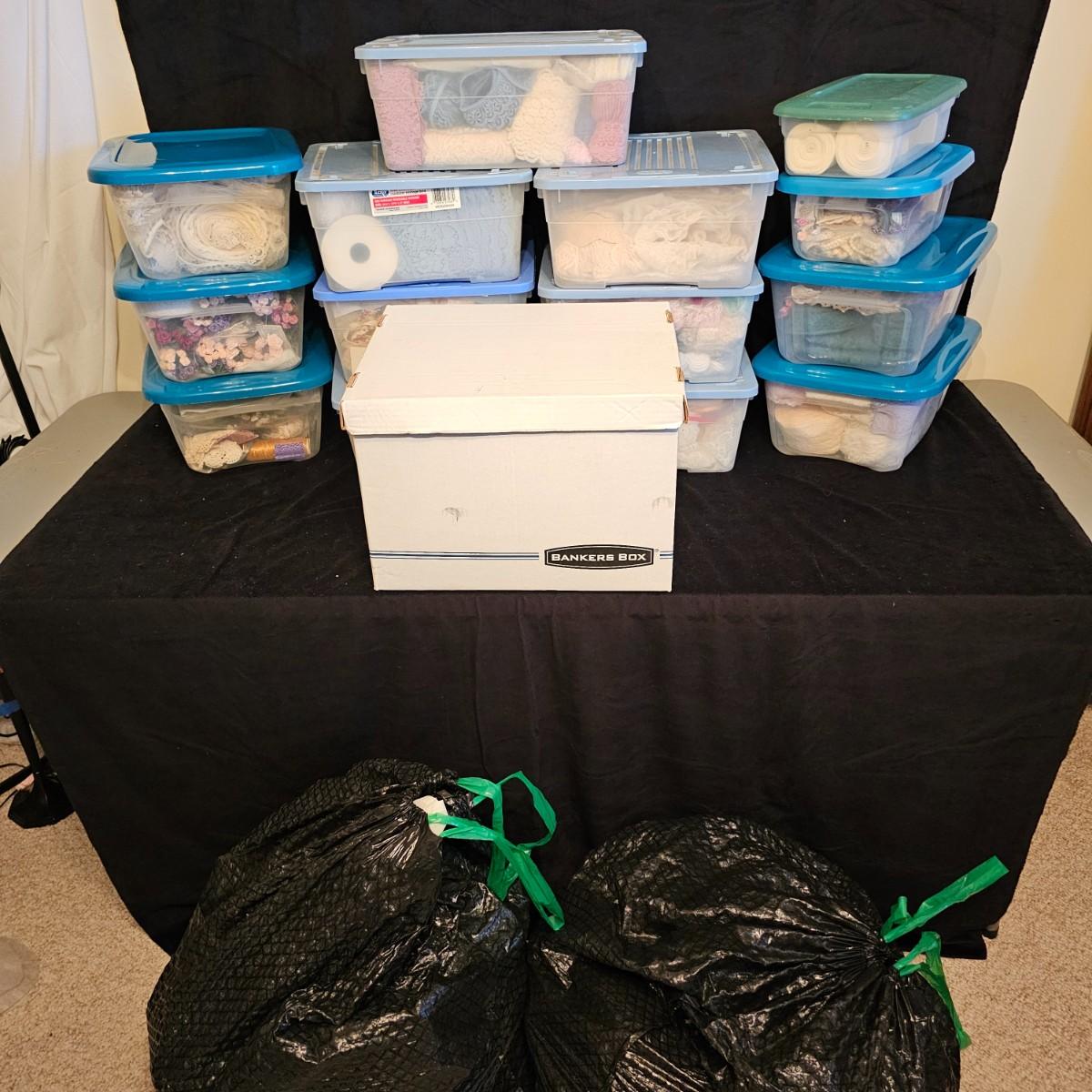 One word says it all. Lace, yards and yards of lace in all shapes, rolls, colors and designs. Some pre made pieces and some vintage items as well. Red, green, blue, lavender and of course white and off white items. Also includes some embellishments to use in decorating with the lace, tiny flower stems and more. Some items are stained and discolored from age. 14 small tubs, one box and two bags all included with items See photos for details. Local pickup only.