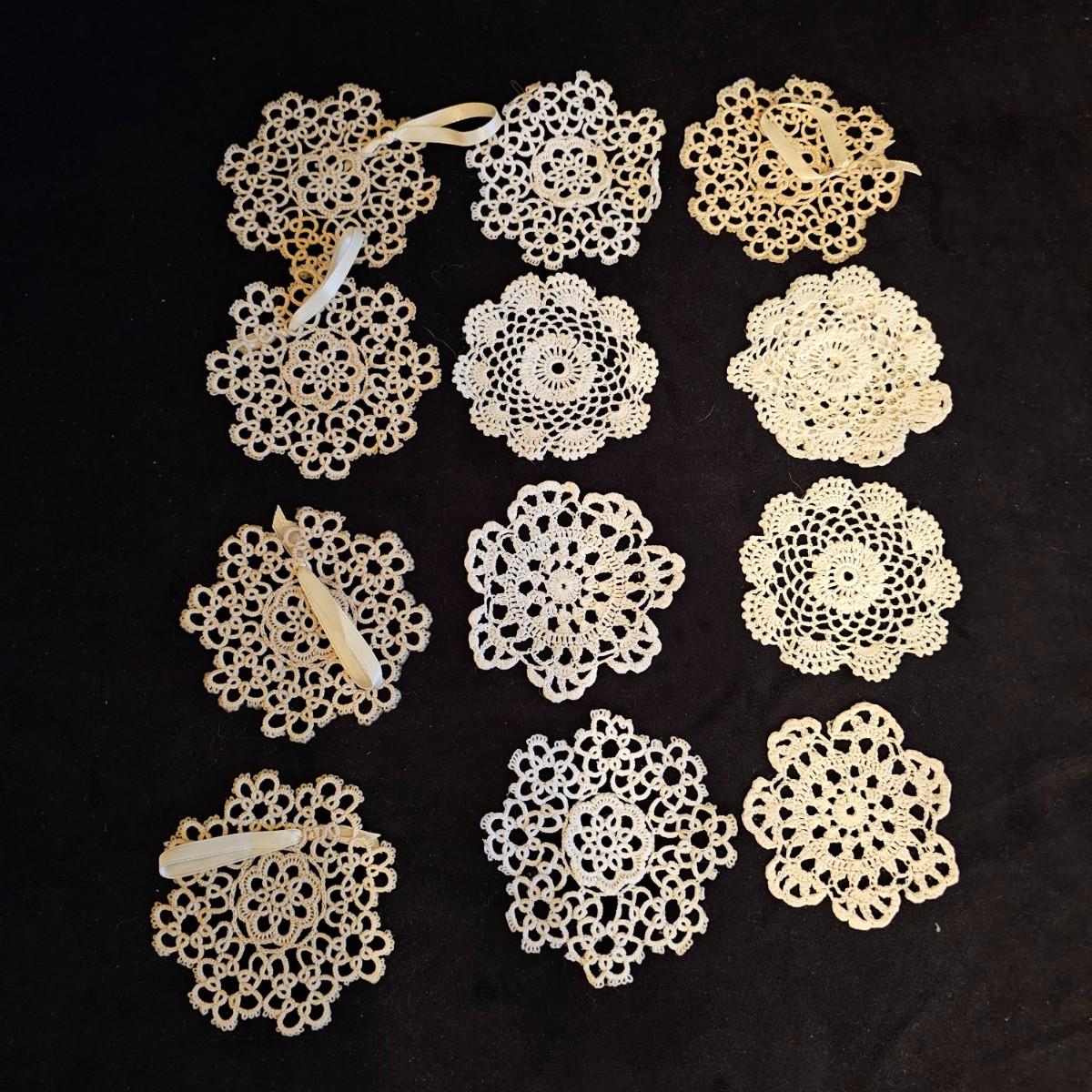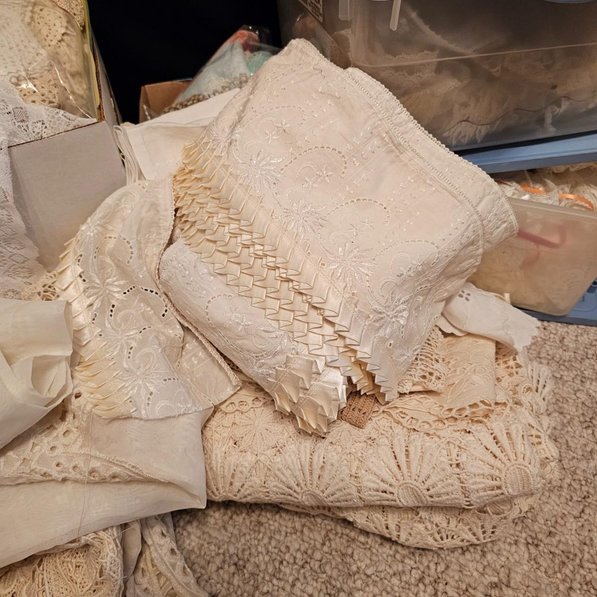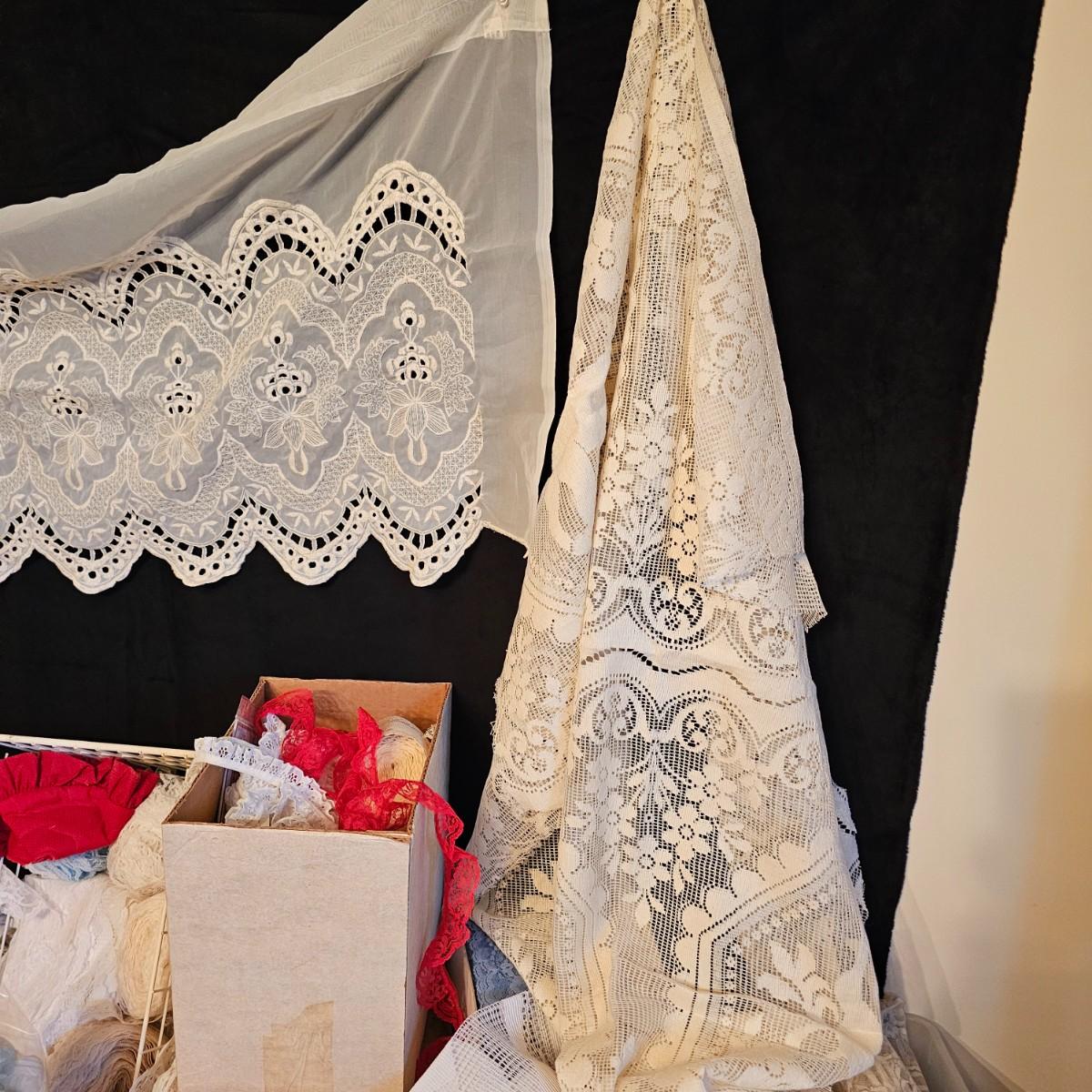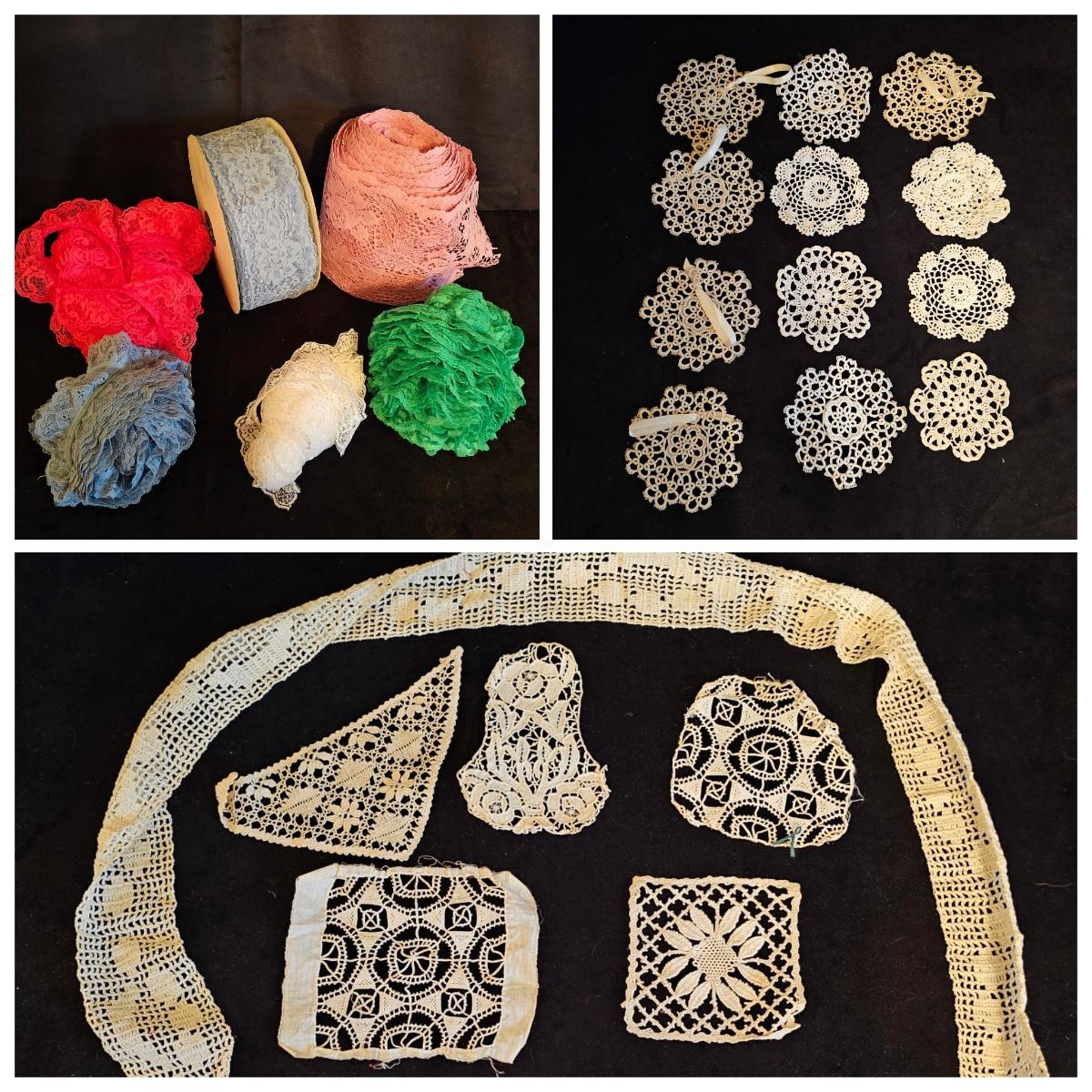 One word says it all. Lace, yards and yards of lace in all shapes, rolls, colors and designs. Some pre made pieces and some vintage items as well. Red, green, blue, lavender and of course white and off white items. Also includes some embellishments to use in decorating with the lace, tiny flower stems and more. Some items are stained and discolored from age. 14 small tubs, one box and two bags all included with items See photos for details. Local pickup only.
