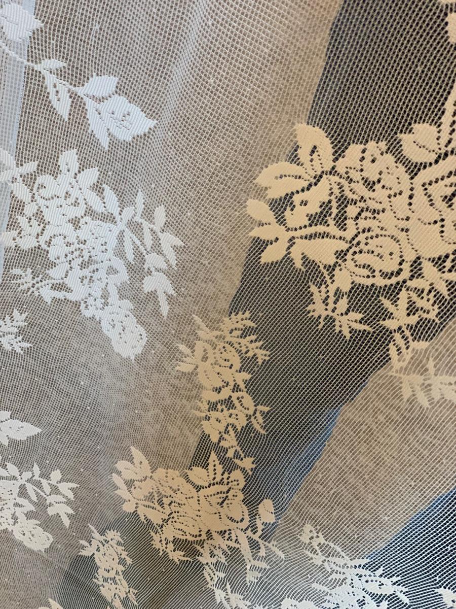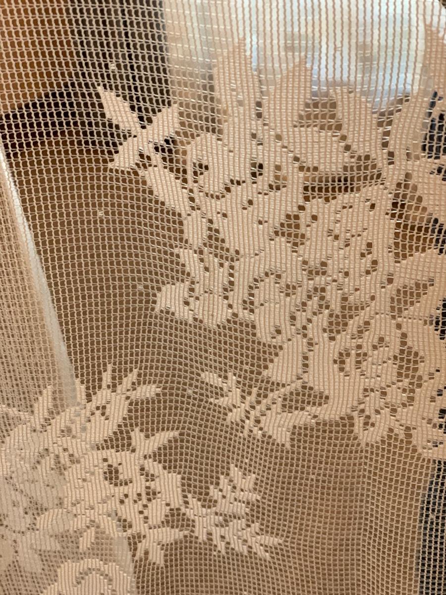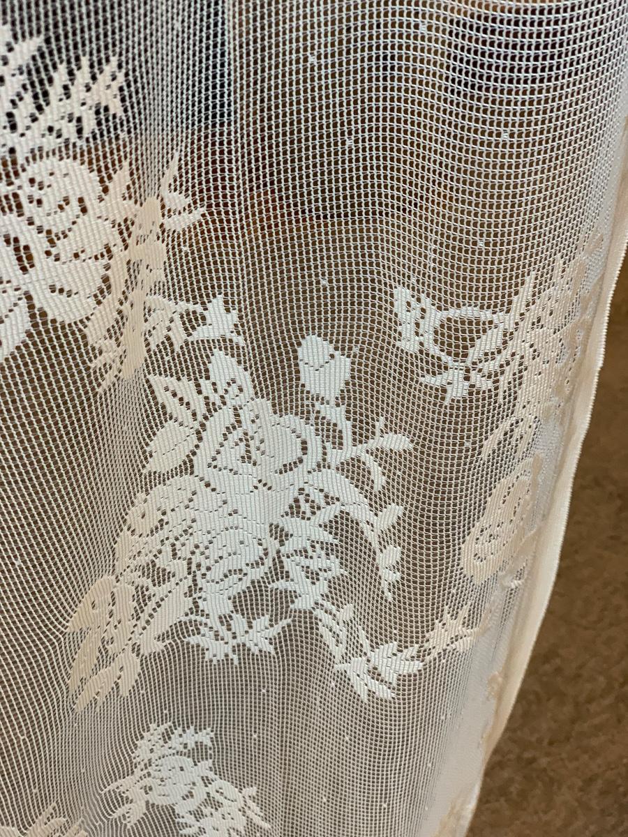 84" long curtain panels in eggshell white. These are not antique linen. Only hung once for 6 months.