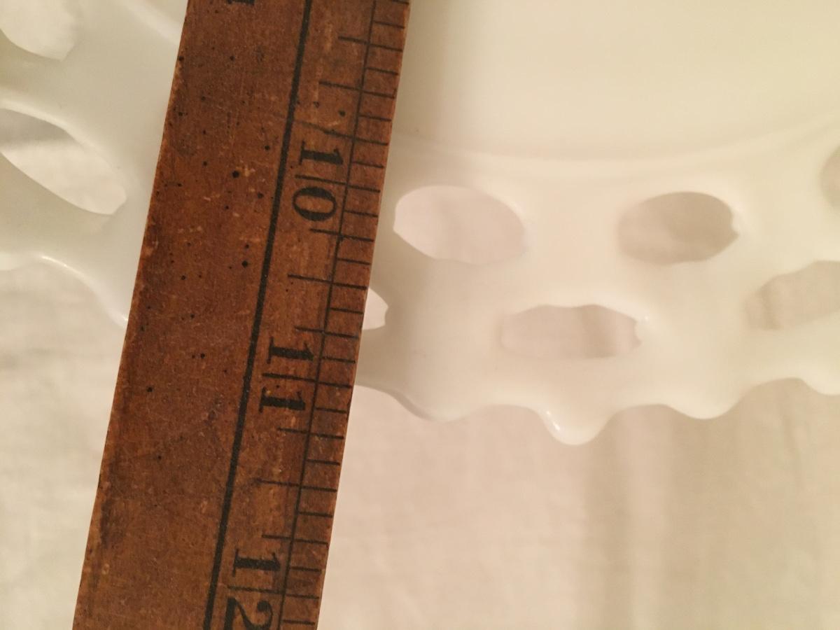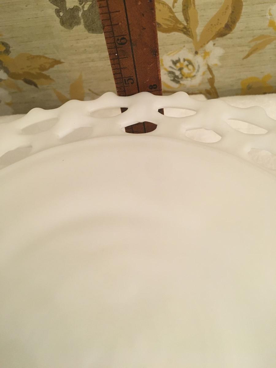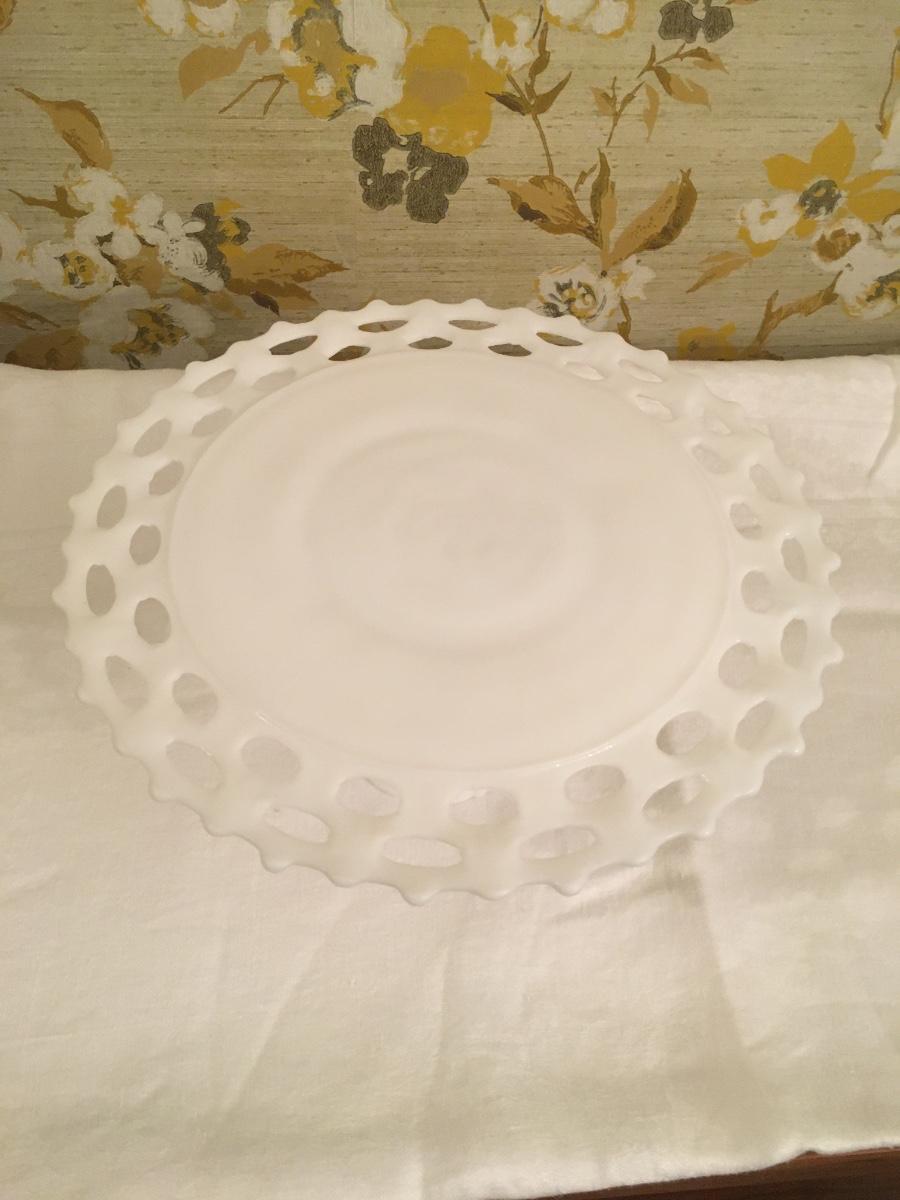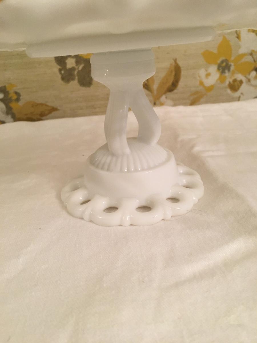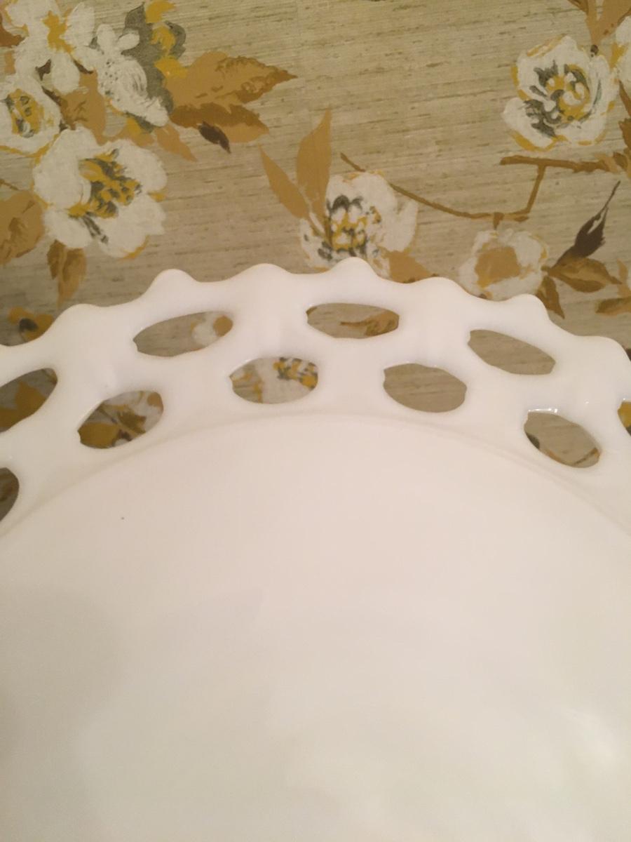Lovely lace edged milk glass footed cake plate in great shape.