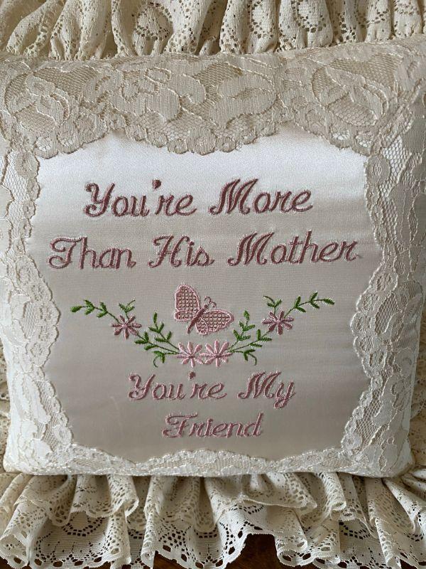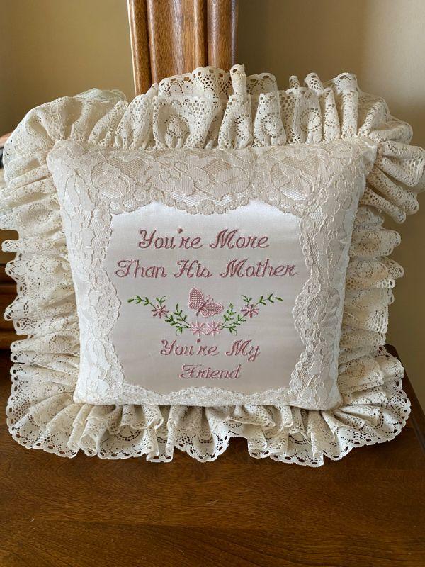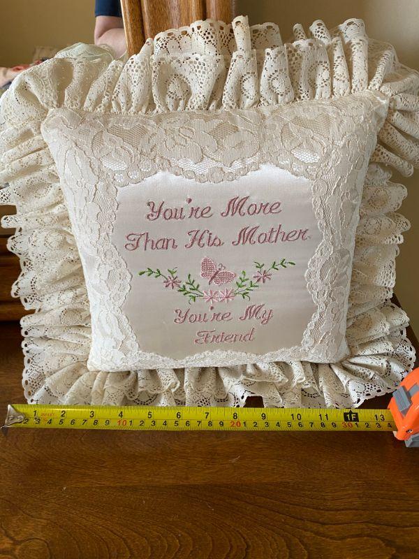 Lace edge throw pillow. Made for your husbands mother "You're More Than His Mother You're My Friend". Good Condition.
