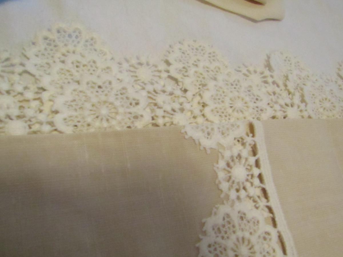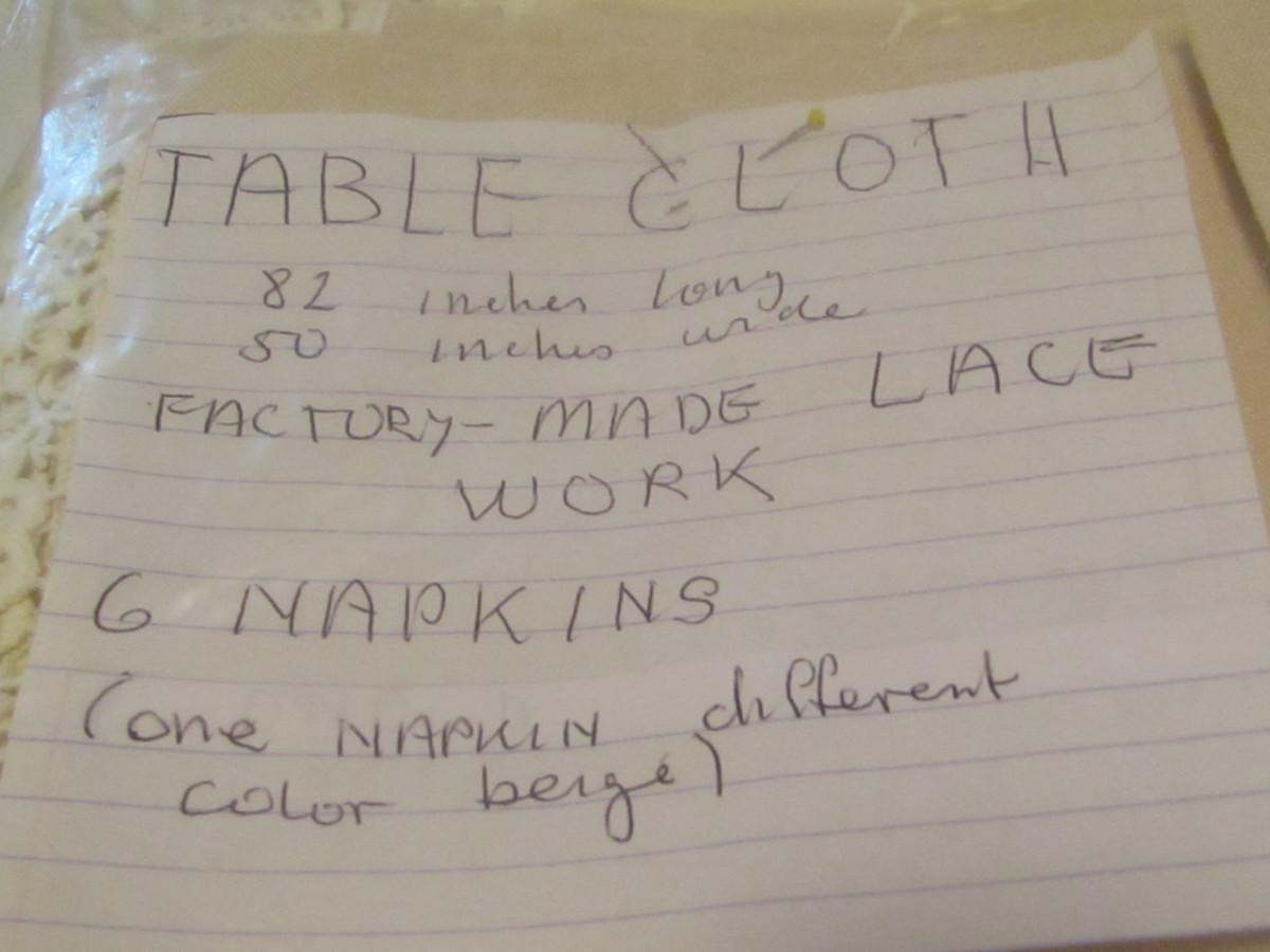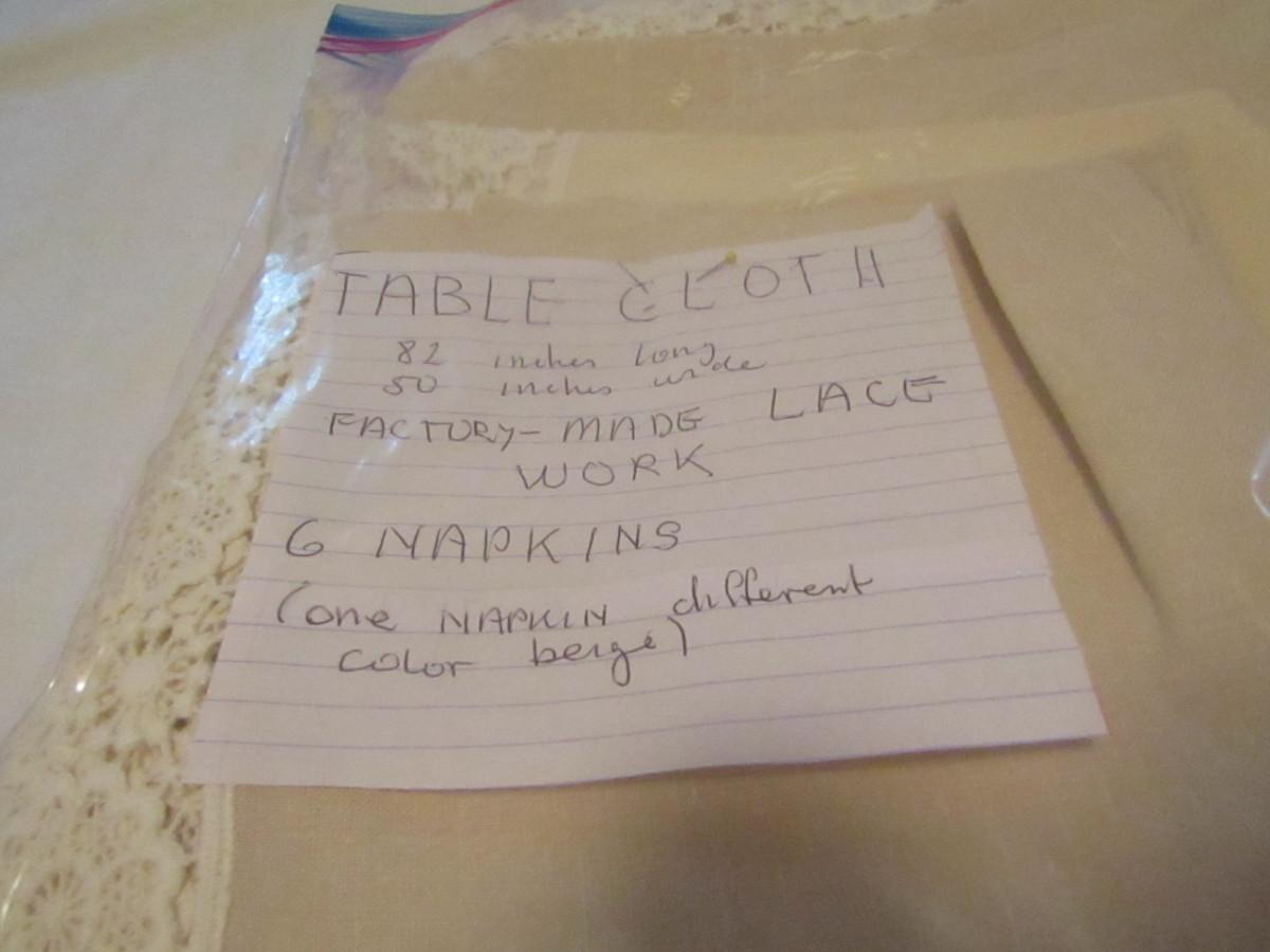 Lace Edged Tablecloth and Six Napkin Set- Approx 82" x 50" (#17). Please note that one of the napkins is faded and appears to be a different color from the others.
