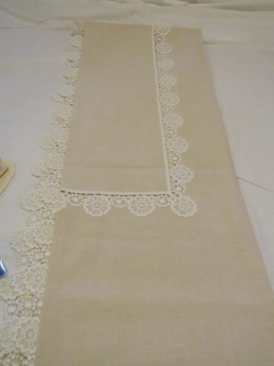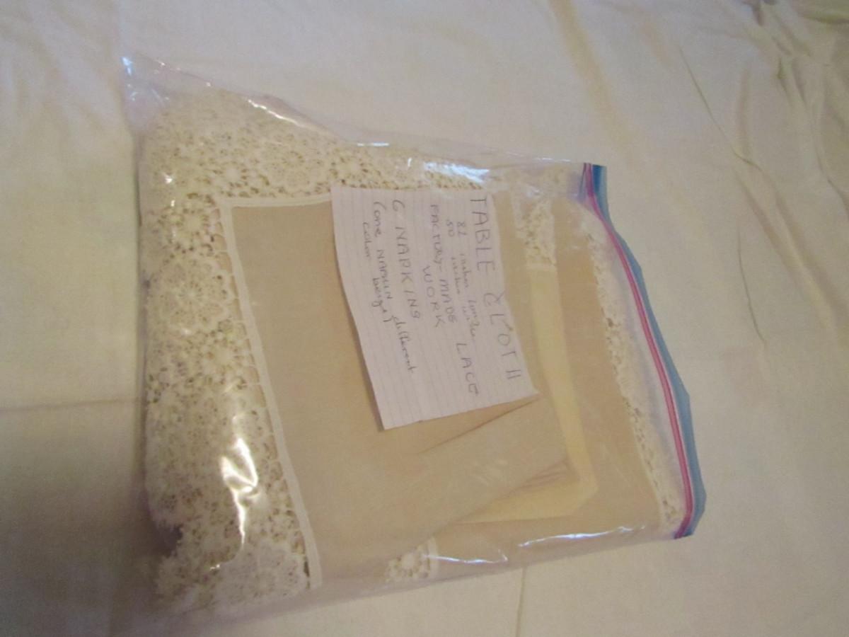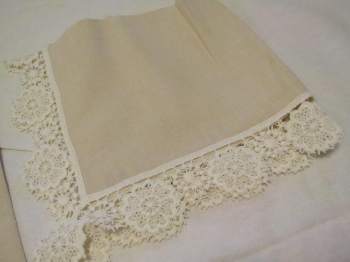 Lace Edged Tablecloth and Six Napkin Set- Approx 82" x 50" (#17). Please note that one of the napkins is faded and appears to be a different color from the others.