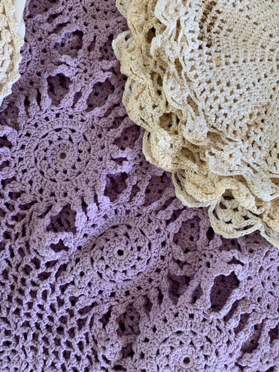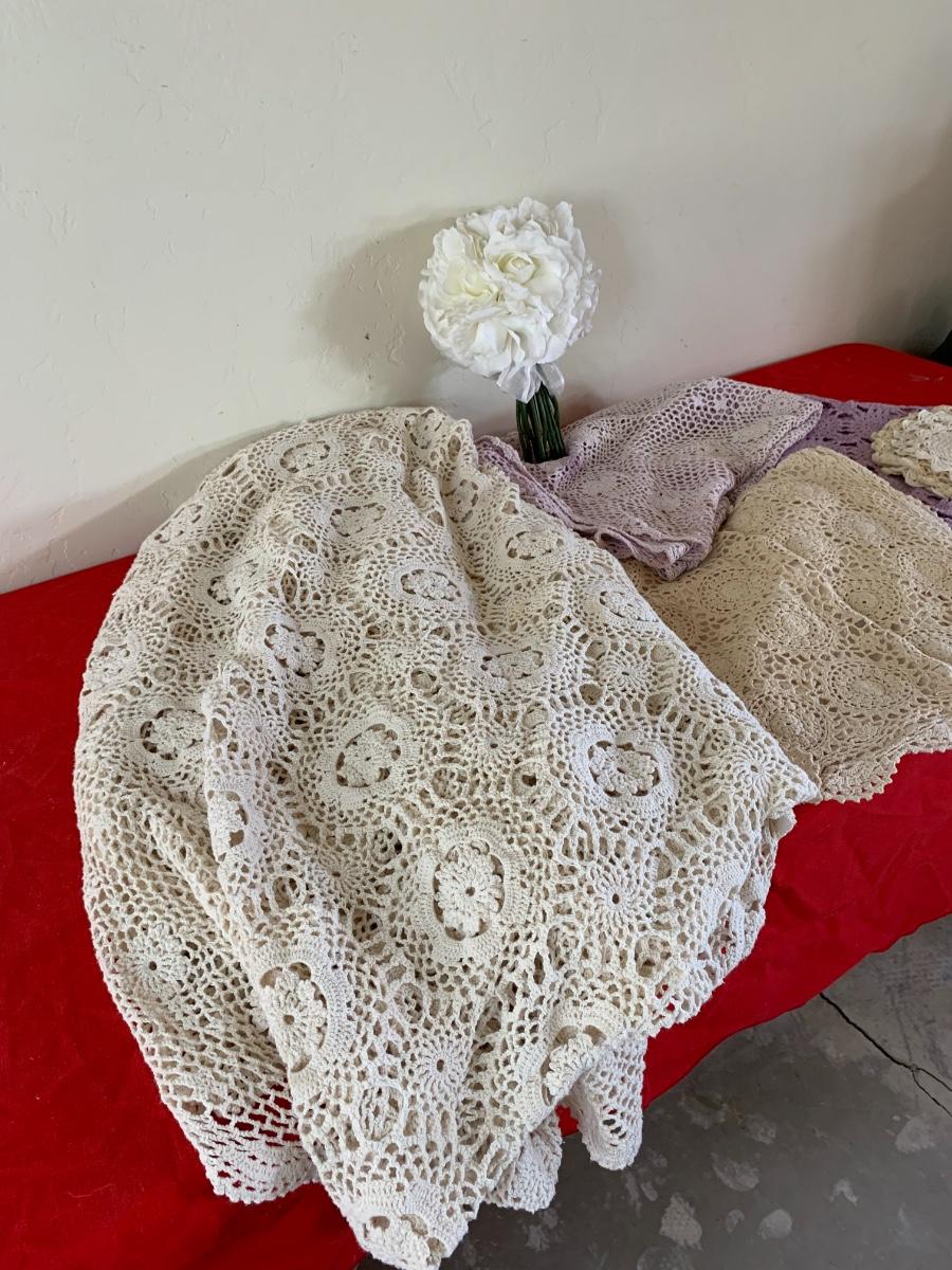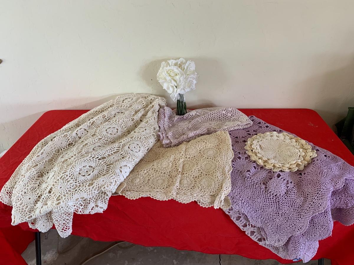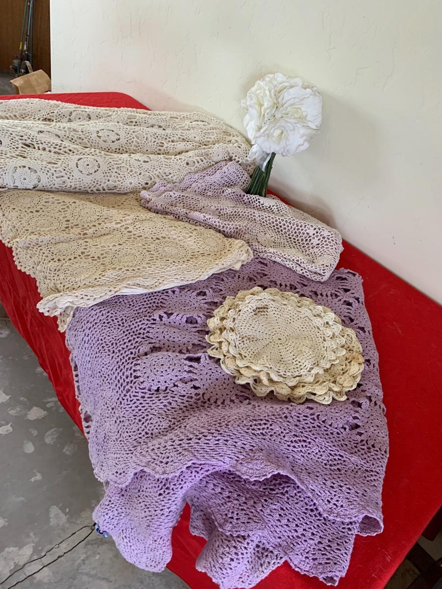 Lot includes a very large off white lace table cloth/ twin bead cover, has some stains. A lavender lace table cloth, a small light lavender table cover, a lace pillow cover, a small pile of lace doilies and a bouquet of faux flowers. All need cleaning, have wear and light stains.