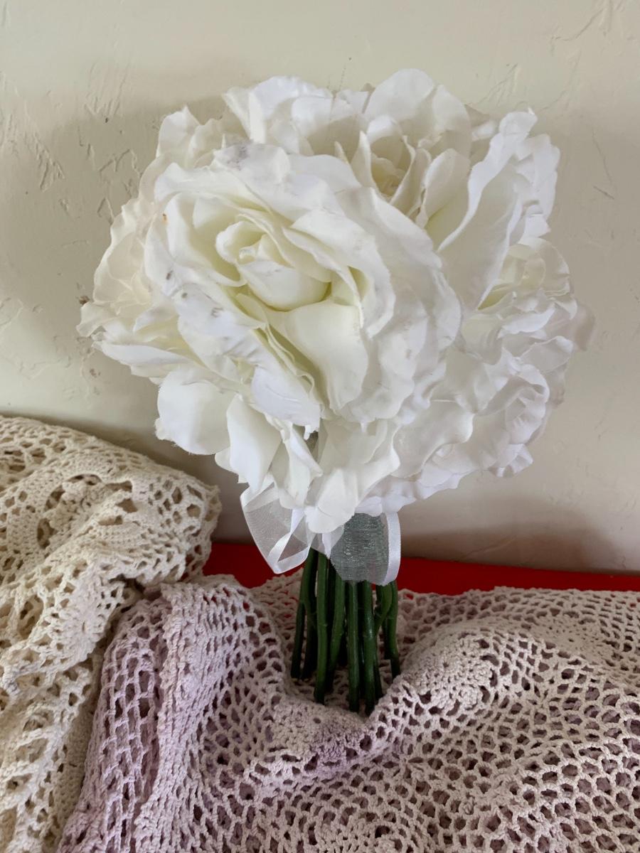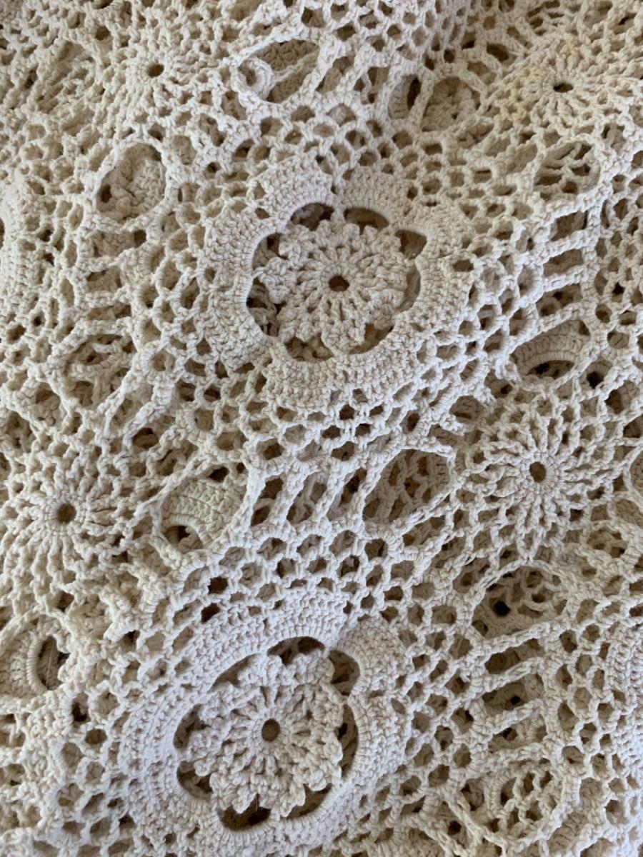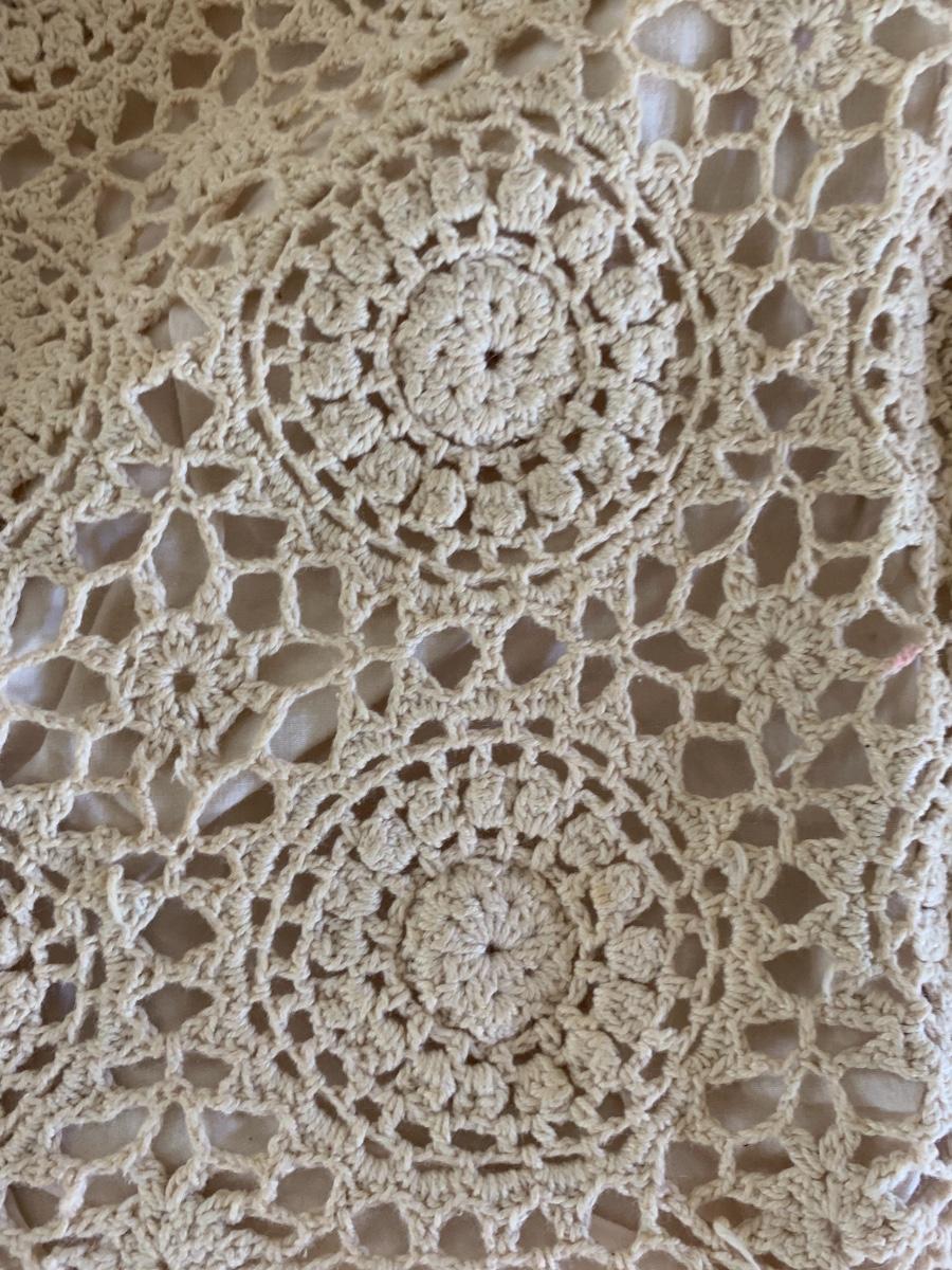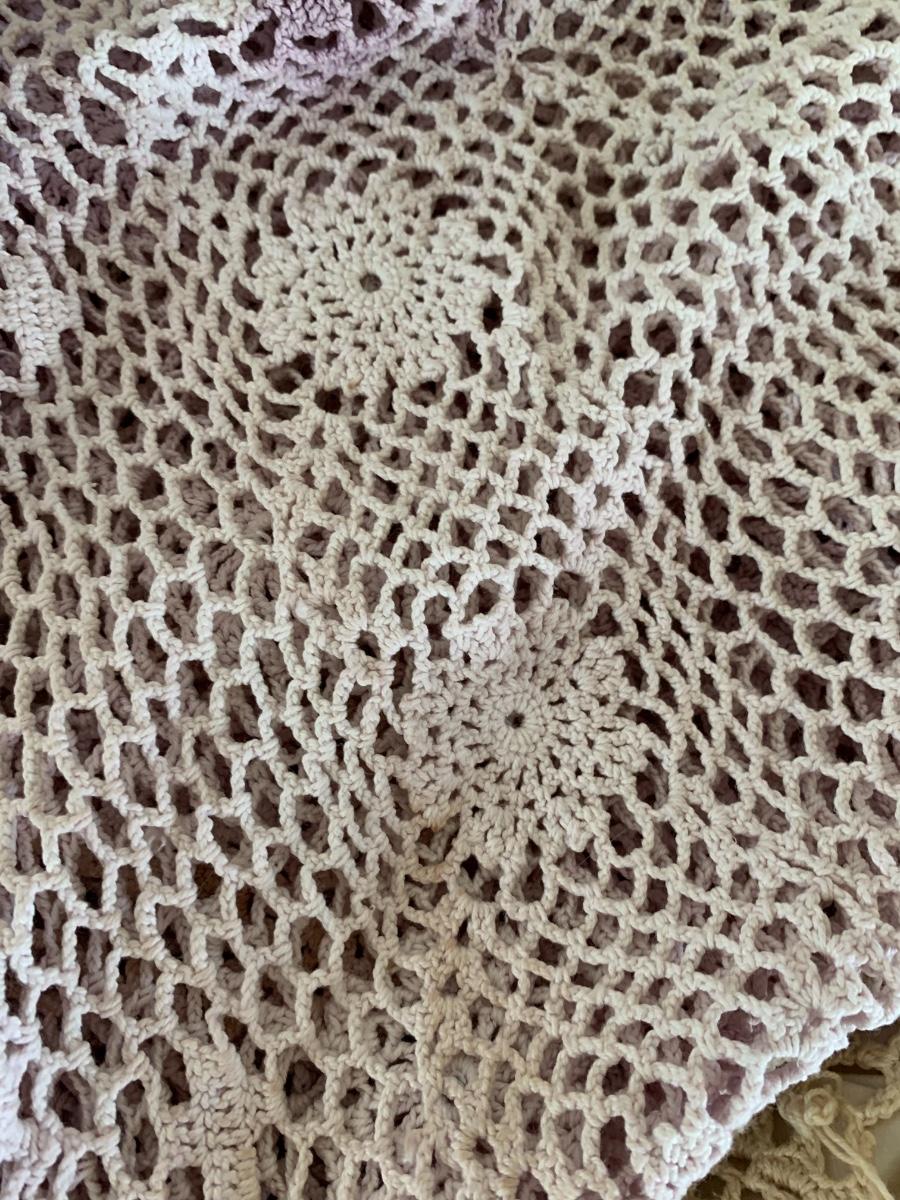Lot includes a very large off white lace table cloth/ twin bead cover, has some stains. A lavender lace table cloth, a small light lavender table cover, a lace pillow cover, a small pile of lace doilies and a bouquet of faux flowers. All need cleaning, have wear and light stains.