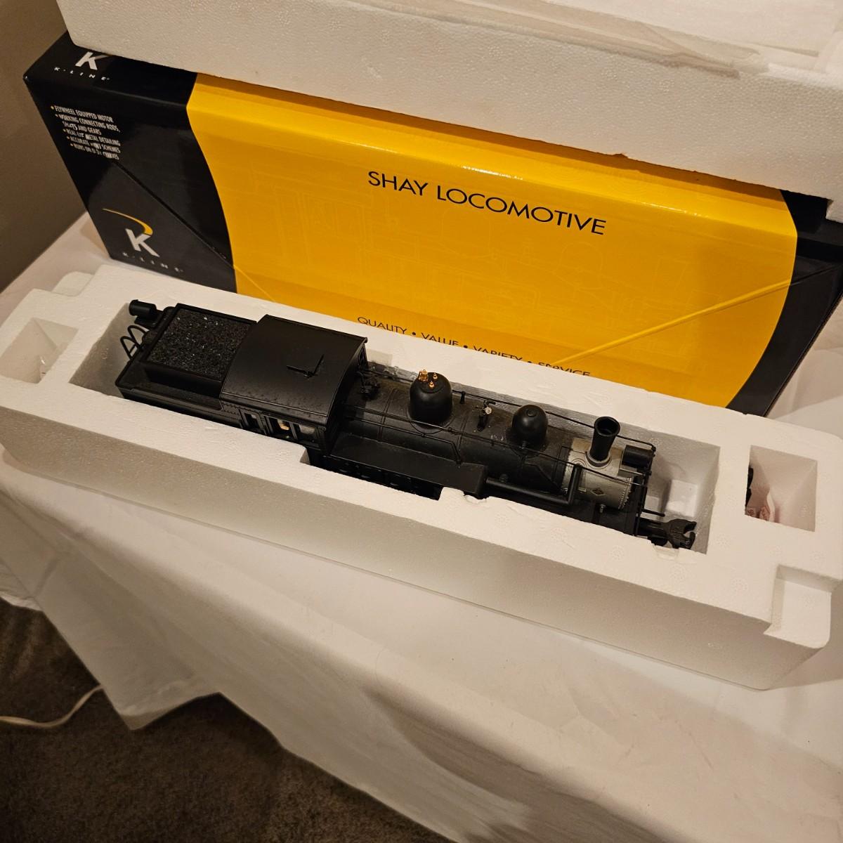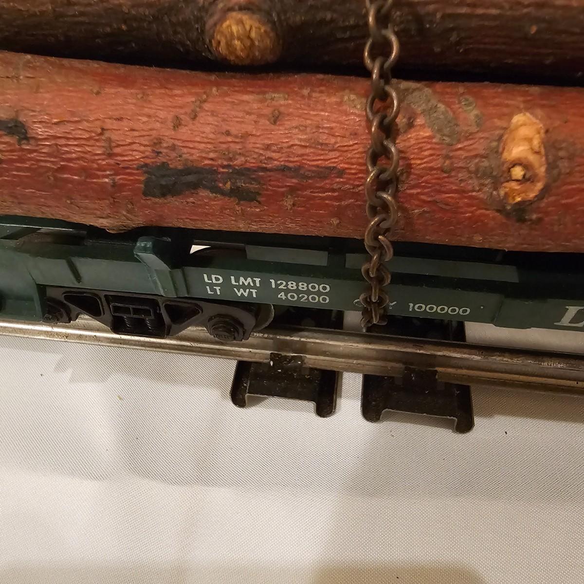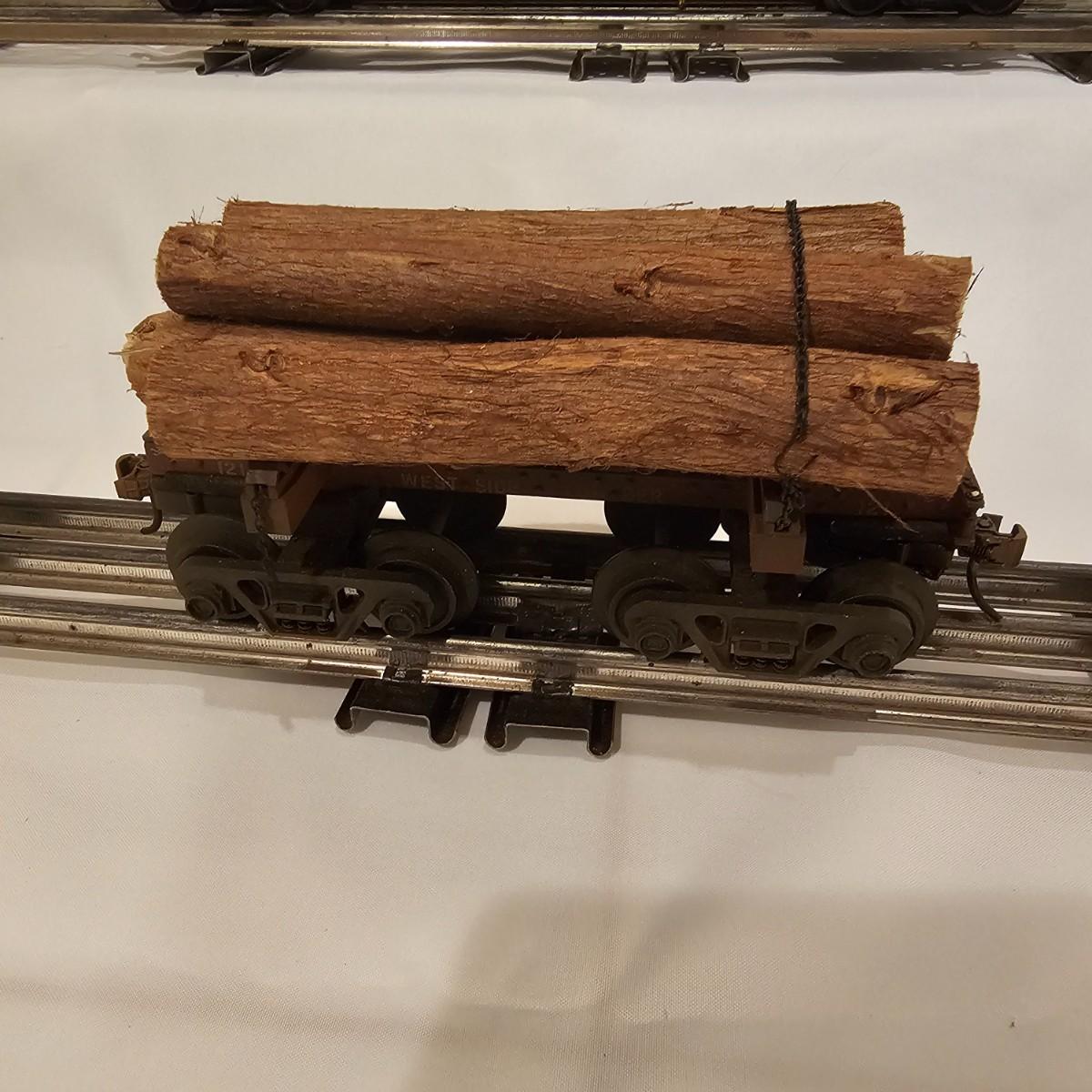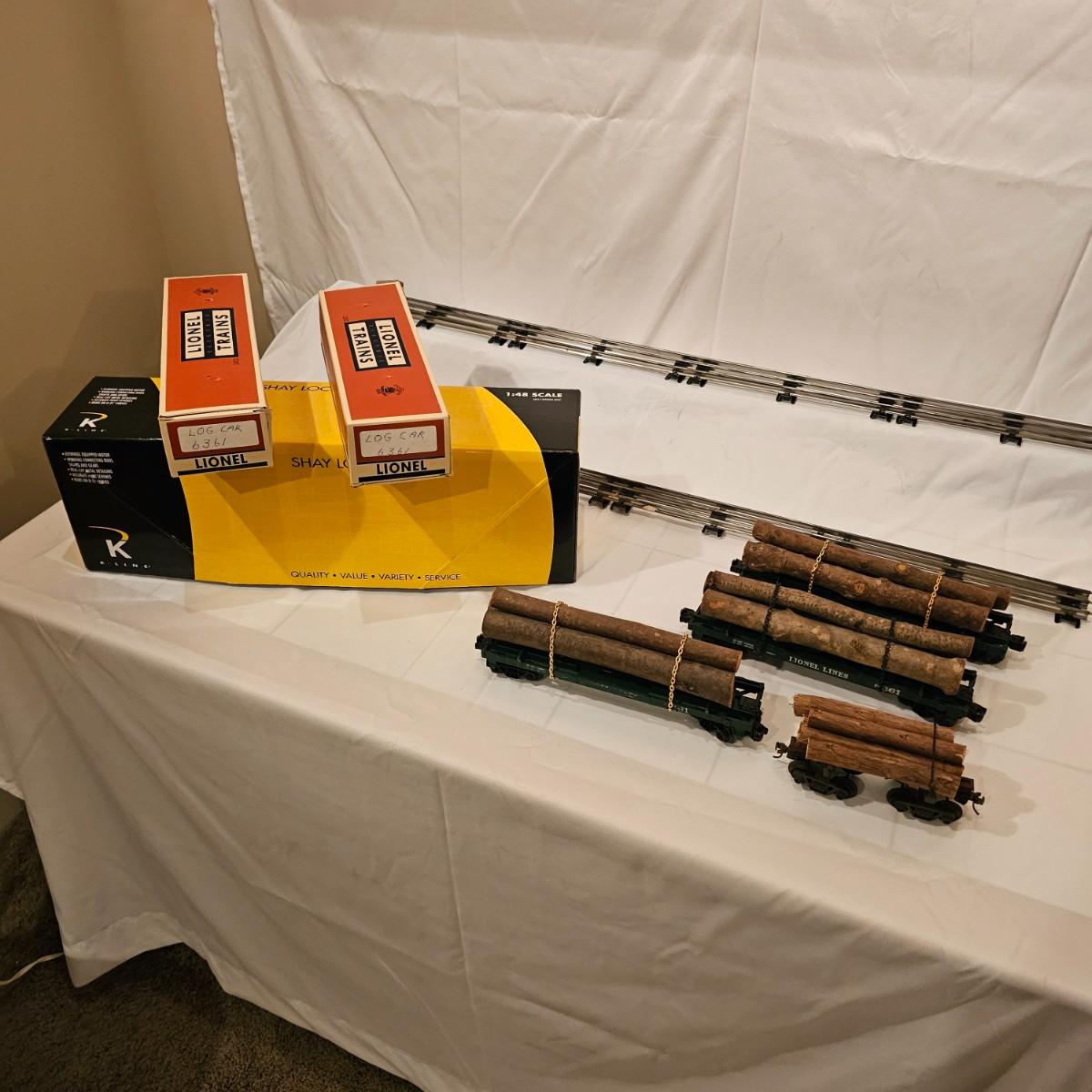Captivating movement on this two truck Shay engine with side pistons and geared drive. One of several engines created for logging use in earlier times. Lackawanna Cola & Lumber #2 is a typical representation of these mighty units. This K-Line piece has digital whistle and bell, cruise control and synchronized puffing smoke. Engine started and ran on layout, other features not tested. 15" x 3" x 4.25"H. In original box, some wear and tear. Also included are five Lionel #6561 log cars with logs, two with boxes. 11" x 2" x 3"H. One smaller Westside Lumber log buggy with load, 7" x 3" x 3"H and Kadee style couplers. See photos for details. Please note that any price tag seen on an item was not put there by Sterling Transitions and does not reflect the current value of the item. Tracks in photos are not included with this lot, but available elsewhere in this auction. Shipping available.