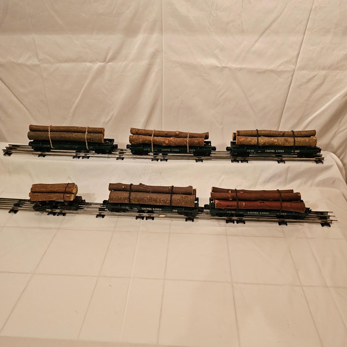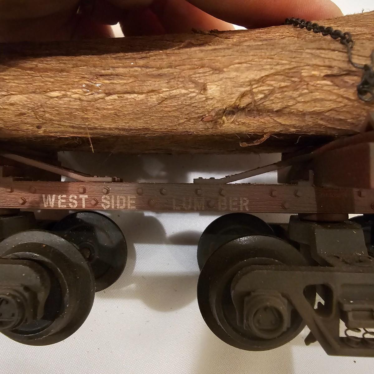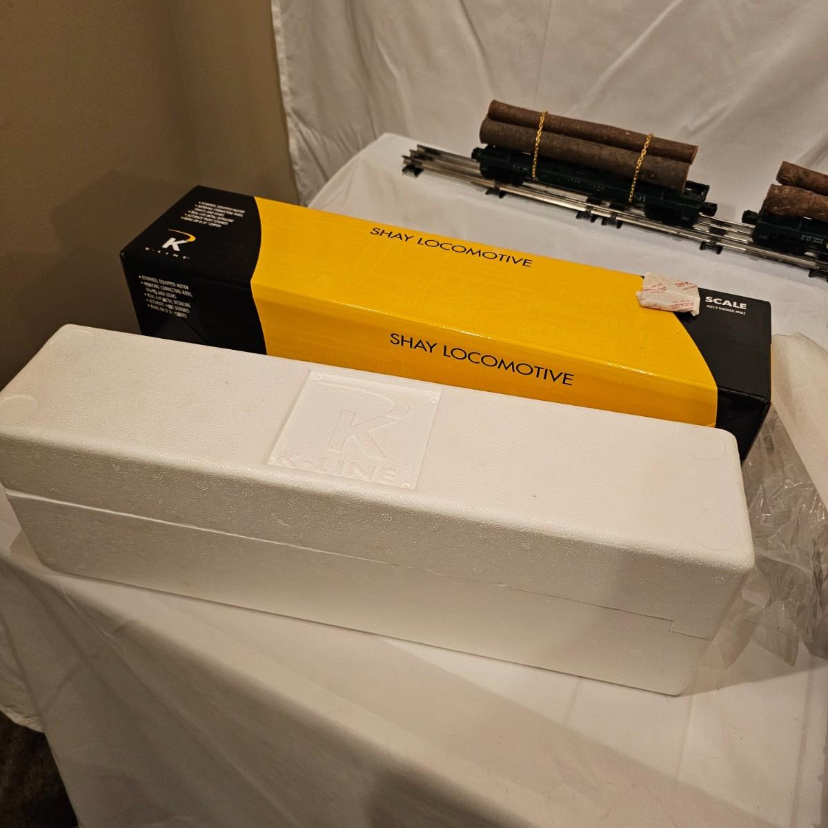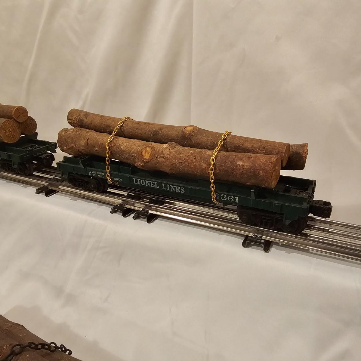 Captivating movement on this two truck Shay engine with side pistons and geared drive. One of several engines created for logging use in earlier times. Lackawanna Cola & Lumber #2 is a typical representation of these mighty units. This K-Line piece has digital whistle and bell, cruise control and synchronized puffing smoke. Engine started and ran on layout, other features not tested. 15" x 3" x 4.25"H. In original box, some wear and tear. Also included are five Lionel #6561 log cars with logs, two with boxes. 11" x 2" x 3"H. One smaller Westside Lumber log buggy with load, 7" x 3" x 3"H and Kadee style couplers. See photos for details. Please note that any price tag seen on an item was not put there by Sterling Transitions and does not reflect the current value of the item. Tracks in photos are not included with this lot, but available elsewhere in this auction. Shipping available.