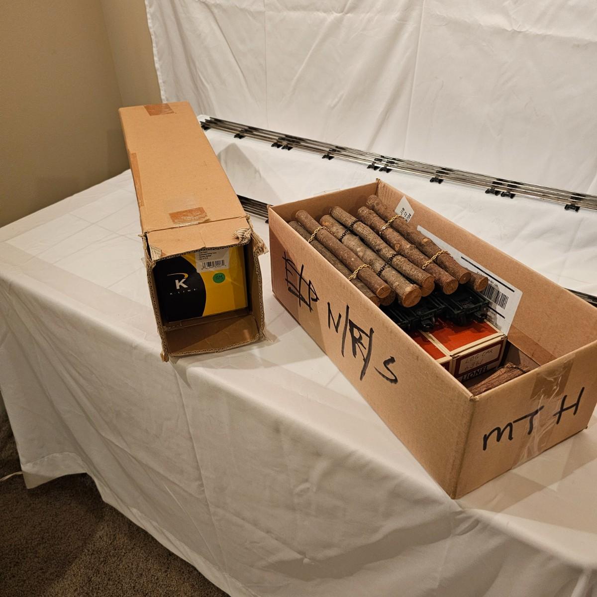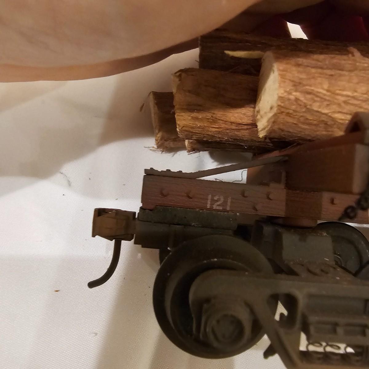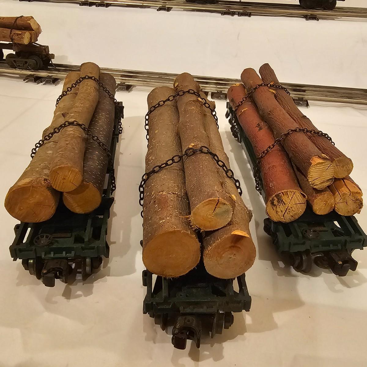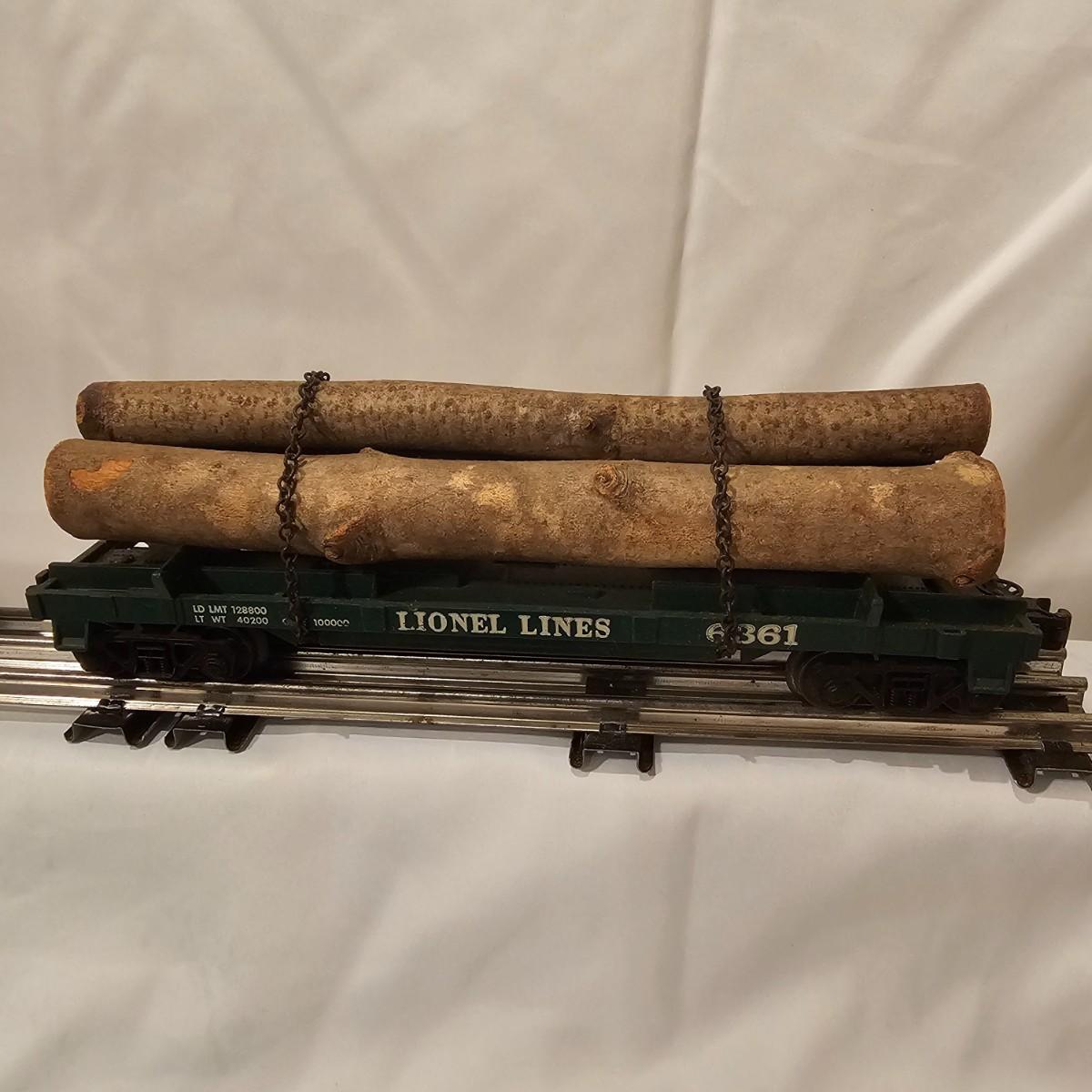 Captivating movement on this two truck Shay engine with side pistons and geared drive. One of several engines created for logging use in earlier times. Lackawanna Cola & Lumber #2 is a typical representation of these mighty units. This K-Line piece has digital whistle and bell, cruise control and synchronized puffing smoke. Engine started and ran on layout, other features not tested. 15" x 3" x 4.25"H. In original box, some wear and tear. Also included are five Lionel #6561 log cars with logs, two with boxes. 11" x 2" x 3"H. One smaller Westside Lumber log buggy with load, 7" x 3" x 3"H and Kadee style couplers. See photos for details. Please note that any price tag seen on an item was not put there by Sterling Transitions and does not reflect the current value of the item. Tracks in photos are not included with this lot, but available elsewhere in this auction. Shipping available.