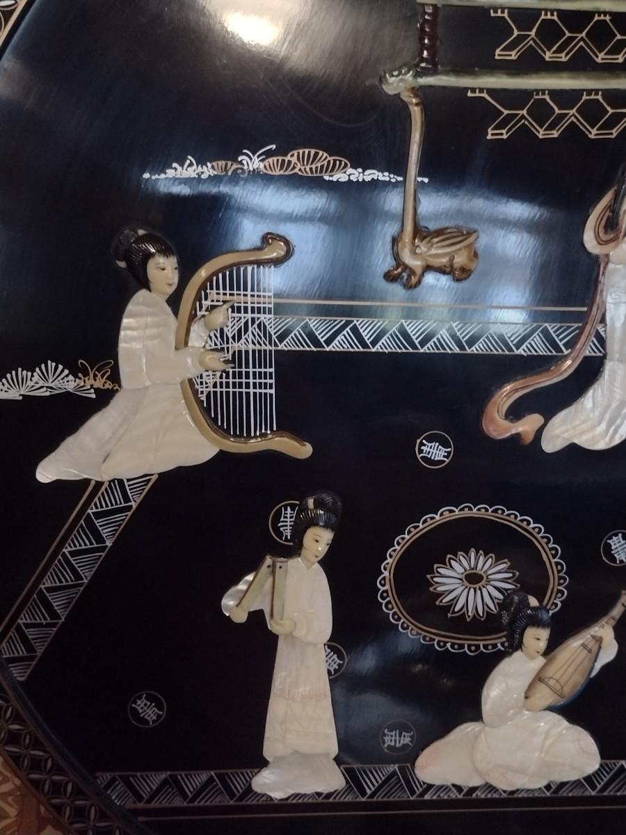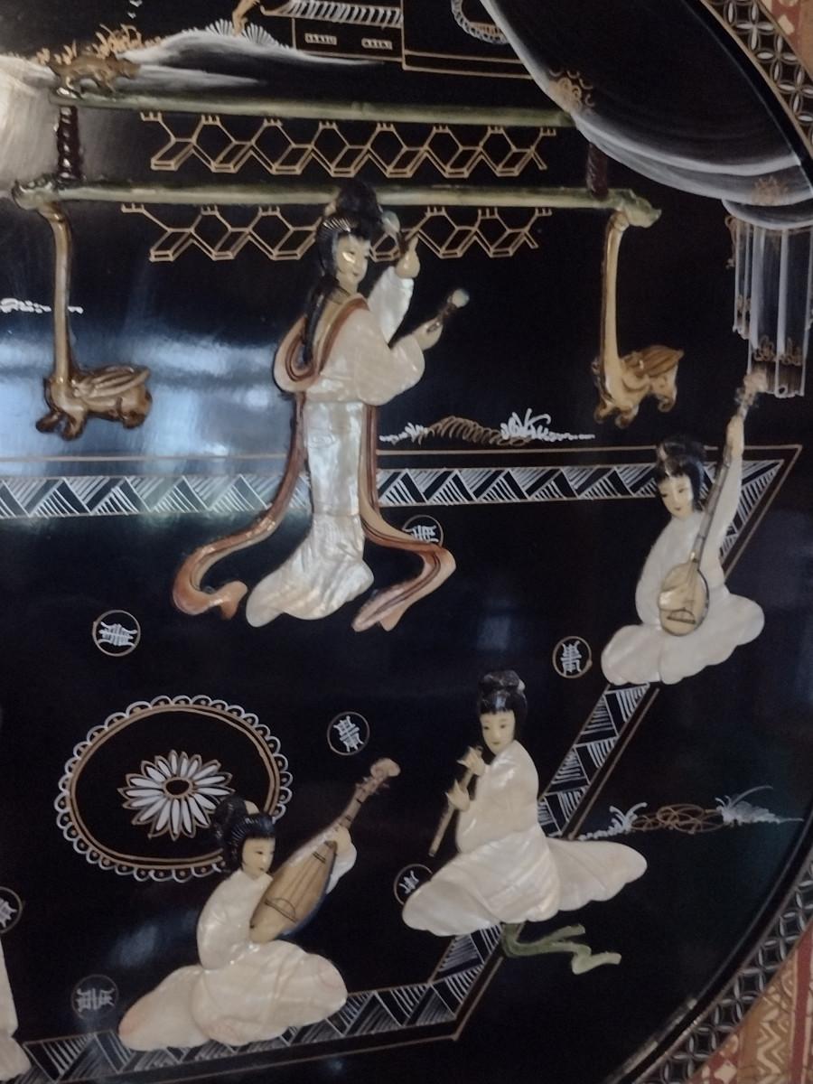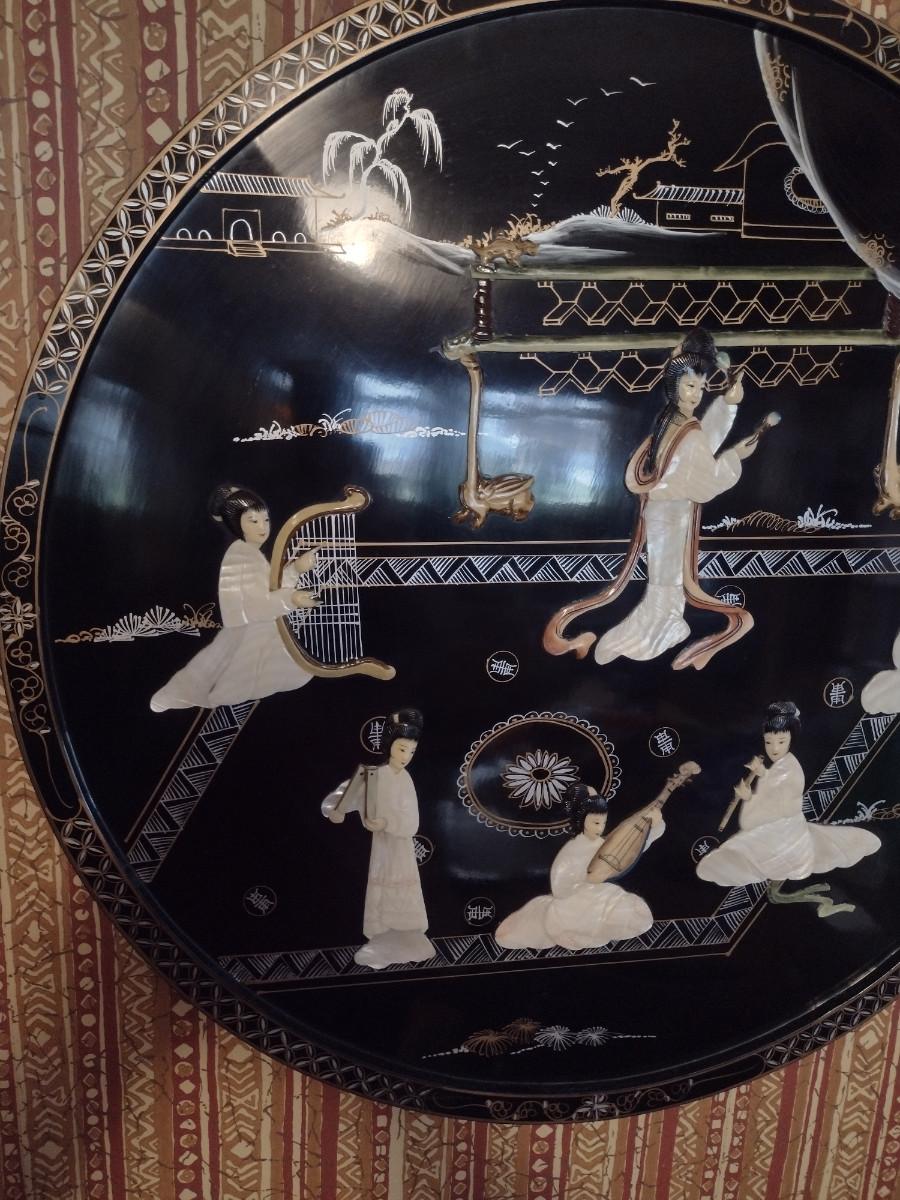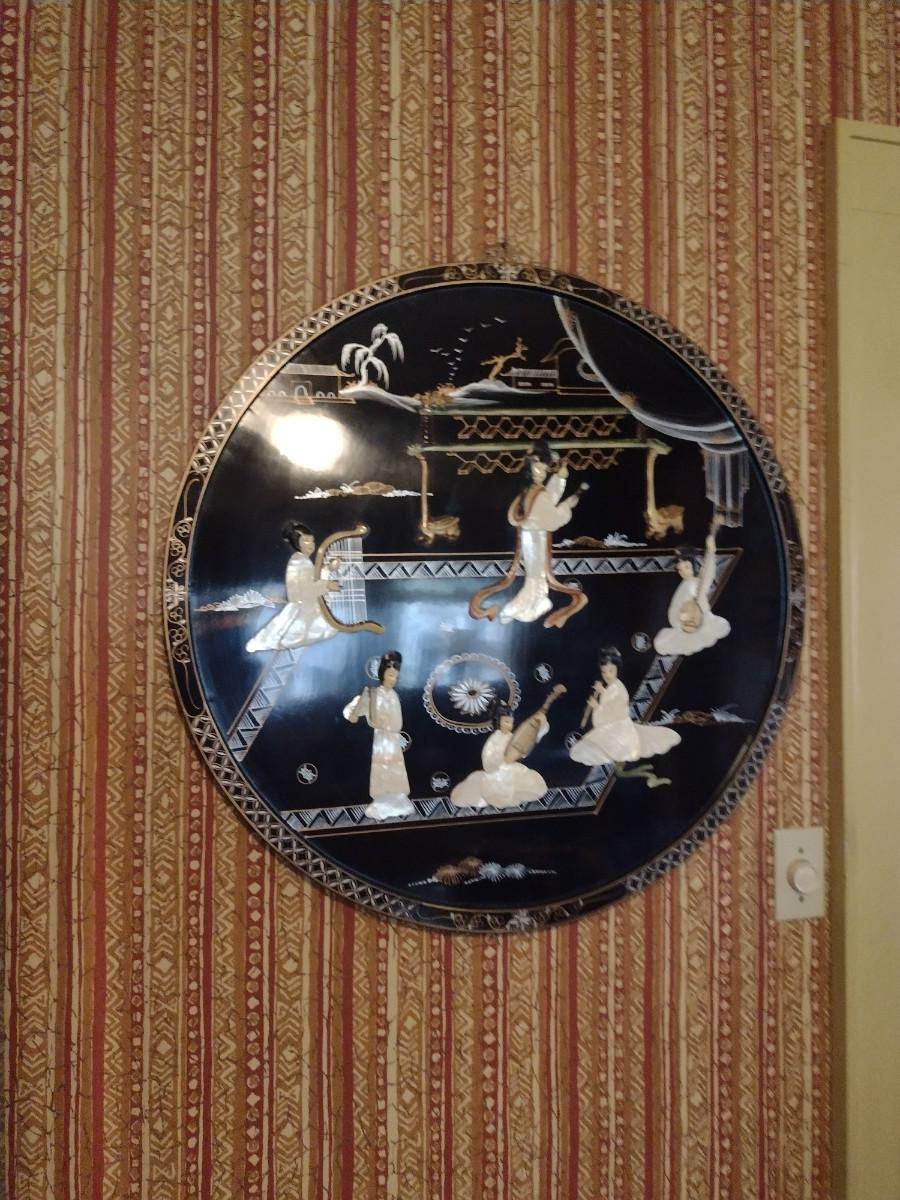Lacquer Finish Asian Theme Wall Decor with Mother of Pearl Inlay. Approx 29 1/2" in diameter.